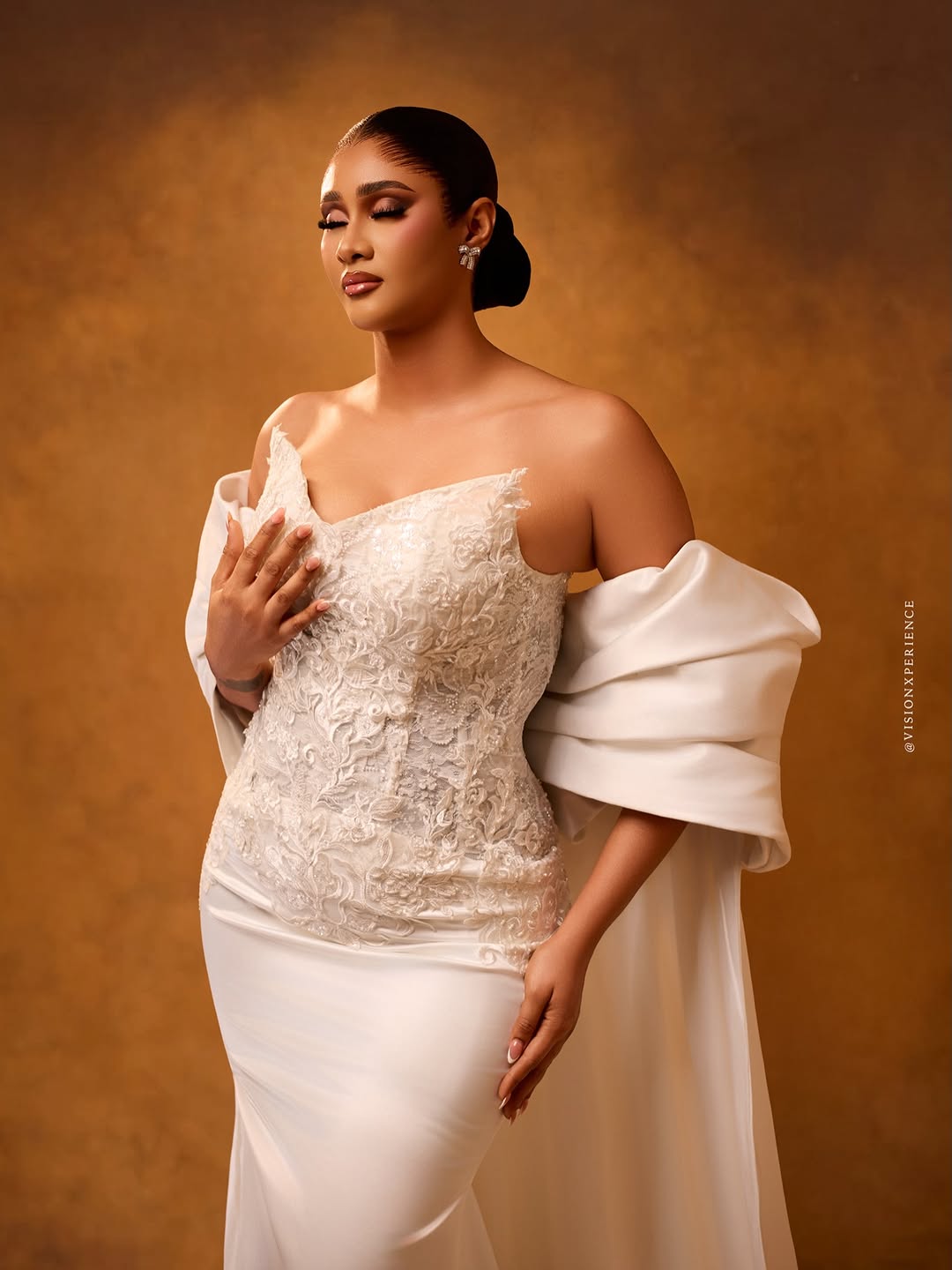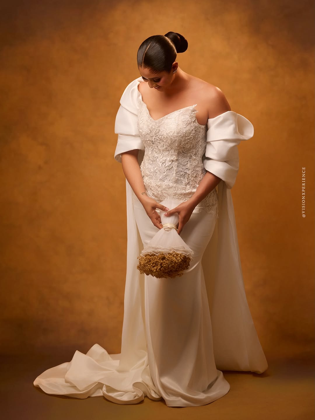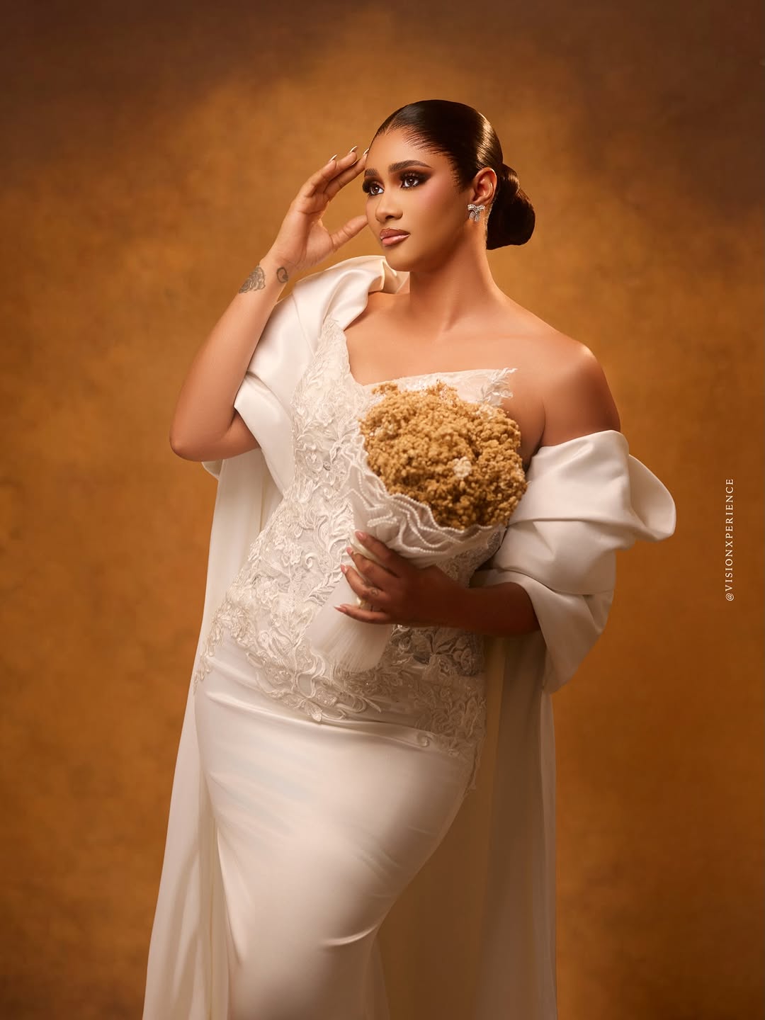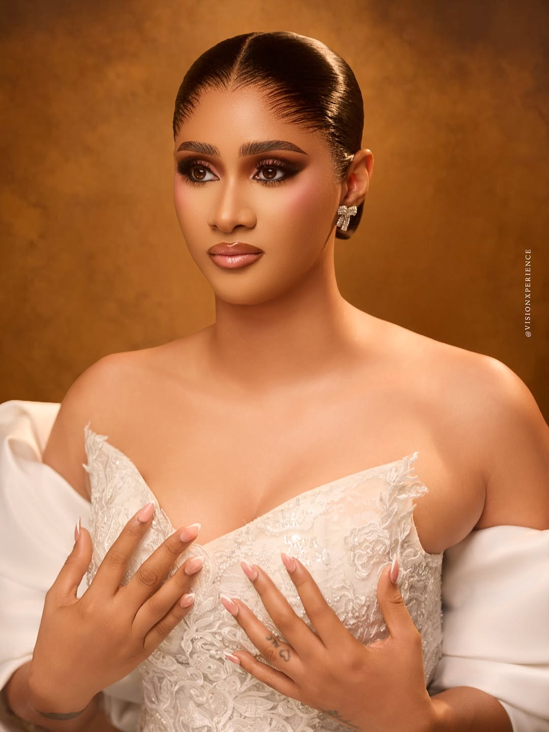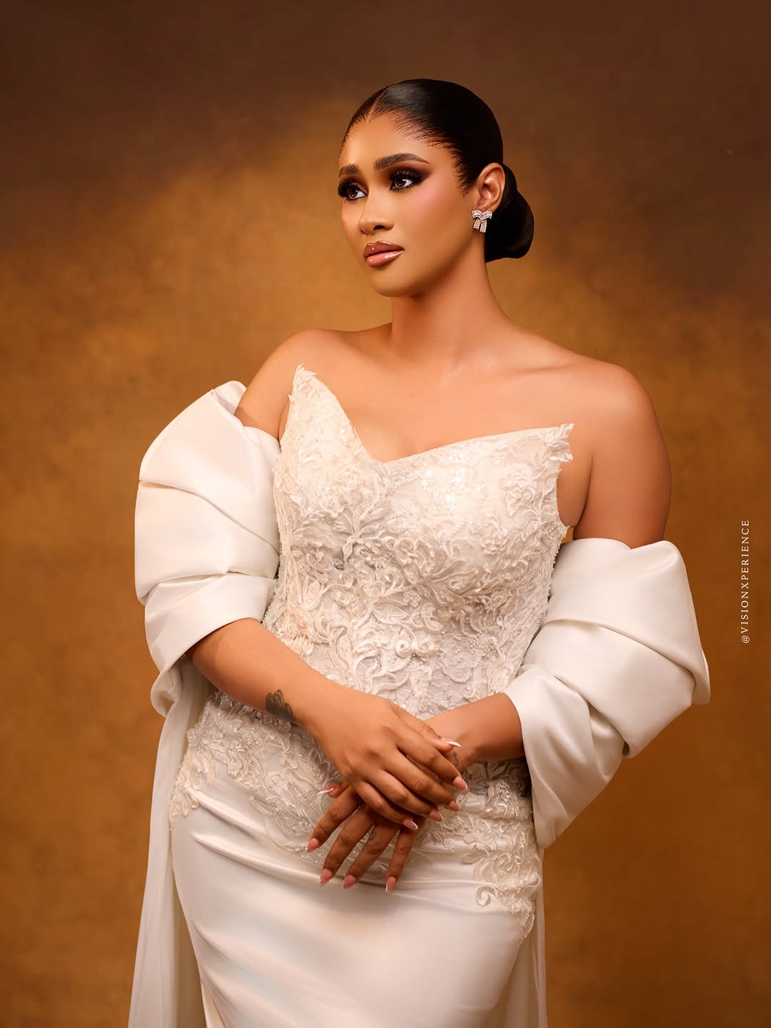 This stunning dress was designed by August Studio 1, and we can’t help but swoon over its pristine beauty. It features an intricately embellished bodice, a detachable flowing drape and a silk skirt… a true vision of timeless elegance. The stunning makeup is a mind-blowing, glamorous piece done by She Touch Trends. To add even more elegance to this beautiful look, Styled by Pricy sleeked the hair into a crisp, low, folded bun. All in all, this look is totally suited for brides who want to be poised to perfection, and if that’s you, then…you’re welcome! You can also find more beauty looks here.