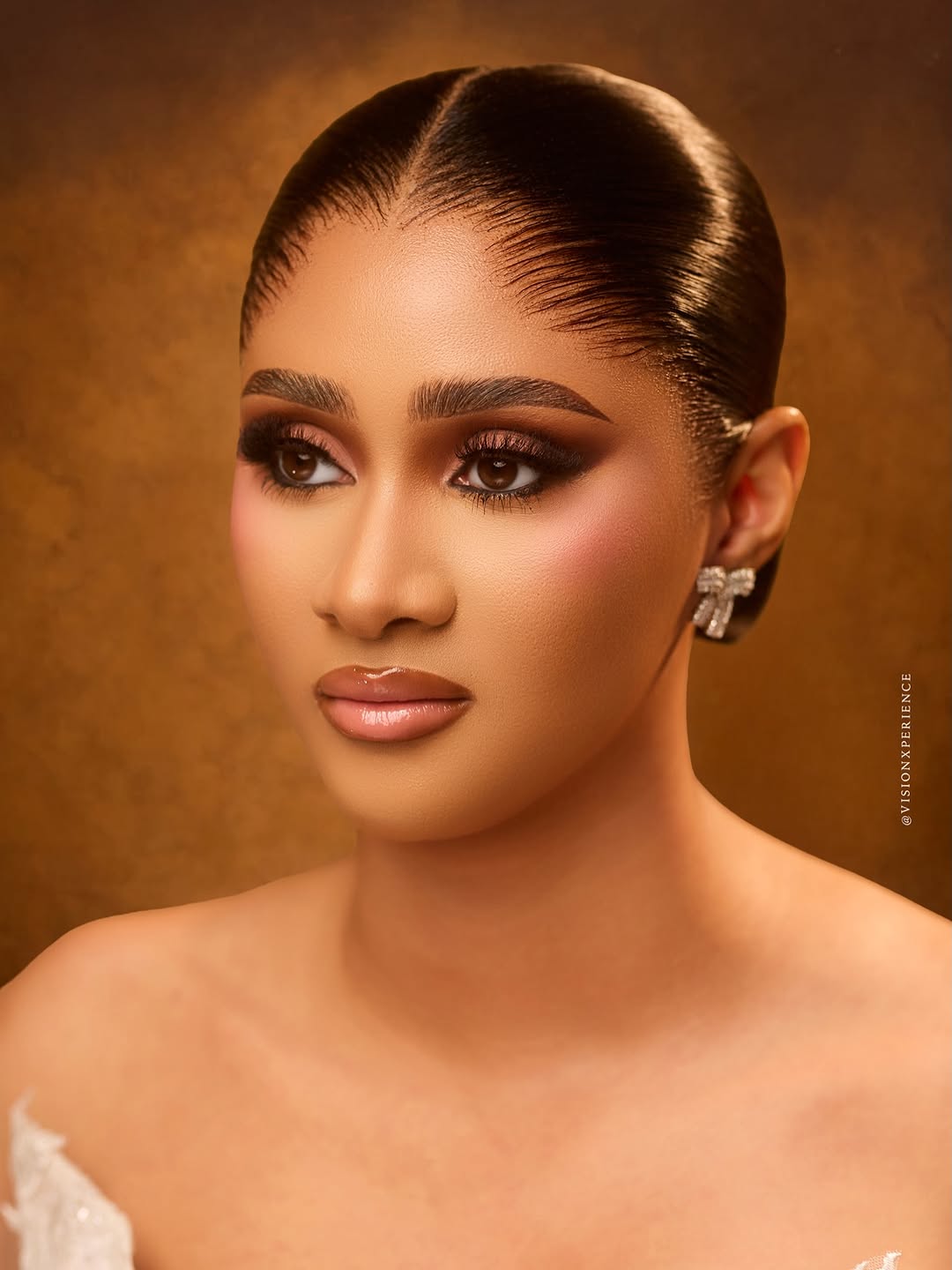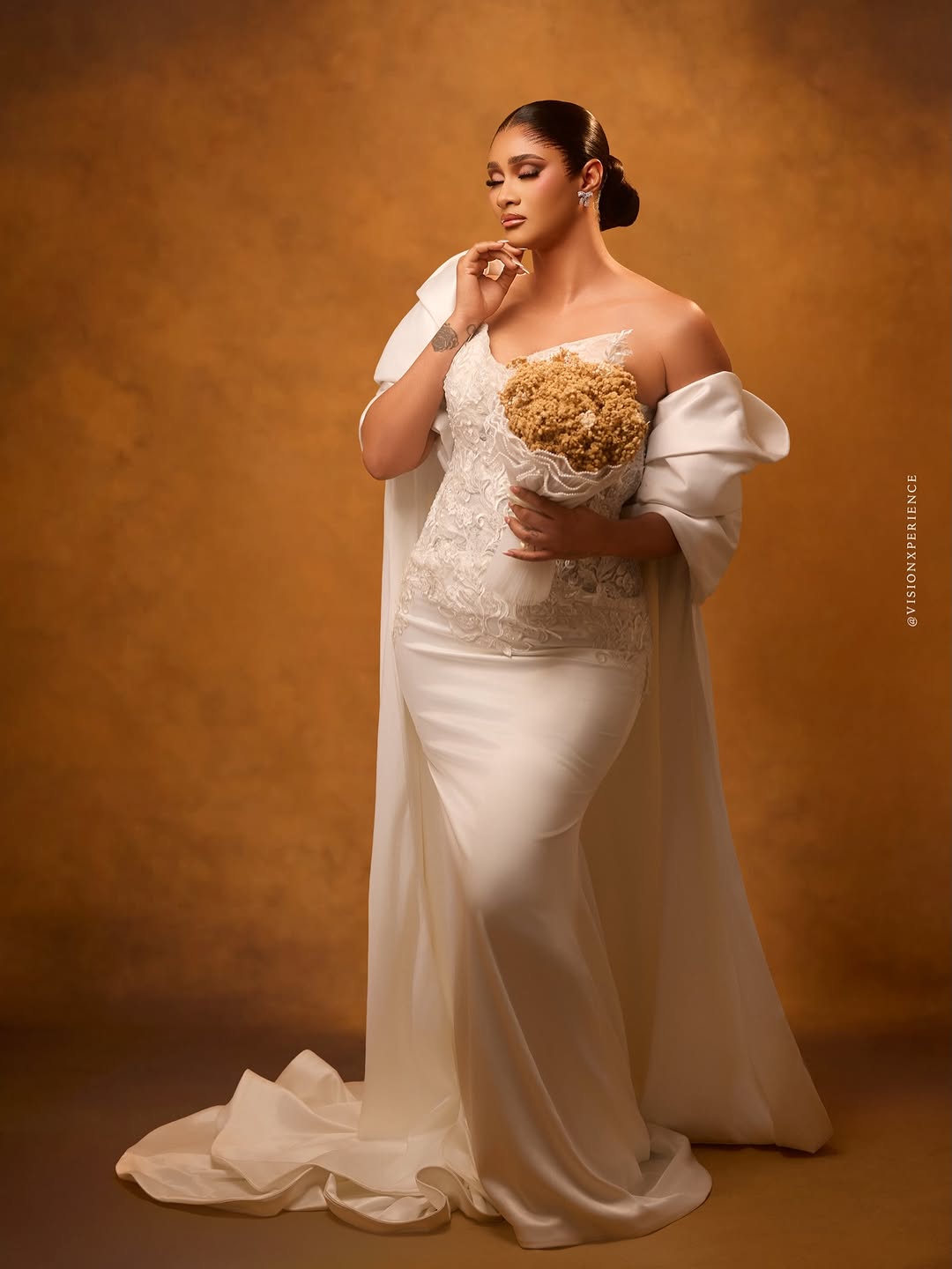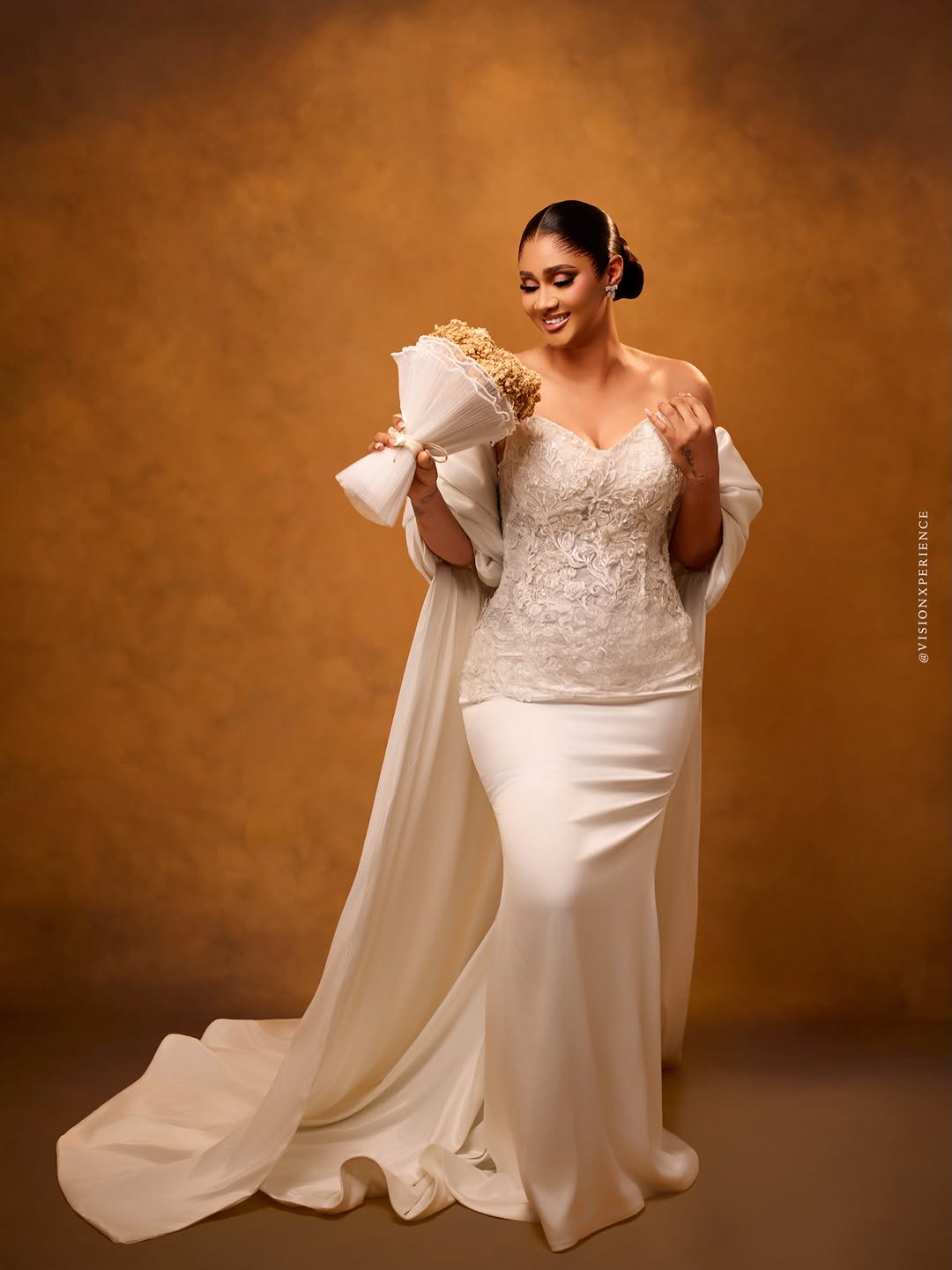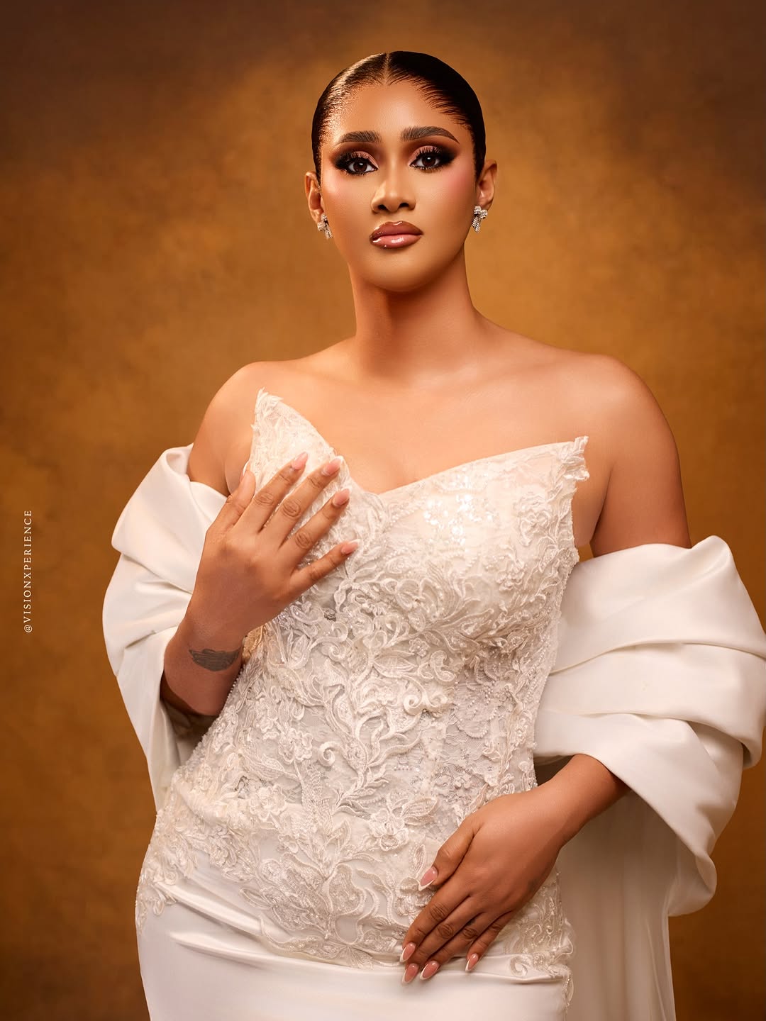 This stunning dress was designed by August Studio 1, and we can’t help but swoon over its pristine beauty. It features an intricately embellished bodice, a detachable flowing drape and a silk skirt… a true vision of timeless elegance. The stunning makeup is a mind-blowing, glamorous piece done by She Touch Trends. To add even more elegance to this beautiful look, Styled by Pricy sleeked the hair into a crisp, low, folded bun. All in all, this look is totally suited for brides who want to be poised to perfection, and if that’s you, then…you’re welcome! You can also find more beauty looks here.