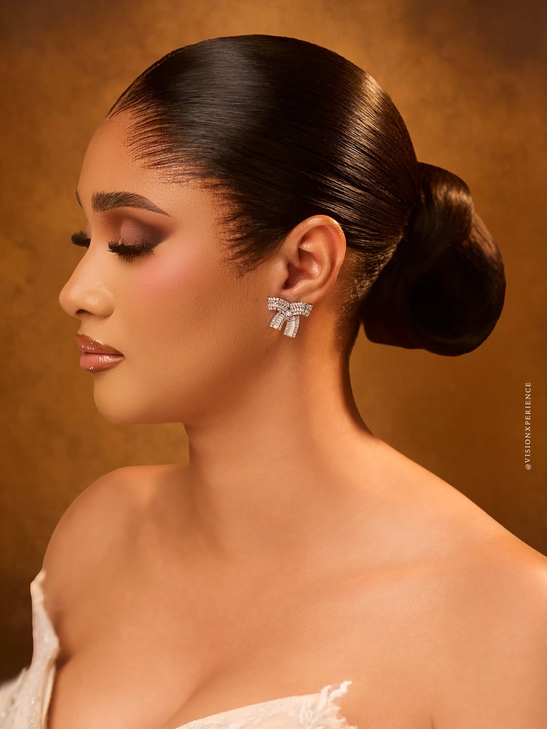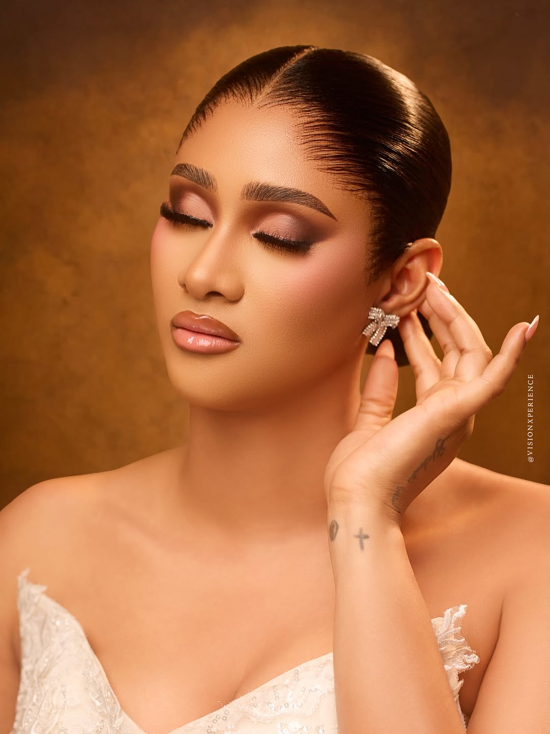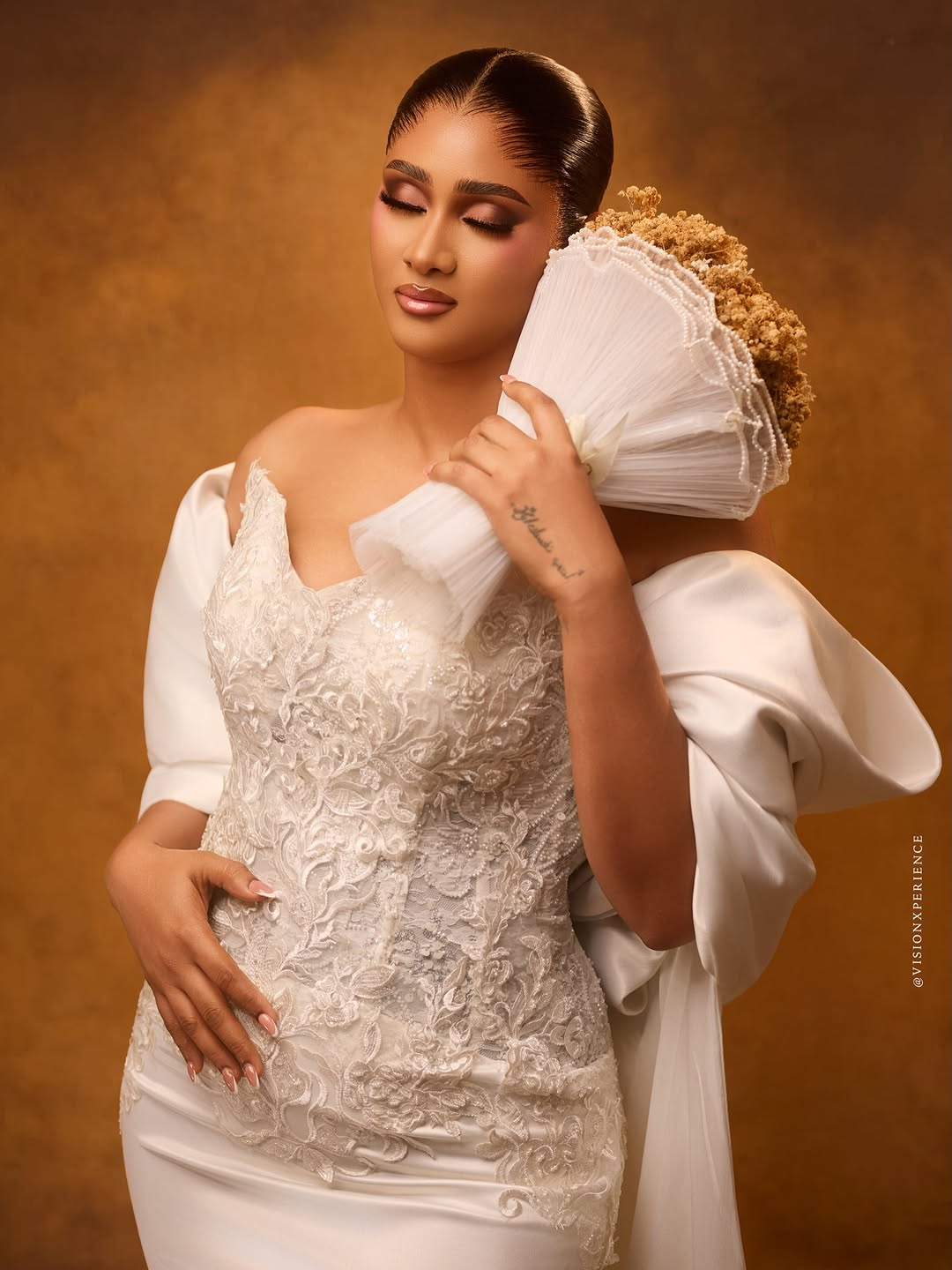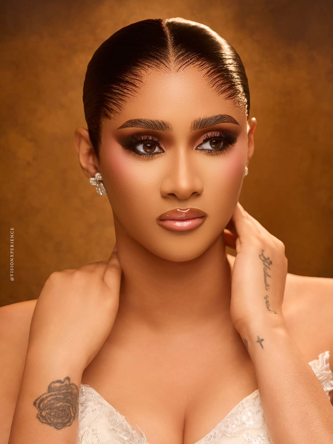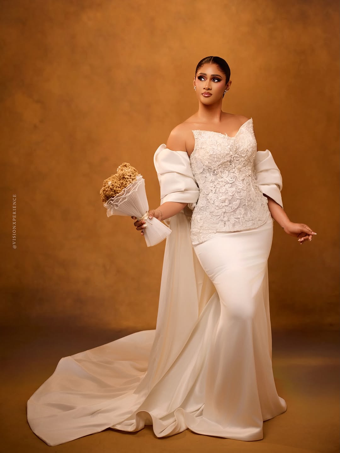 This stunning dress was designed by August Studio 1, and we can’t help but swoon over its pristine beauty. It features an intricately embellished bodice, a detachable flowing drape and a silk skirt… a true vision of timeless elegance. The stunning makeup is a mind-blowing, glamorous piece done by She Touch Trends. To add even more elegance to this beautiful look, Styled by Pricy sleeked the hair into a crisp, low, folded bun. All in all, this look is totally suited for brides who want to be poised to perfection, and if that’s you, then…you’re welcome! You can also find more beauty looks here.
