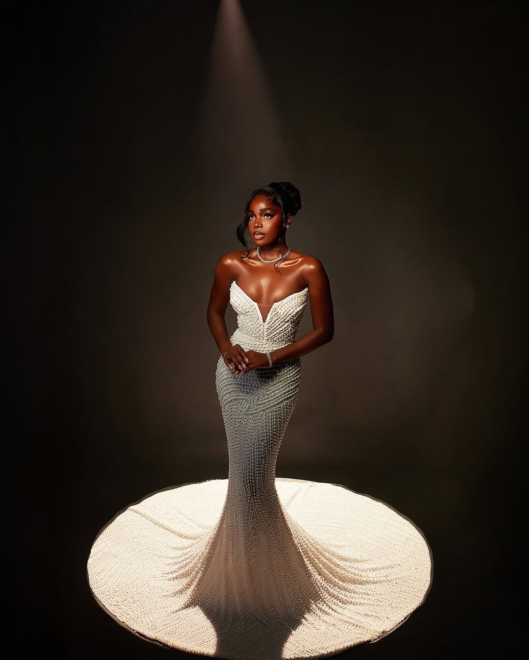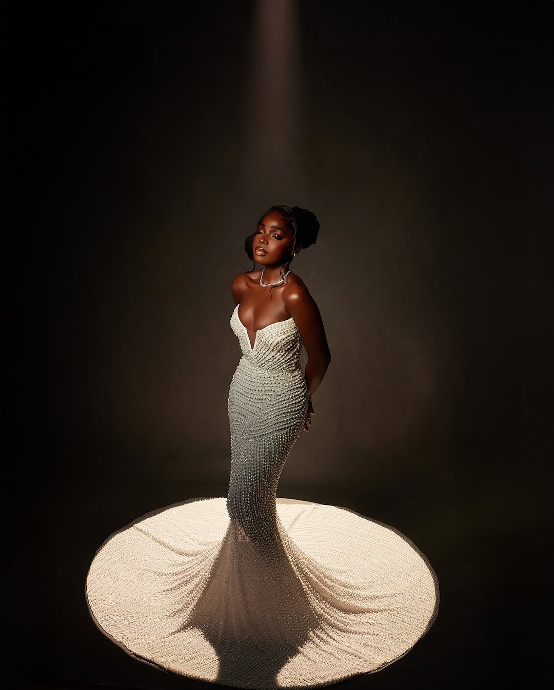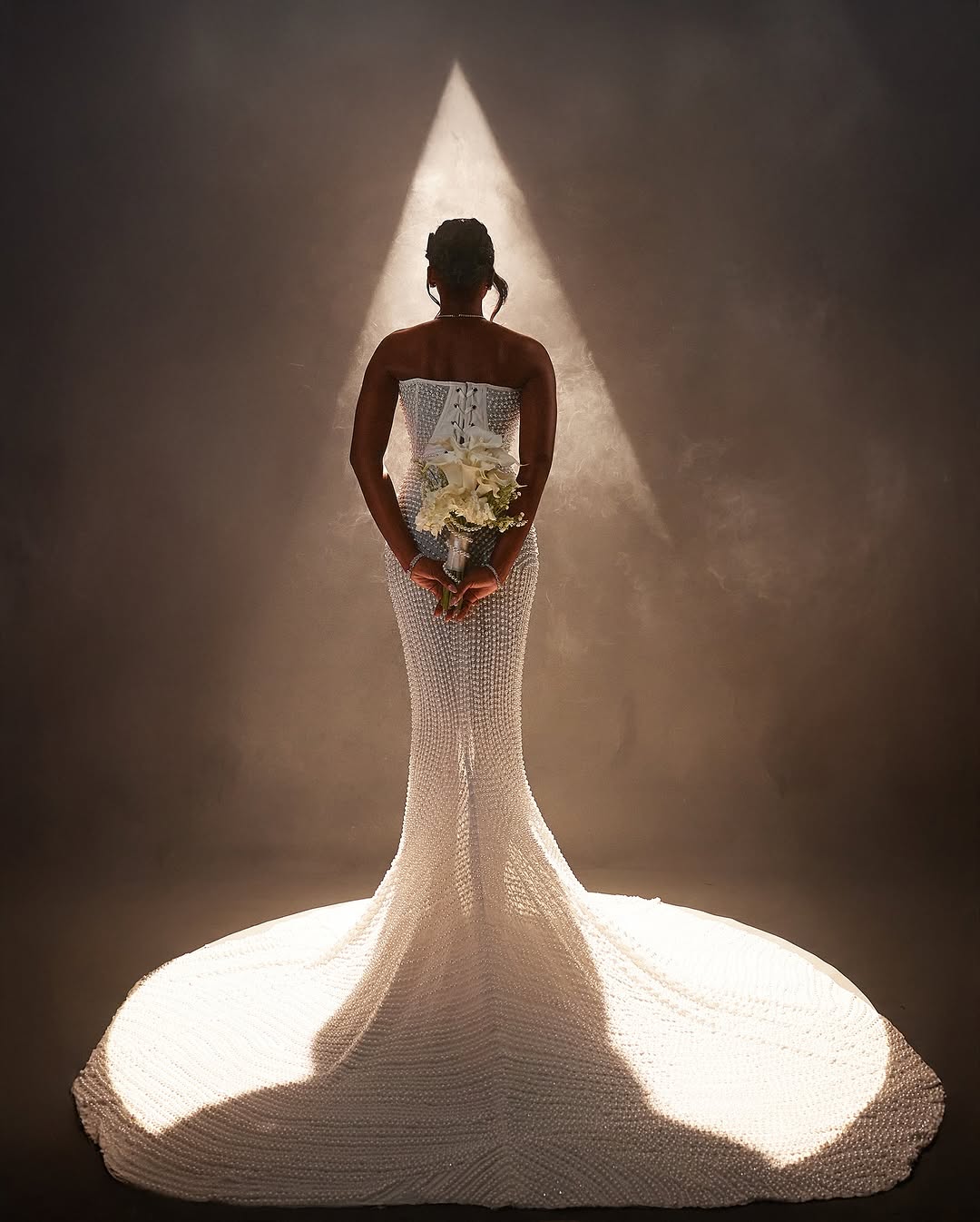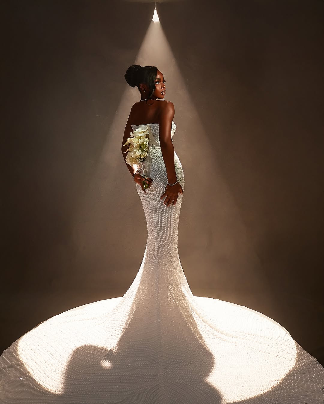 Bejuin designed this breathtaking sleeveless dress, and their expert craftsmanship absolutely came alive through every detail. The whole dress is covered in pearls, even down to the flowing skirt…it’s simply amazing! Styled by Mo crafted the hair into a high bun with tendrils framing the face on both sides, while Divas by Kofo added their magic touch to this ensemble with a pretty nude glam. One word for this stunning look? Divine! If you’re a bride-to-be who wants to look absolutely charming and elegant on your big day, then this look can effortlessly do the trick. You can also find more beauty looks here.