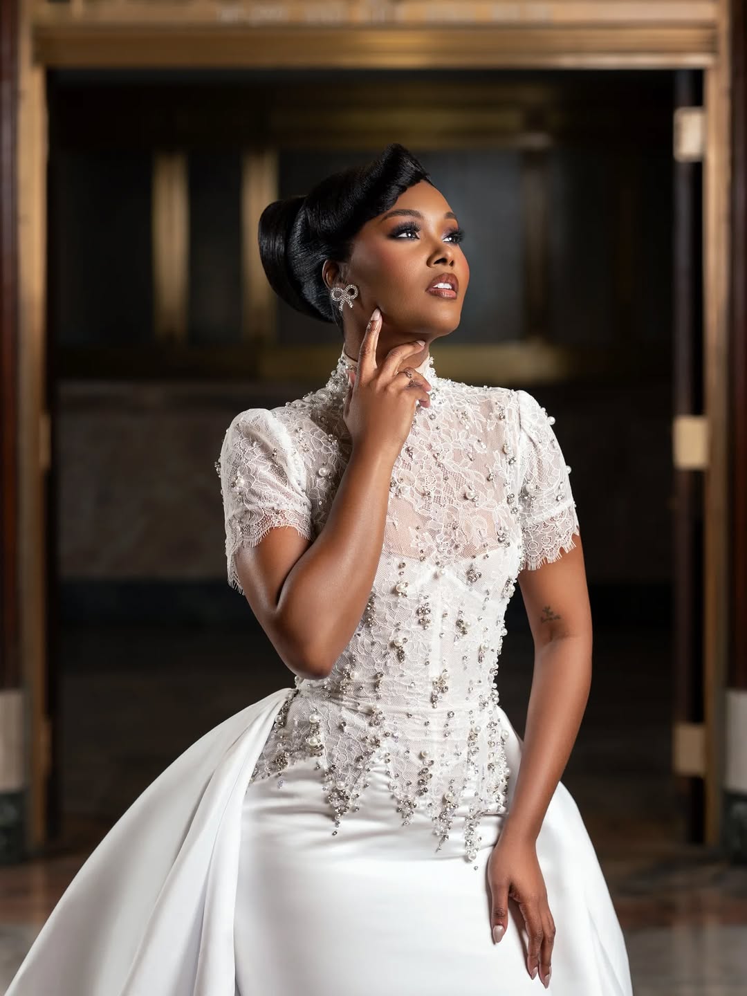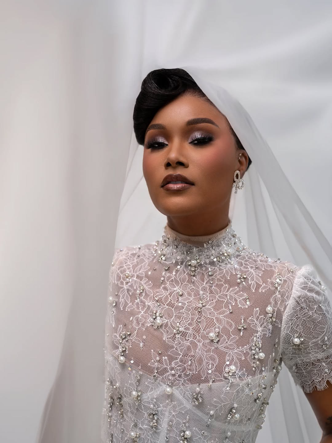 This stunning vintage-style dress by Dark Made is a great option to fulfil your desires. Featuring a covered lace bodice with pearls, a turtle neck, and a satin detachable train, this look screams pure luxury. Beauty by Eva brought a striking charm to this look with the bold glam, while Hair Guru Studio tapped into what fits this look best and crafted an elegant hairstyle, one that stays in a bun and allows us to admire the charm of the dress fully. Imagine walking down the aisle in something this gorgeous. If you are a bride-to-be who is just as mesmerised by this look as we are, then it could be your perfect choice. You can also find more beauty looks here.