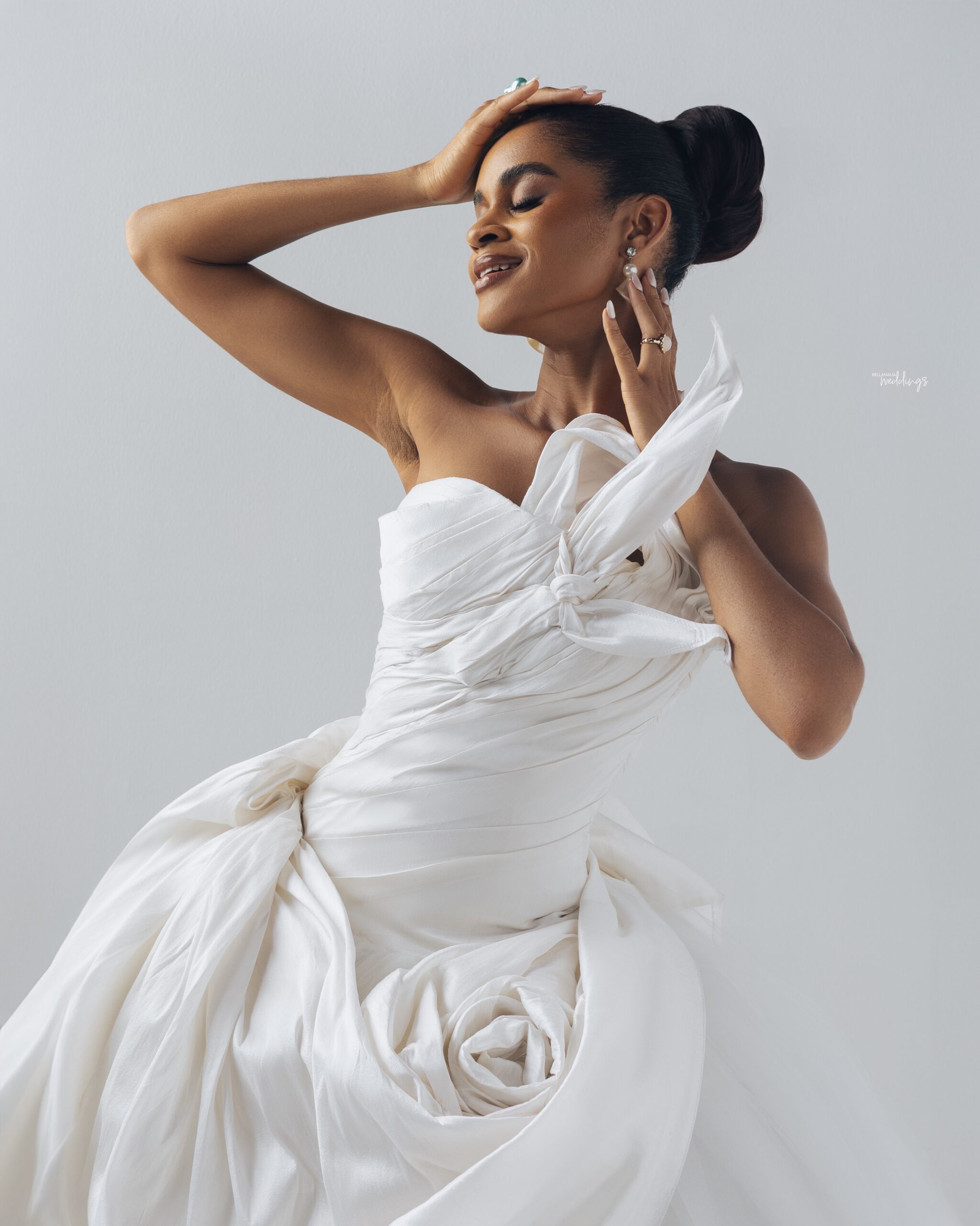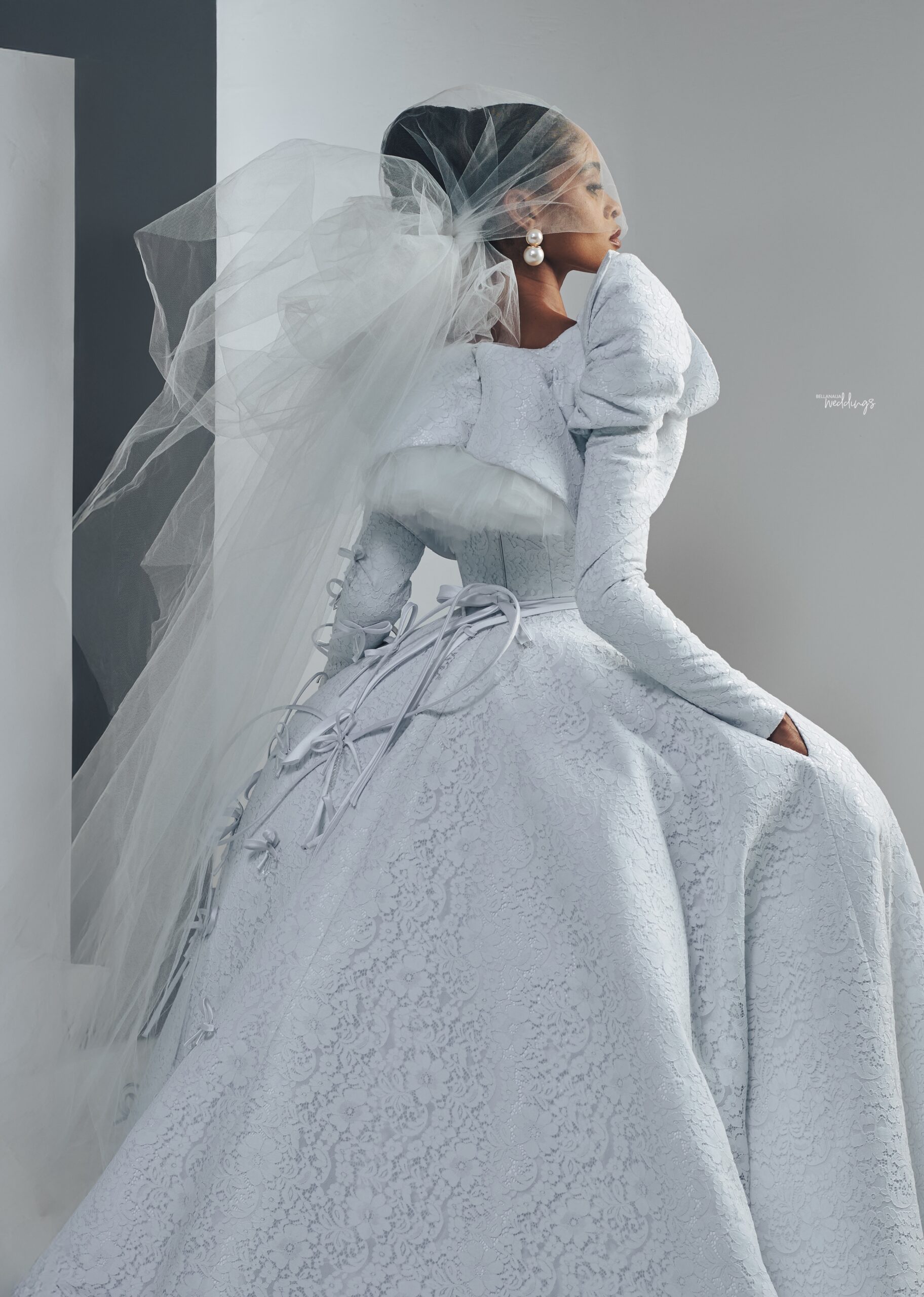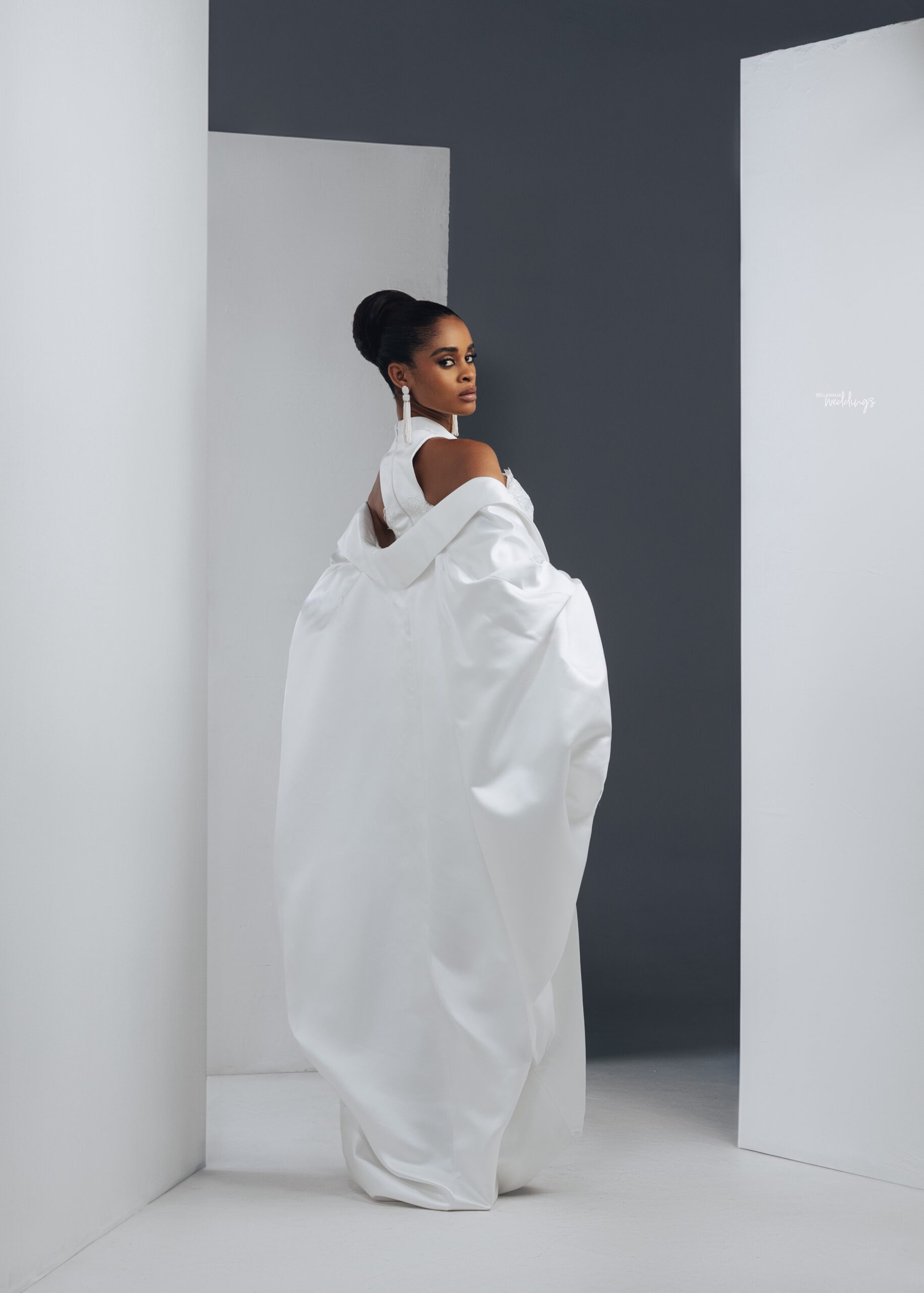 When I design wedding dresses, I’m constantly pushing for a kind of simplicity that is very rigorous yet seemingly controlled. I think a wedding dress can be the closest item that actually mirrors a woman’s essence, her convictions, her disposition, and the circumstances surrounding her existence within the framework of the love she shares with her partner. If a bride has low self-esteem, you’d see it from her choices, and vice versa for an unabashedly confident bride. A wedding dress is the purest card of honesty/self-love and should not be confined to the excesses of popular culture or trend. ‎‎Egovinu’nwa is a bridal edit that contains 5 dresses surrounding the life of Obiageli, who is a symbol of Ohlanna bu Zikora’s quintessential bridal mix. It’s a cross-section of dresses representing the extensive vision and technical expertise of the brand vis, with innovative pattern cutting, sculptural eloquence, elegant drapes, generous textural-led appliques, etc. ‎All pieces are available to be modified to the varying taste levels of brides.