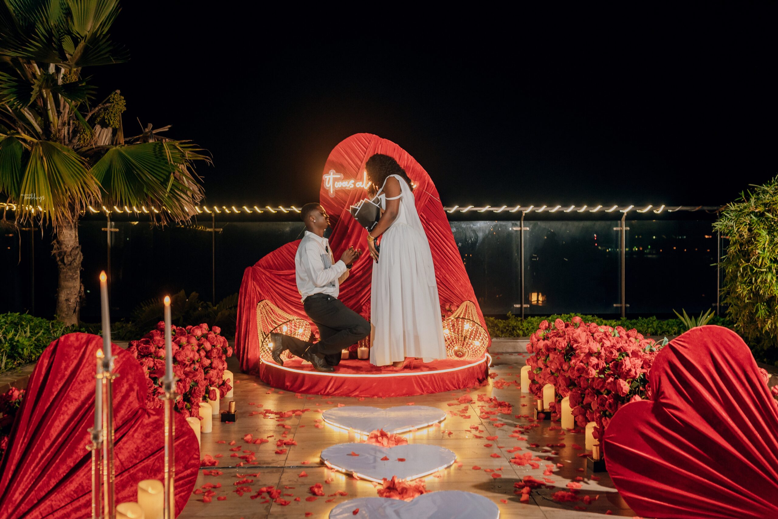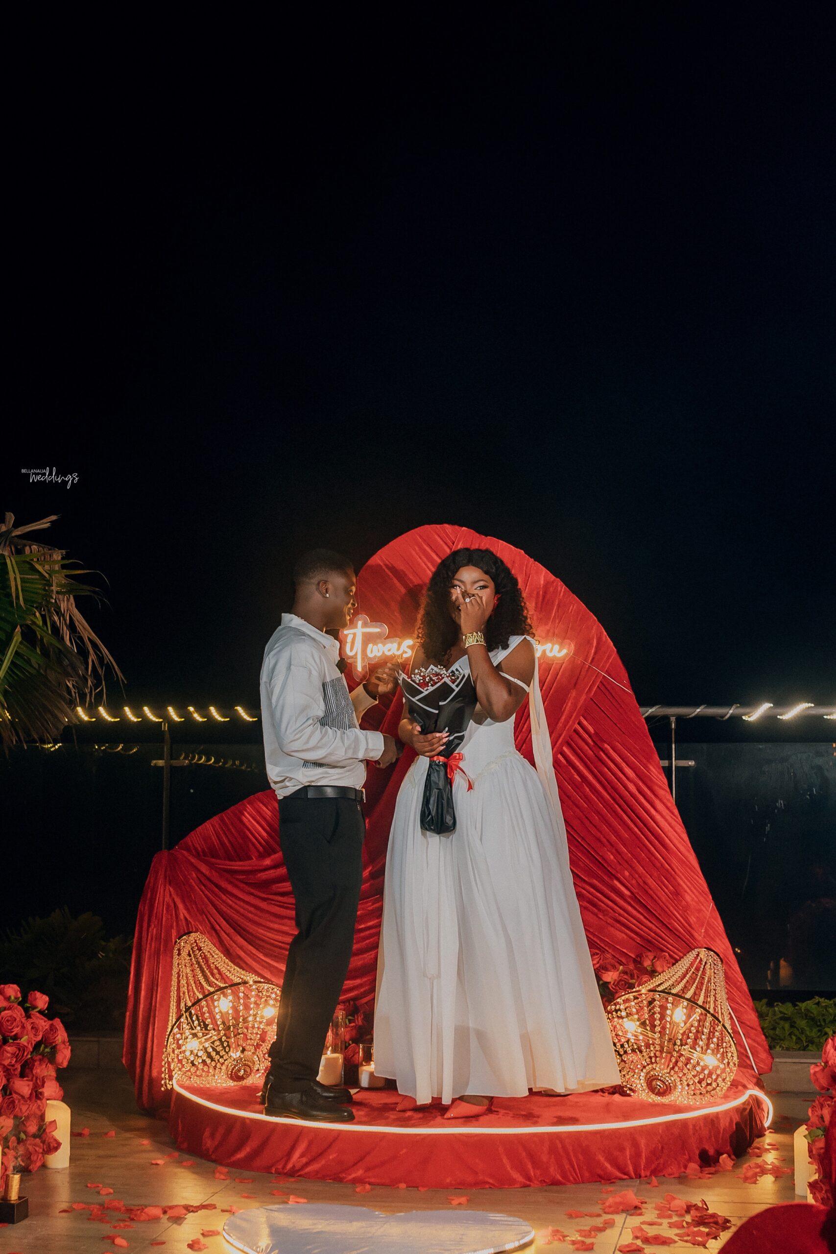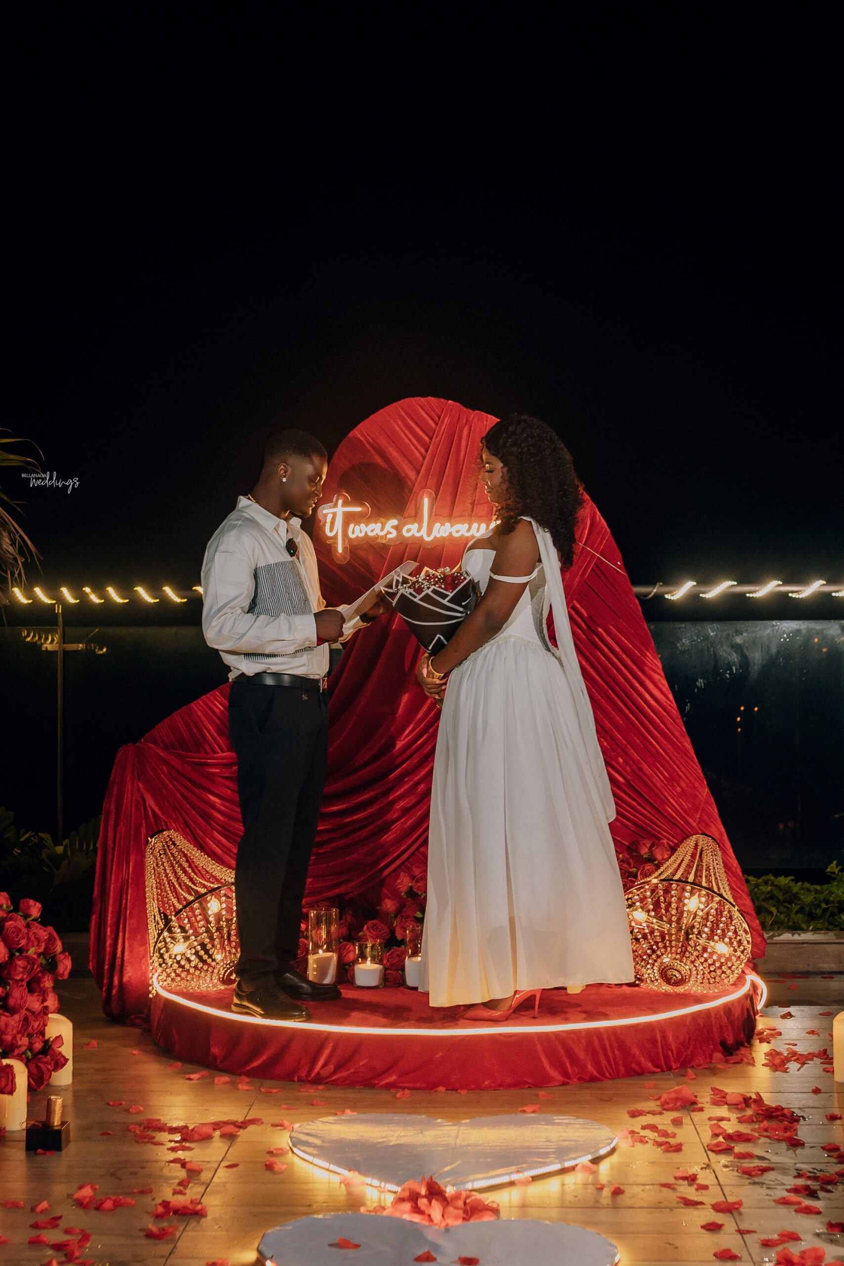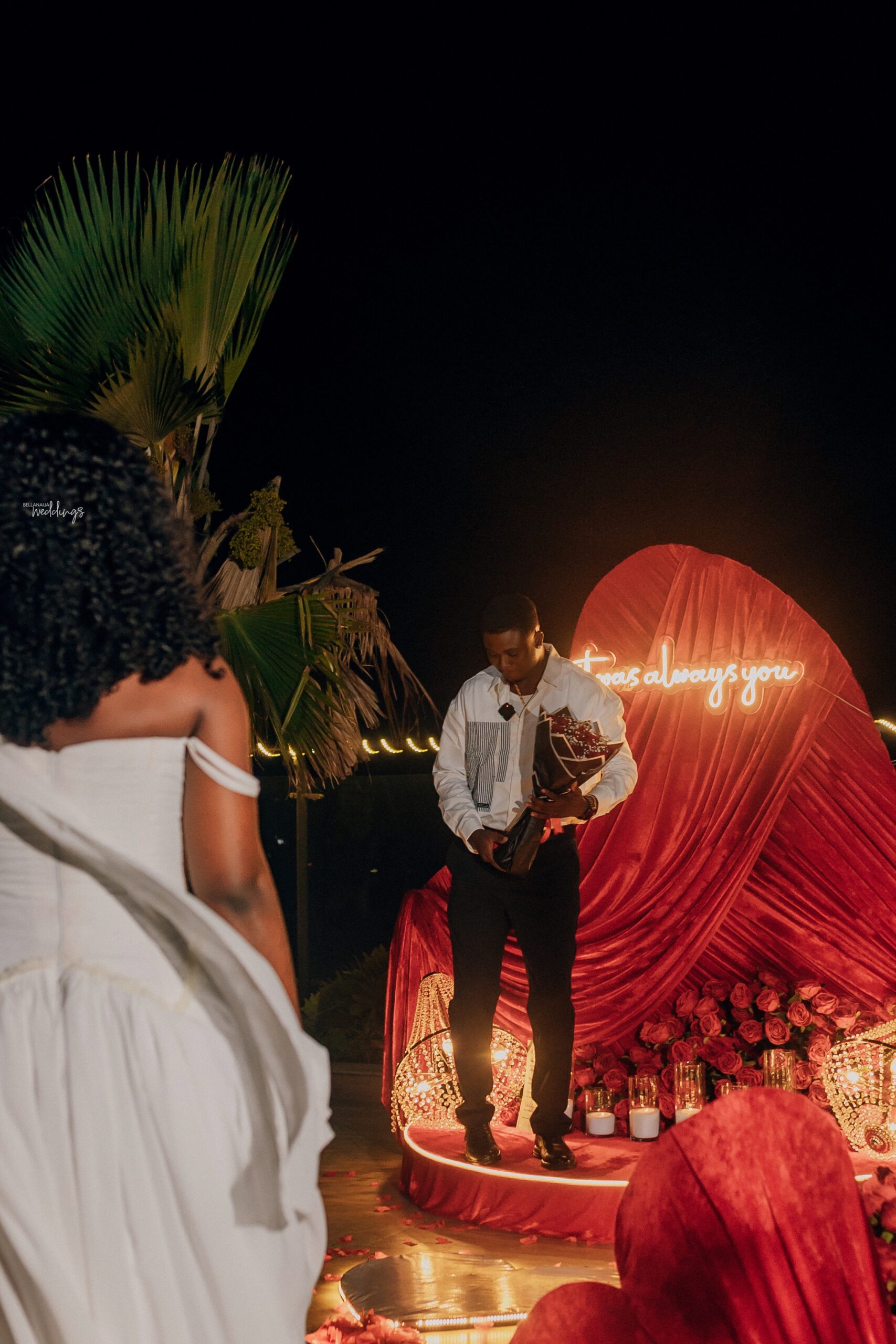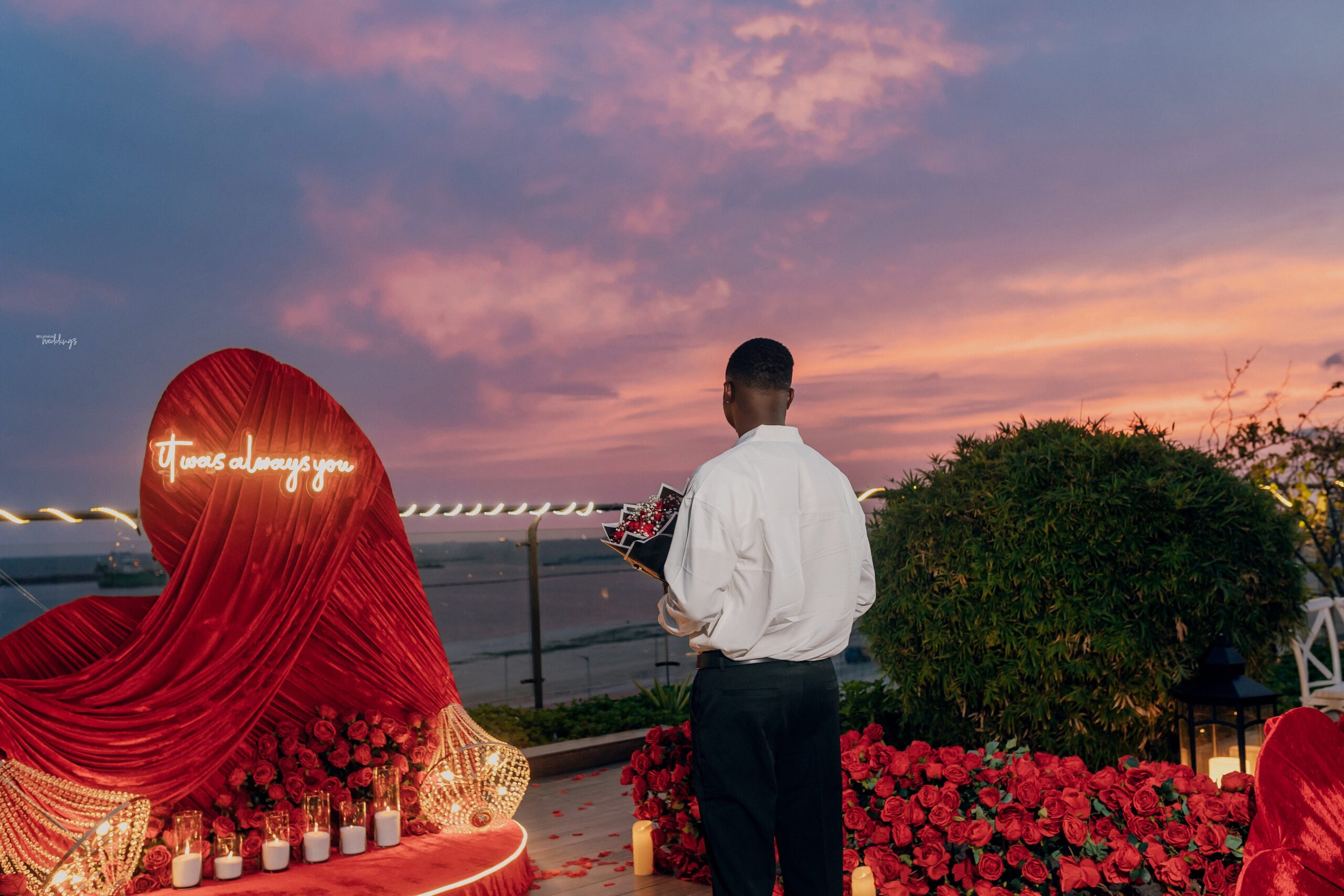 That very day they met, Esther had taken a sick leave from work and had to get a few things from the mall. As fate would have it, Oluwatosin also dropped by at the same mall. When he saw her, he instantly felt a connection and approached her. That simple conversation they had has now led them to seal their love forever! Against the charming views of the sea, a beautiful red decor lay in wait. Then Esther stepped in, completely shocked! Oluwatosin got down on his knee and asked her to make him the happiest man alive, and she said yes! We can see it all beautifully unravel in their stunning proposal photos. Now wedding bells are ringing, and it’s just all surreal to take in that their forever is about to take flight. 😍