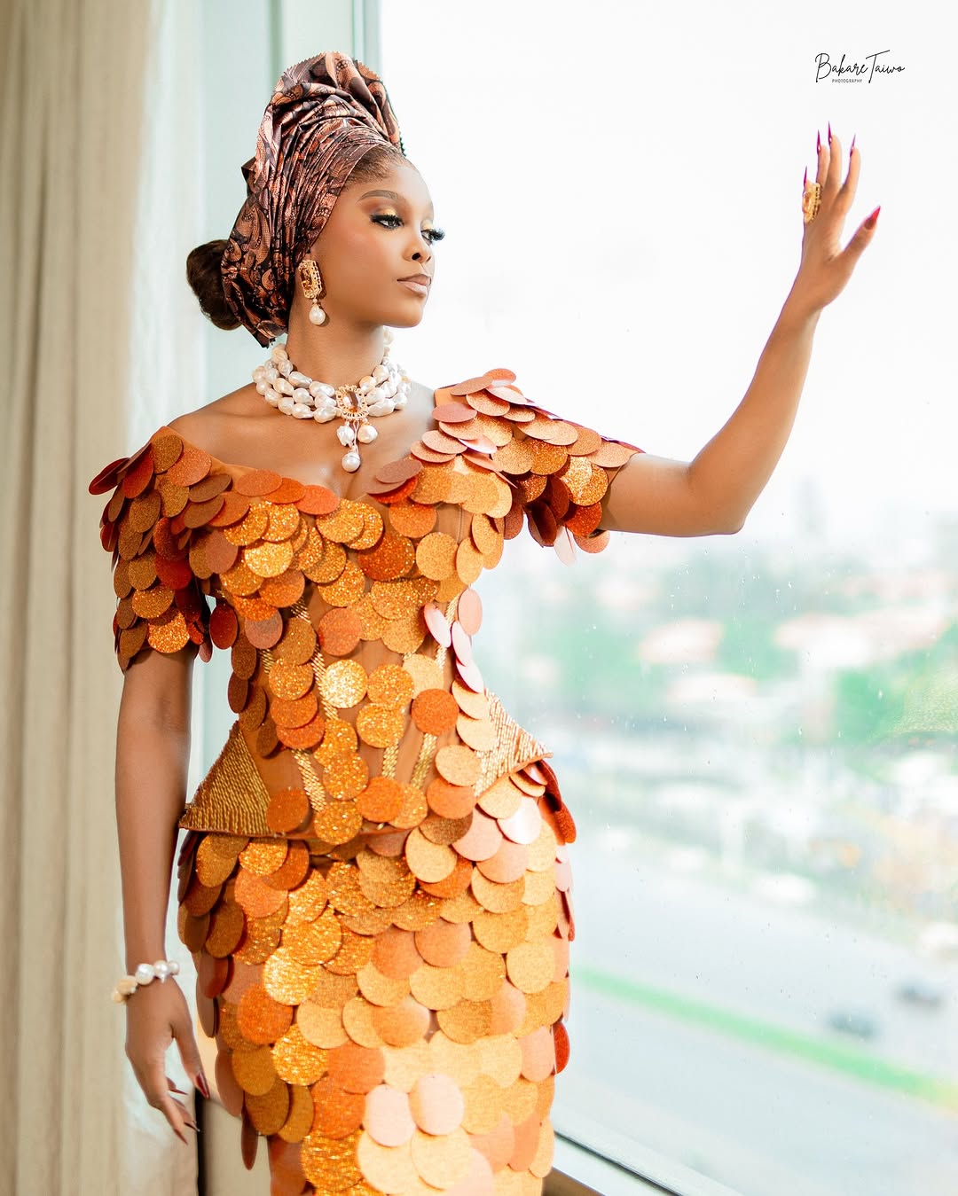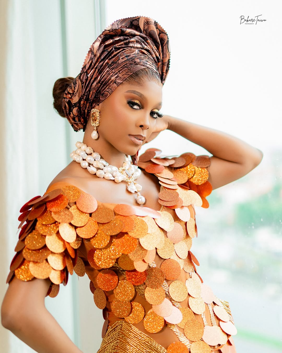 This Yoruba traditional bridal look, designed by Adorn by Gio, is what we are gushing about today because it’s absolutely fabulous! Covered completely in shiny pailettes, this luxurious dress is a pure definition of eye-catching lustre. Oteniara Makeovers delivered a makeup look that is just as glowy as the dress, featuring eyes that match the golden colour and a nude finish. Then came JMK Fabrics, perfecting the ensemble with the regal traditional touch added by the well-pleated sego gele. This is the definition of cultural bling in a look! The impeccable craftsmanship brought this stunning look to life. Trust us when we say it will completely add all the sparkle and shine you need for your big day slay!