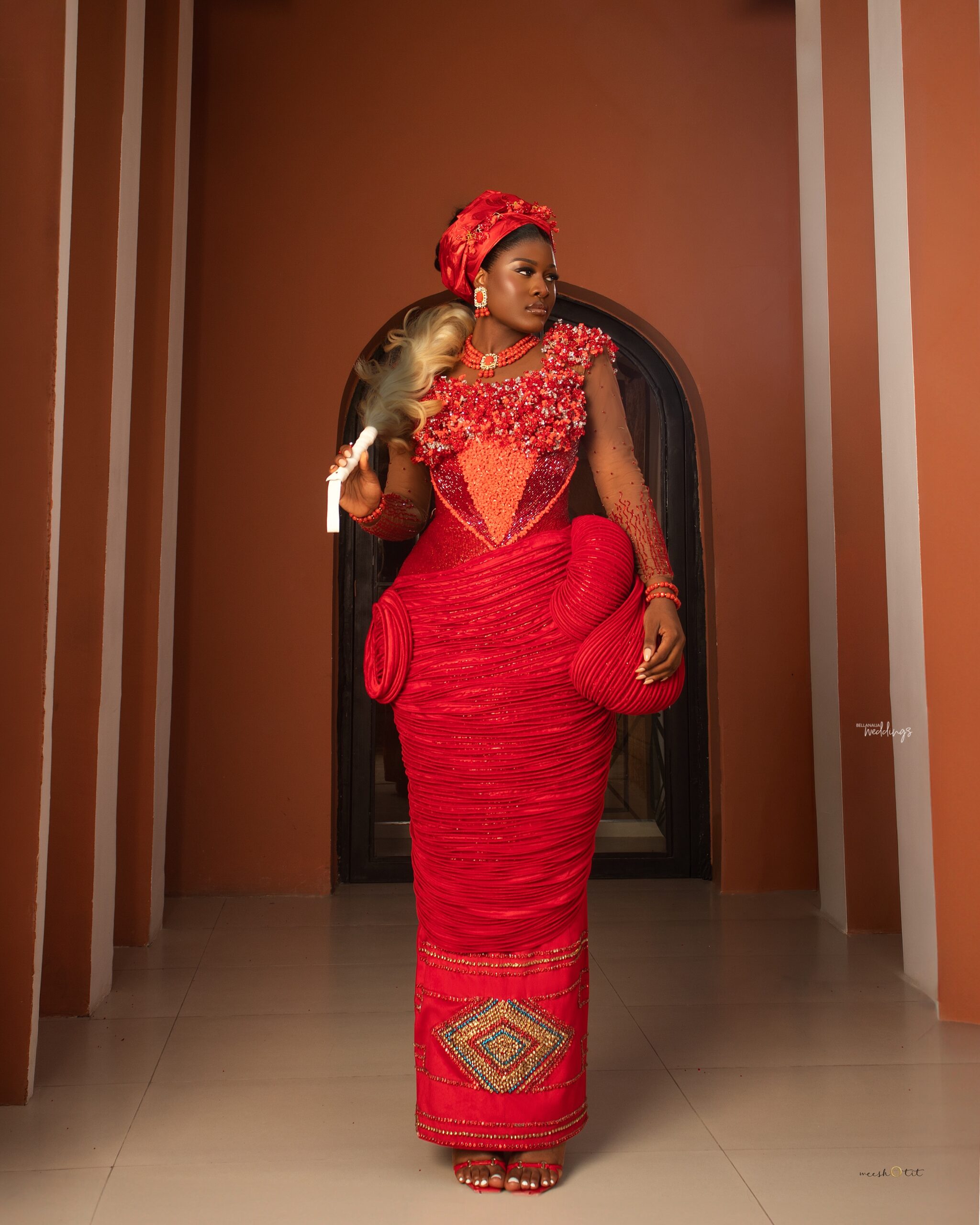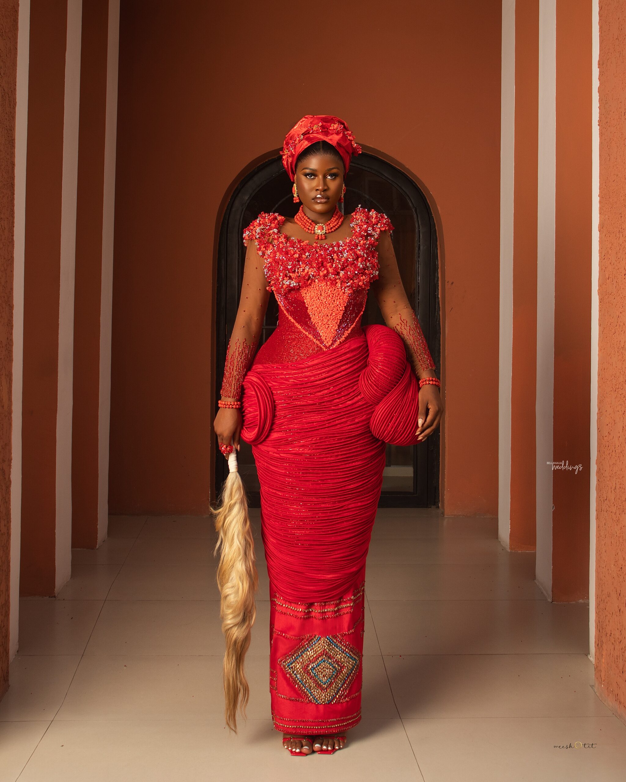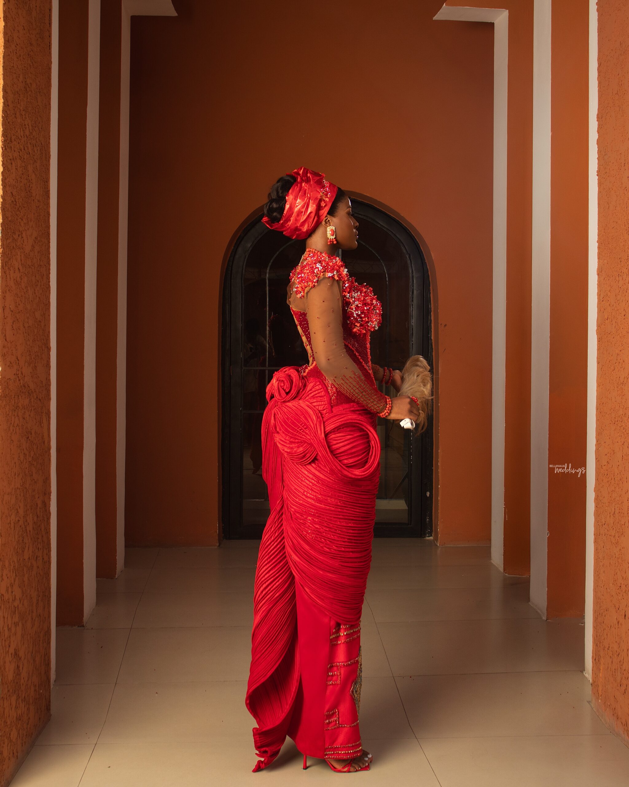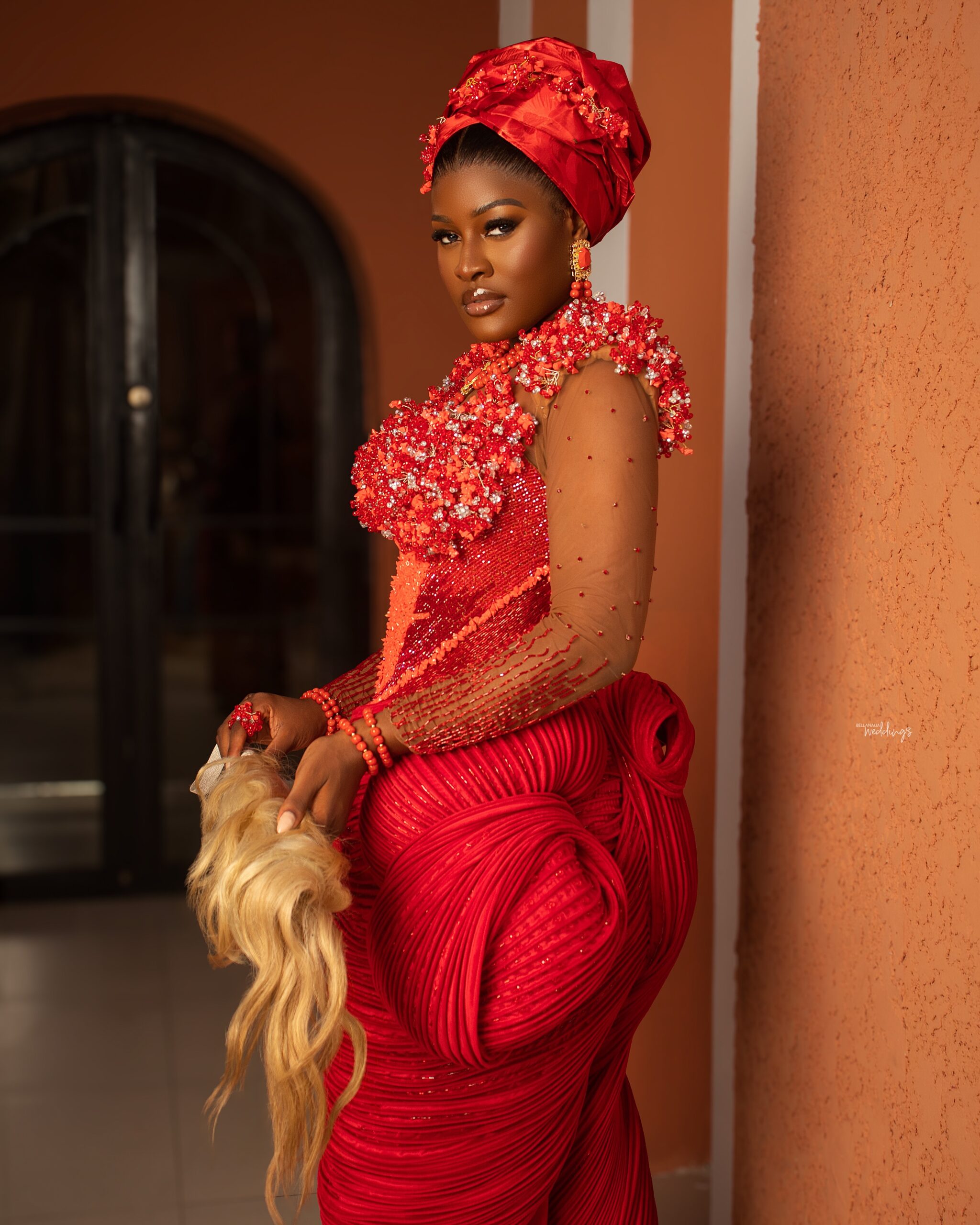This piece redefines traditional Igbo/Edo bridal wear through sculptural precision and rich craftsmanship. The bodice is meticulously hand-embellished, blooming with intricate beadwork that frames the neckline with both delicacy and strength. The silhouette is intentional – exaggerated hips that command presence, honouring tradition while pushing the boundaries of modern form. The wrapper is engineered with layered textures and controlled pleating, creating depth, movement, and undeniable structure. Coral beads stand as more than adornment – they speak of identity, status, and lineage. Every element, from the headpiece to the finishing details, is curated to embody regal elegance. At House of Vieve, this is more than a dress. It is heritage, reimagined into art.