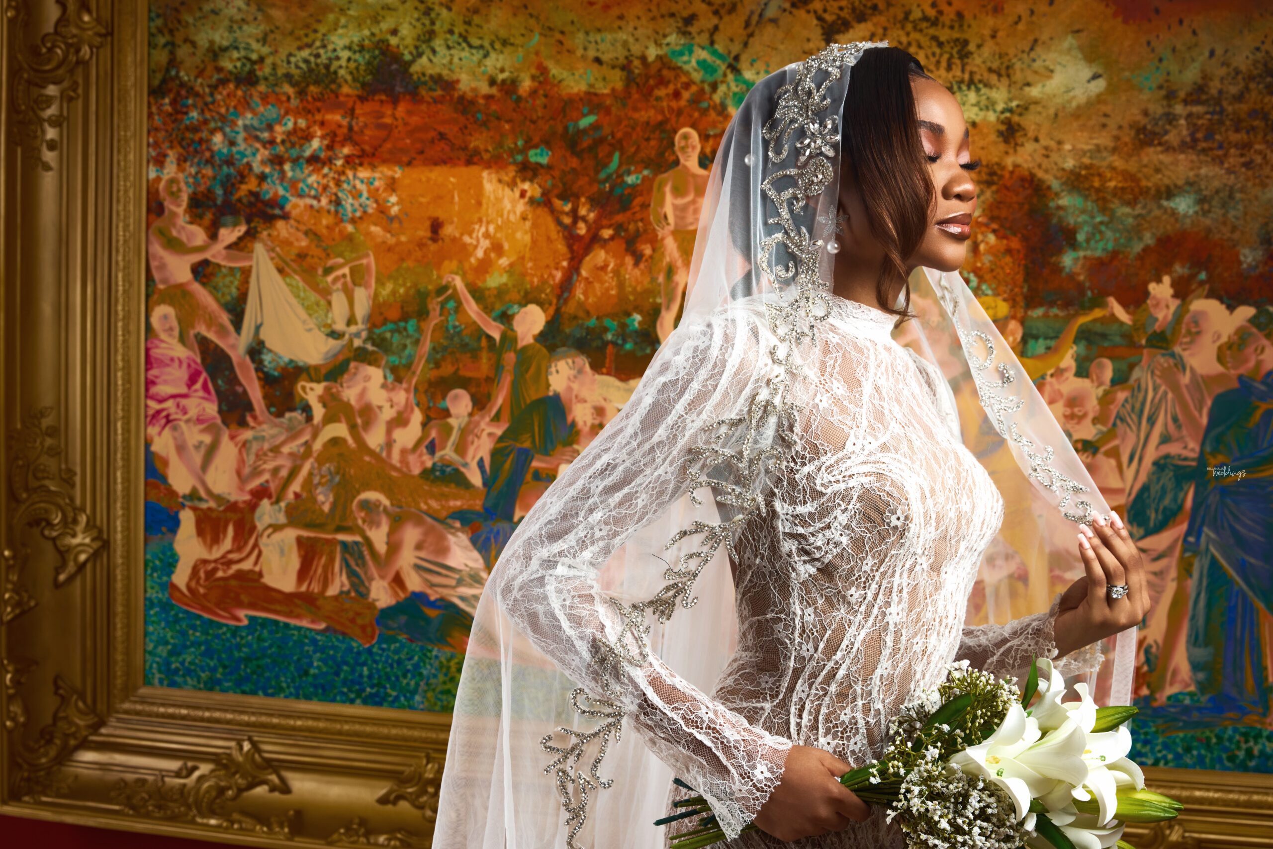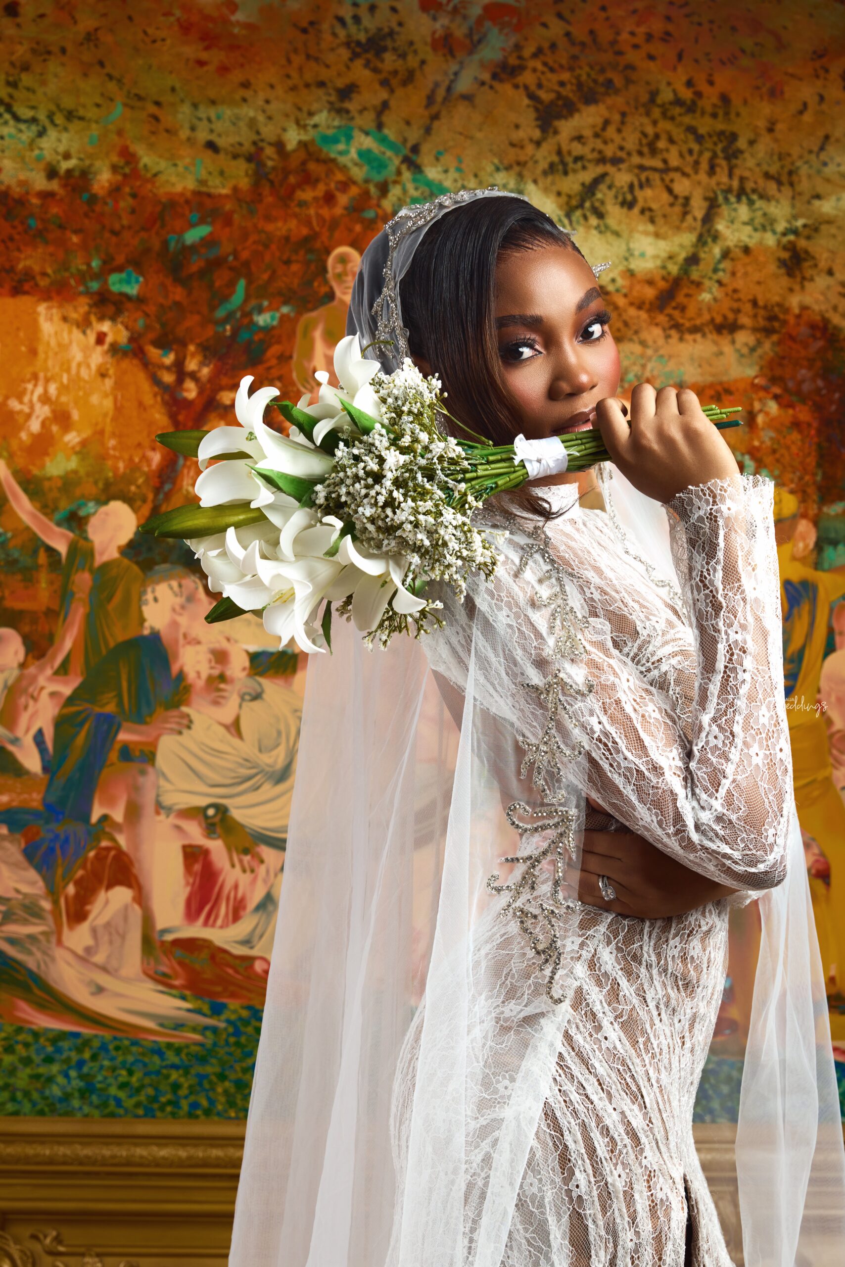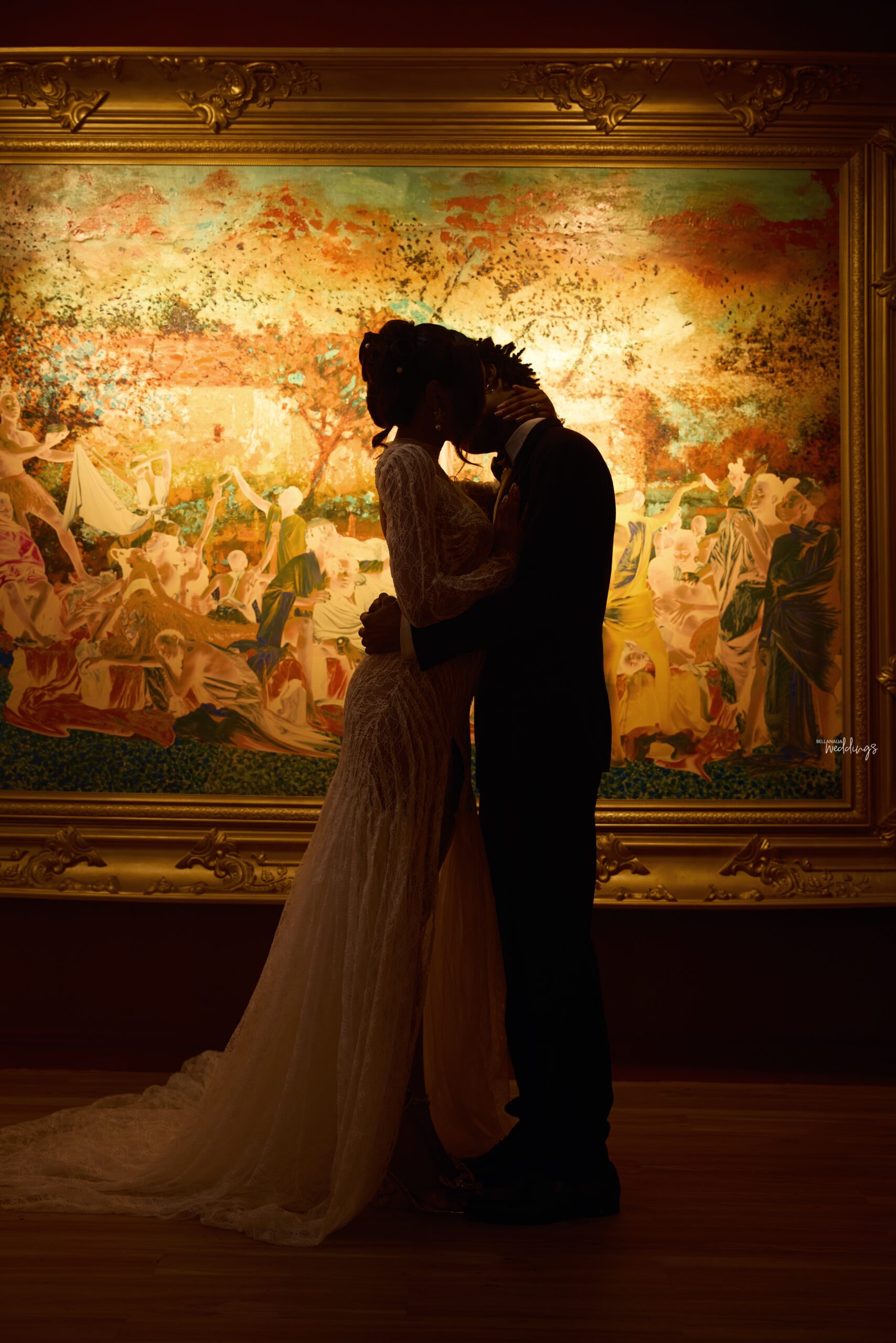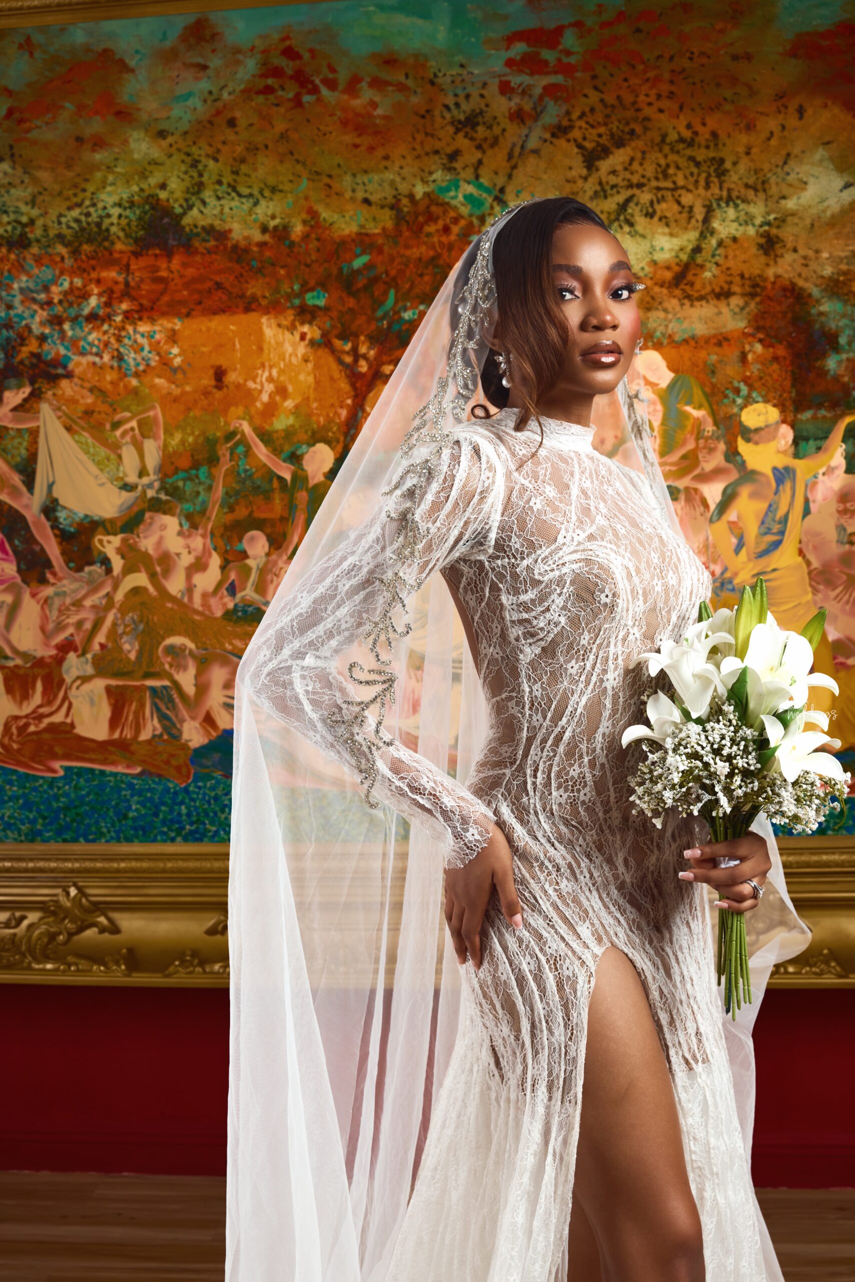 The classic art painting and velvet-draped backdrops frame how elegant this white wedding shoot truly is. The aim is to explore wedding photography from a sophisticated lens while maintaining the tension, passion and everything that matters. With this mix in place, it’s promised to have a mesmerising, magazine-worthy outcome. You can feel the love and, at the same time, see how the couple can perfectly fit into the cover of Vogue.
