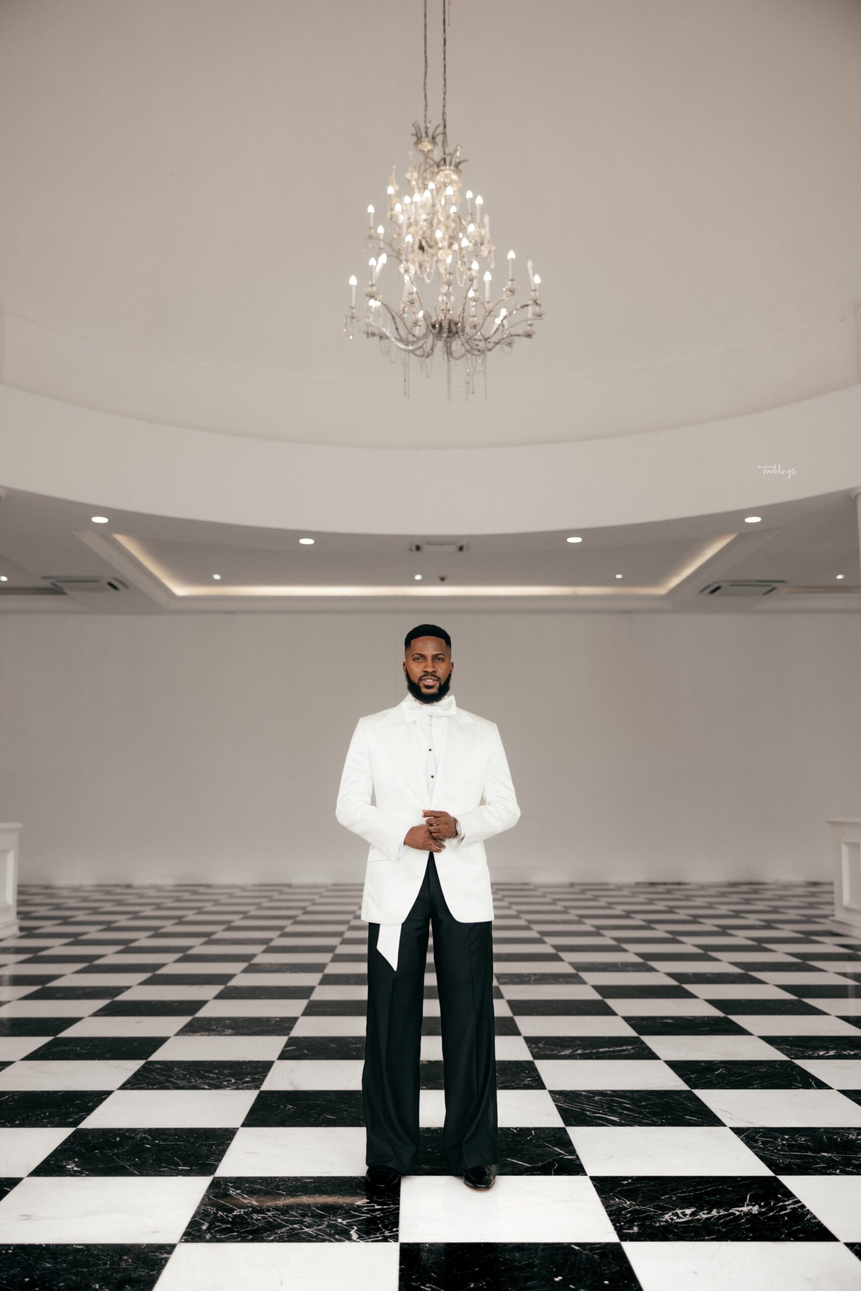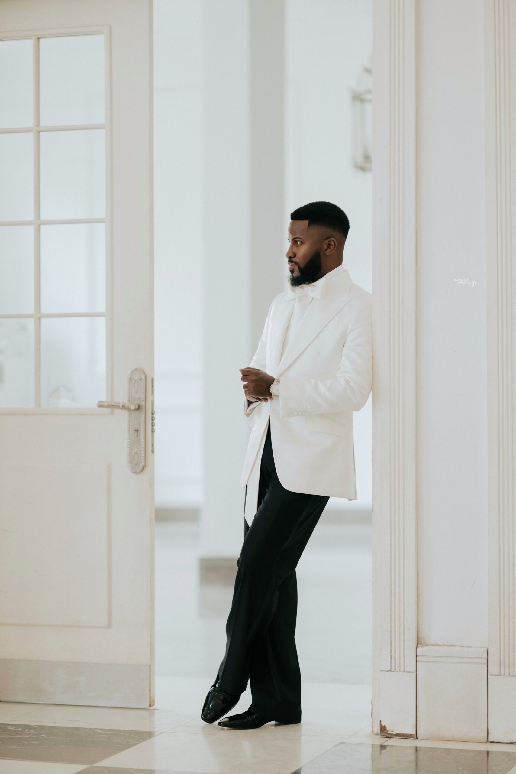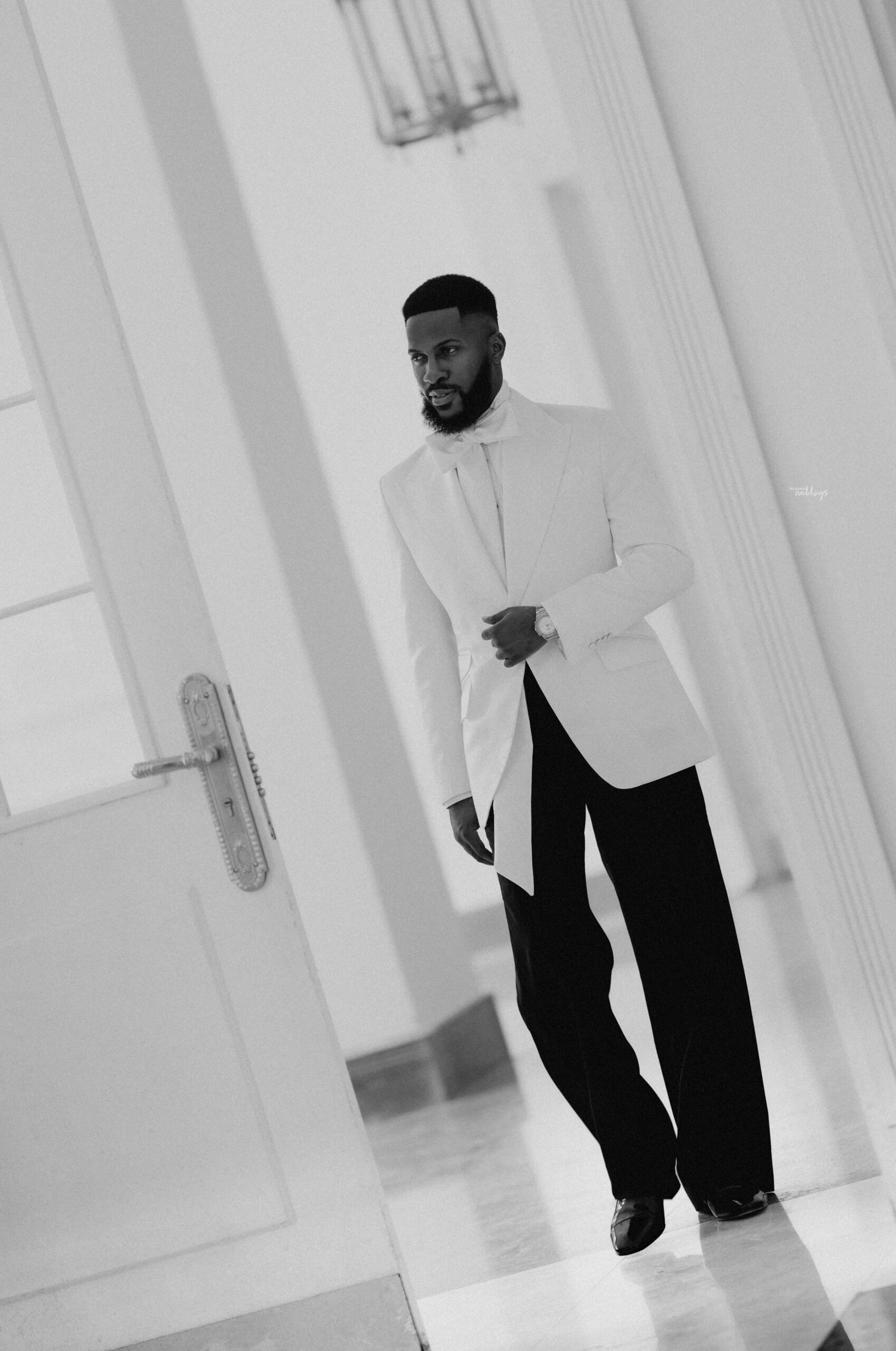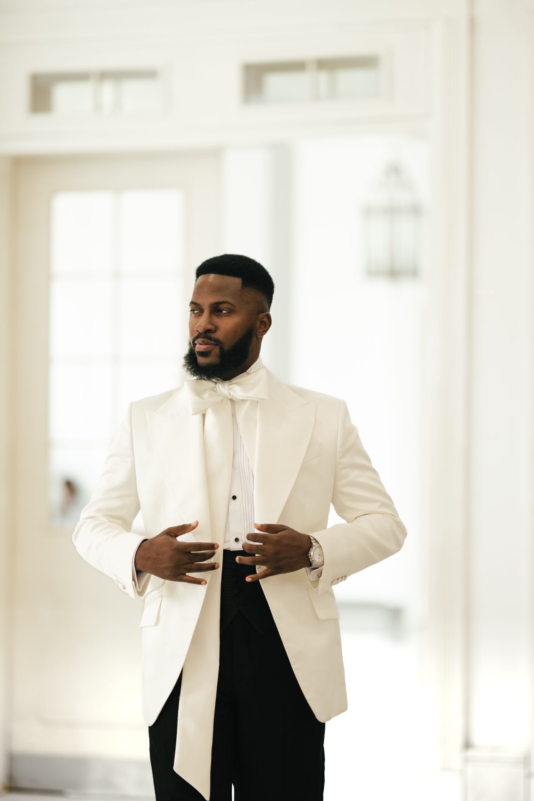 For our Civil Wedding Style journey, three words came to mind: ‘Timeless, Stylish, Classic’. We wanted to create looks that were both classic and contemporary, creating a perfect mix of both elements very intentionally. Akin has always championed wearing Nigerian, and this wasn’t going to be any different. Our First Look was exactly that, striking and classic on first glance, however the real work was in the details .. Akin’s suit had intentionality in every detail, from the Dior inspired bow tie with an unconventional twist, to the pleats on the shirt, the unconventional shape of the cummerbund with pleats and buttons, and a perfectly tailored ivory tuxedo from “Deji & Kola” paired with Christian Louboutin shoes.