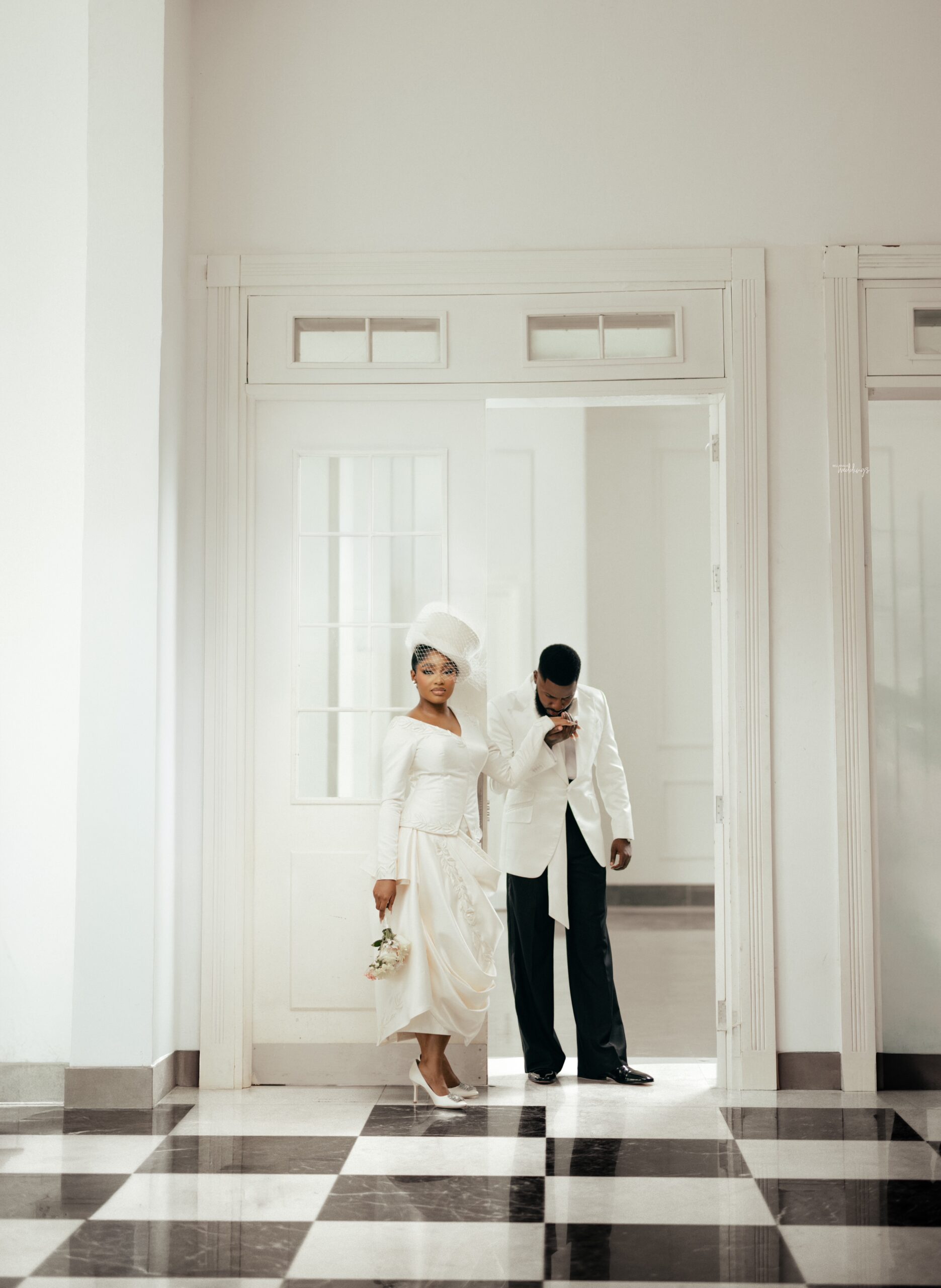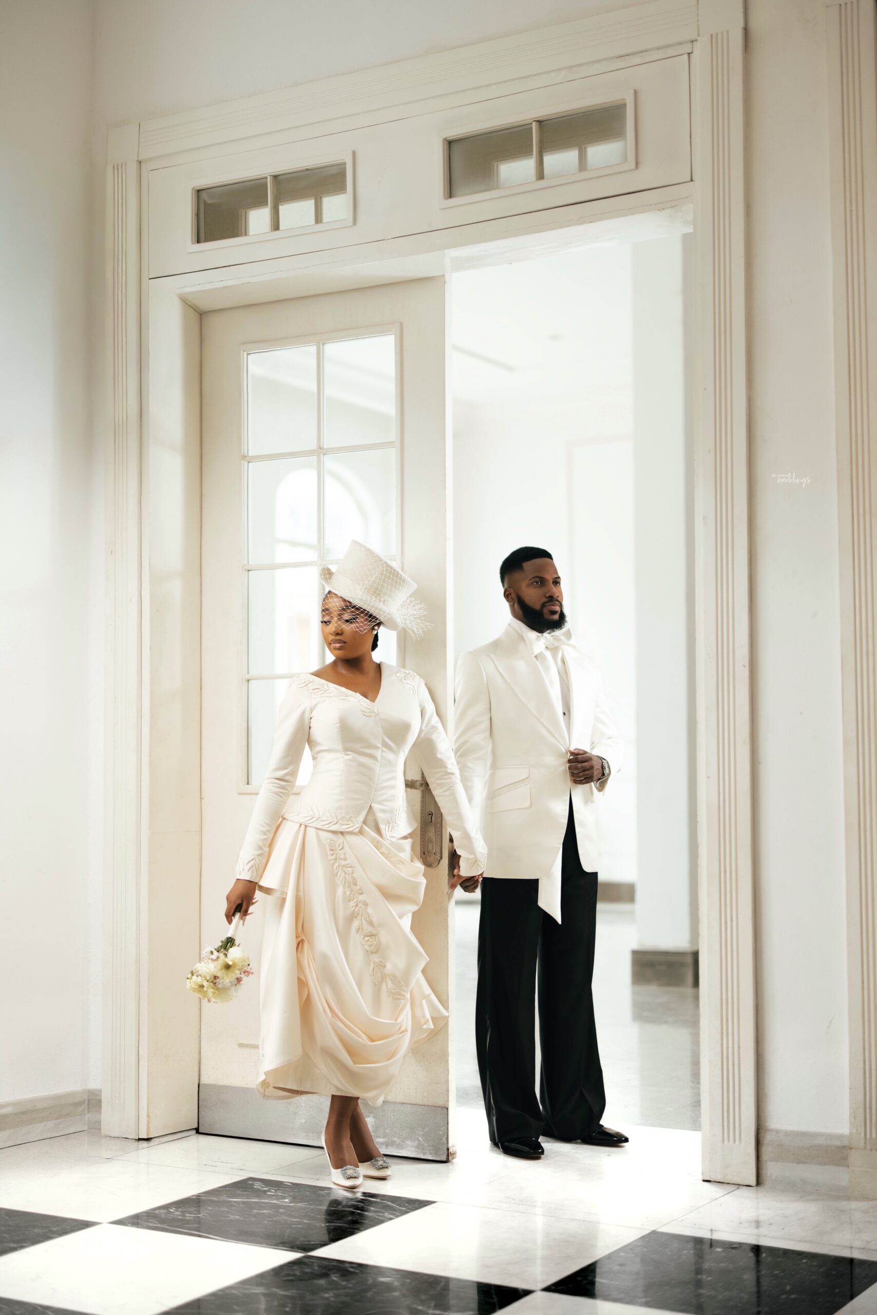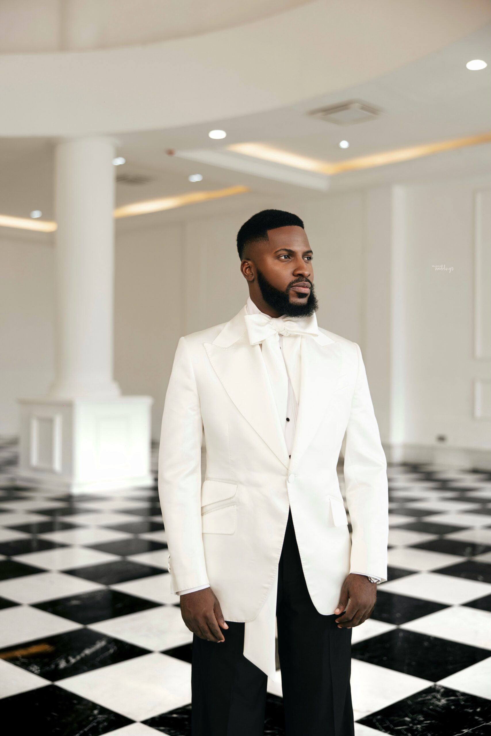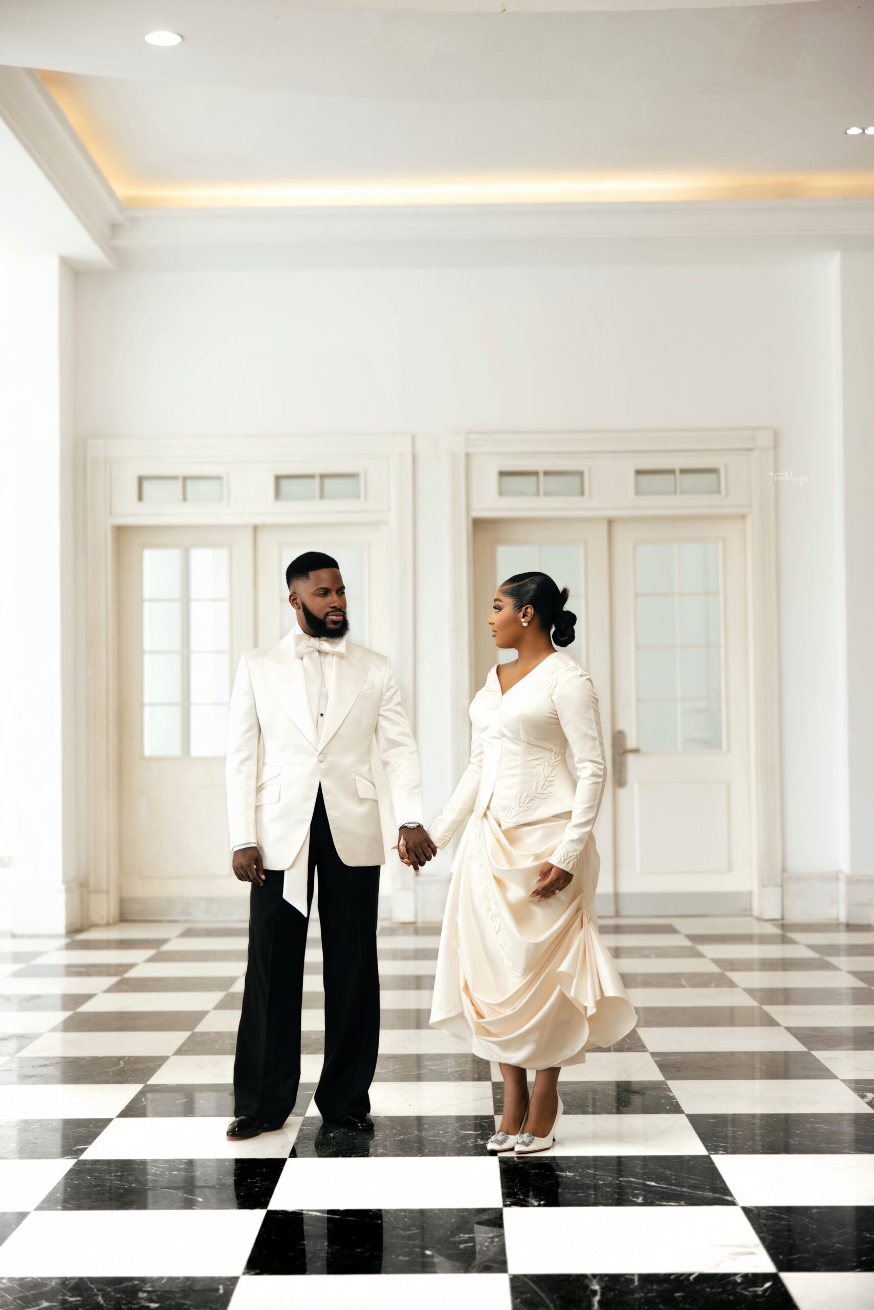 For our Civil Wedding Style journey, three words came to mind: ‘Timeless, Stylish, Classic’. We wanted to create looks that were both classic and contemporary, creating a perfect mix of both elements very intentionally. Akin has always championed wearing Nigerian, and this wasn’t going to be any different. Our First Look was exactly that, striking and classic on first glance, however the real work was in the details .. Akin’s suit had intentionality in every detail, from the Dior inspired bow tie with an unconventional twist, to the pleats on the shirt, the unconventional shape of the cummerbund with pleats and buttons, and a perfectly tailored ivory tuxedo from “Deji & Kola” paired with Christian Louboutin shoes.