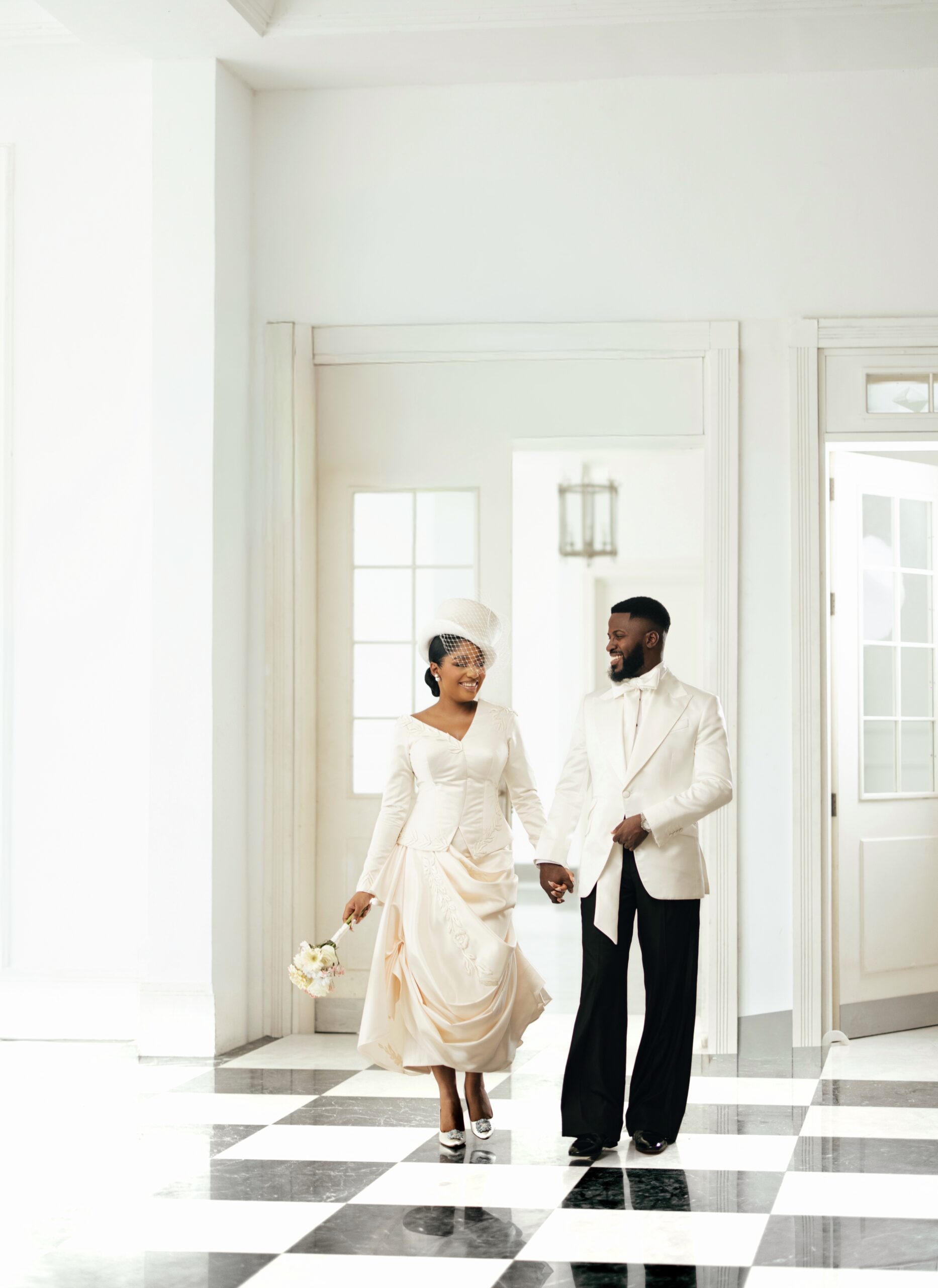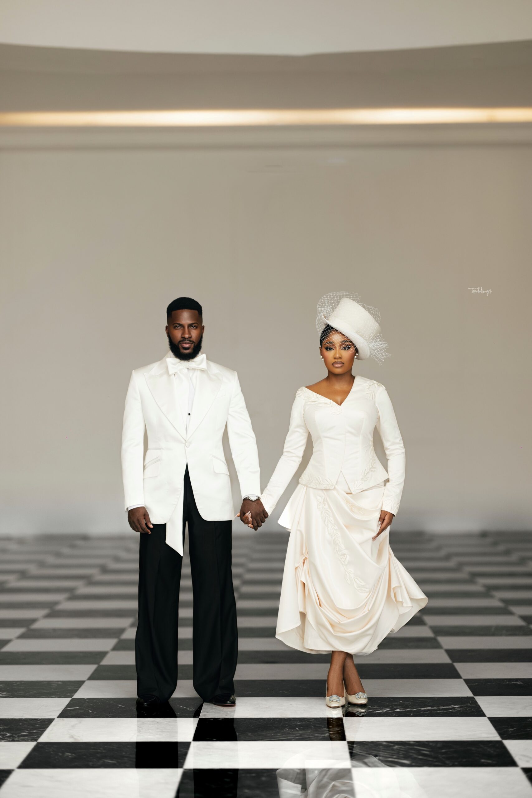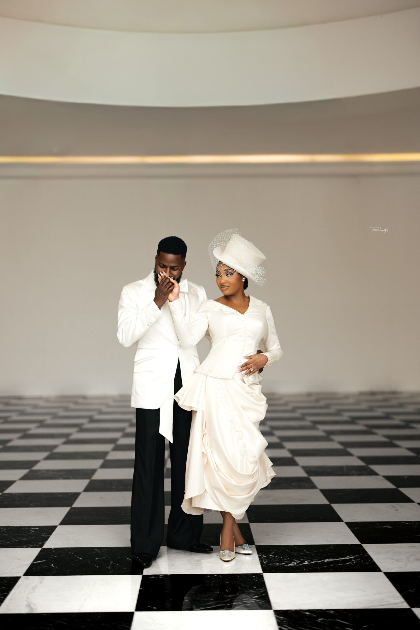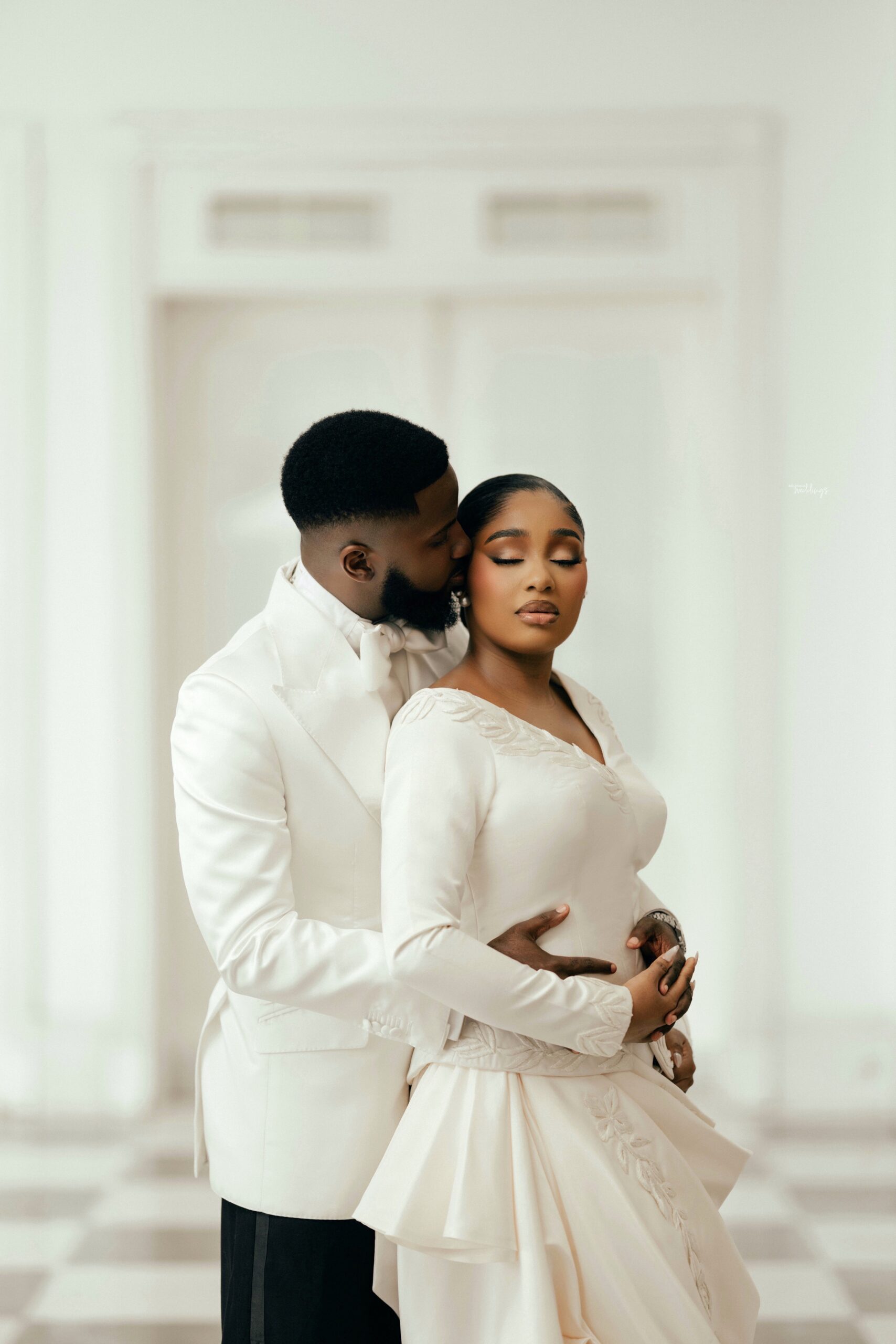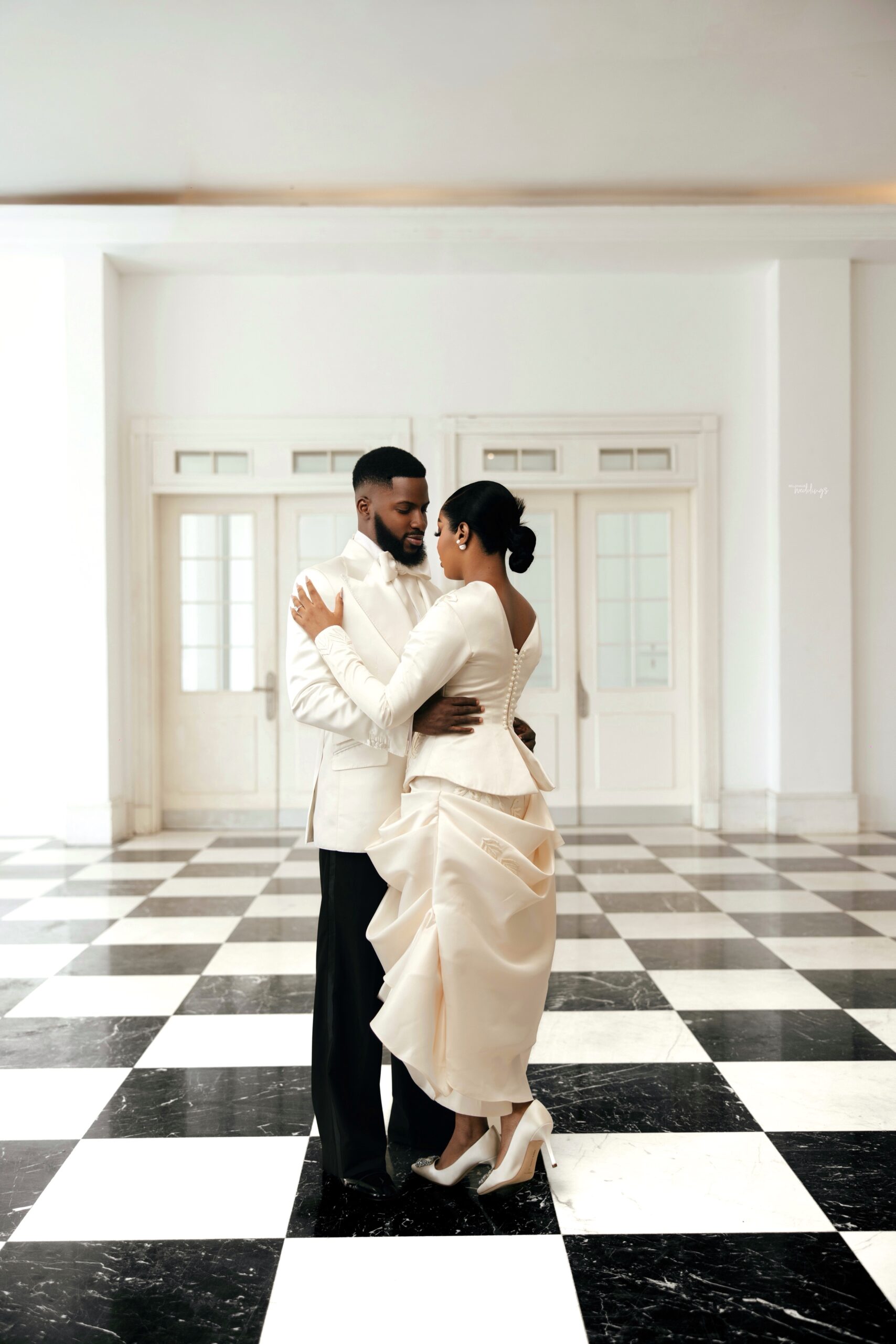 For our Civil Wedding Style journey, three words came to mind: ‘Timeless, Stylish, Classic’. We wanted to create looks that were both classic and contemporary, creating a perfect mix of both elements very intentionally. Akin has always championed wearing Nigerian, and this wasn’t going to be any different. Our First Look was exactly that, striking and classic on first glance, however the real work was in the details .. Akin’s suit had intentionality in every detail, from the Dior inspired bow tie with an unconventional twist, to the pleats on the shirt, the unconventional shape of the cummerbund with pleats and buttons, and a perfectly tailored ivory tuxedo from “Deji & Kola” paired with Christian Louboutin shoes.