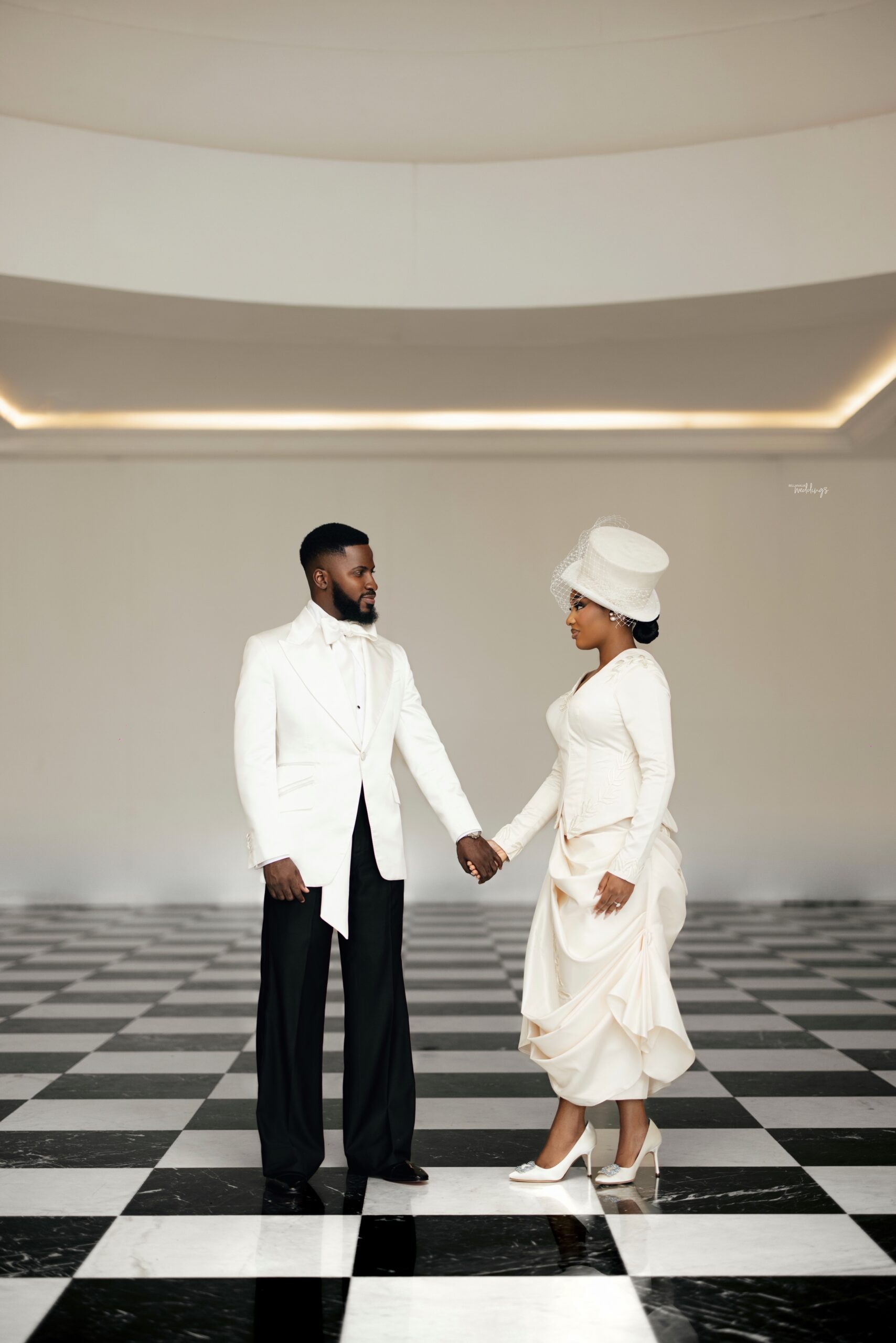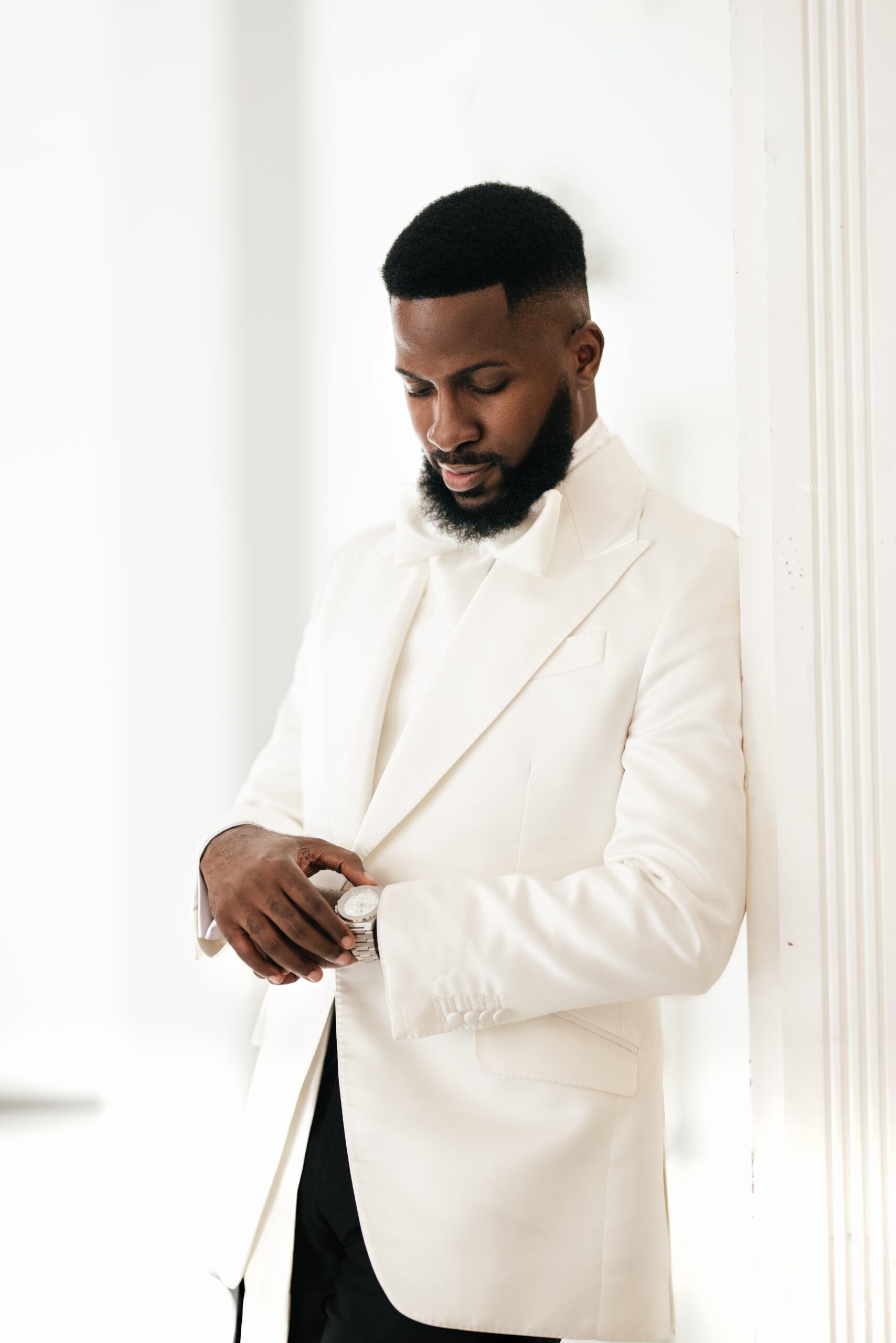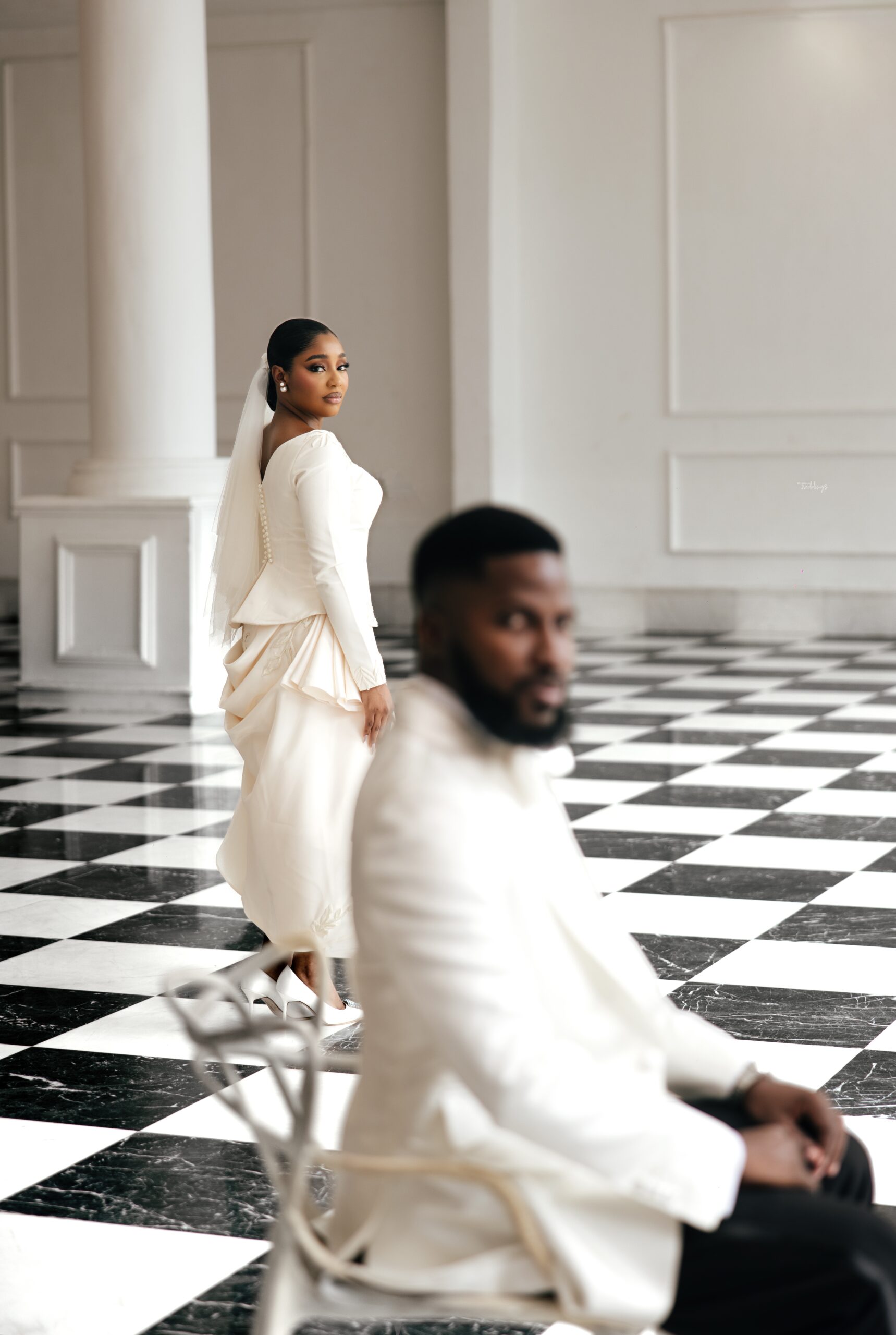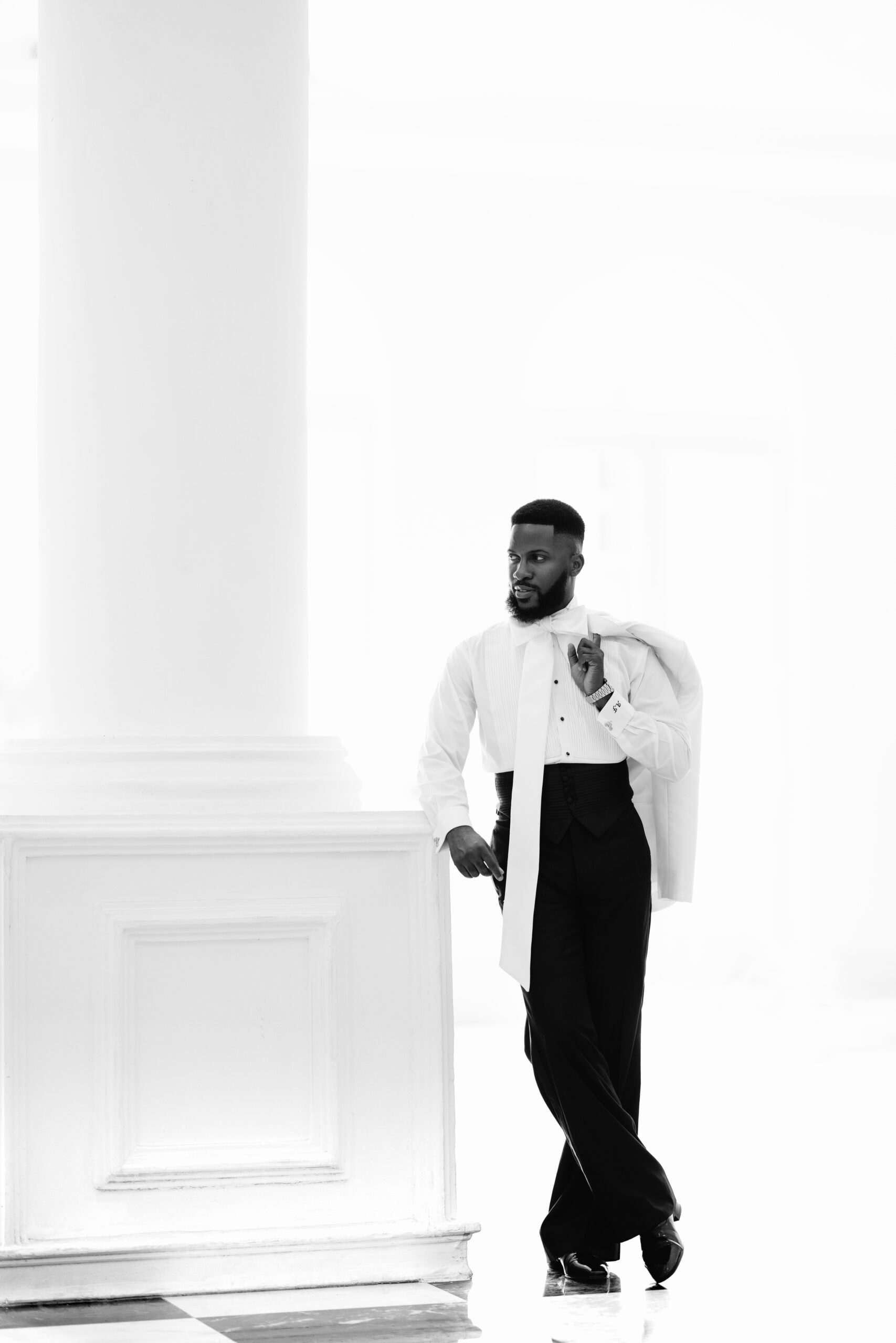 For our Civil Wedding Style journey, three words came to mind: ‘Timeless, Stylish, Classic’. We wanted to create looks that were both classic and contemporary, creating a perfect mix of both elements very intentionally. Akin has always championed wearing Nigerian, and this wasn’t going to be any different. Our First Look was exactly that, striking and classic on first glance, however the real work was in the details .. Akin’s suit had intentionality in every detail, from the Dior inspired bow tie with an unconventional twist, to the pleats on the shirt, the unconventional shape of the cummerbund with pleats and buttons, and a perfectly tailored ivory tuxedo from “Deji & Kola” paired with Christian Louboutin shoes.