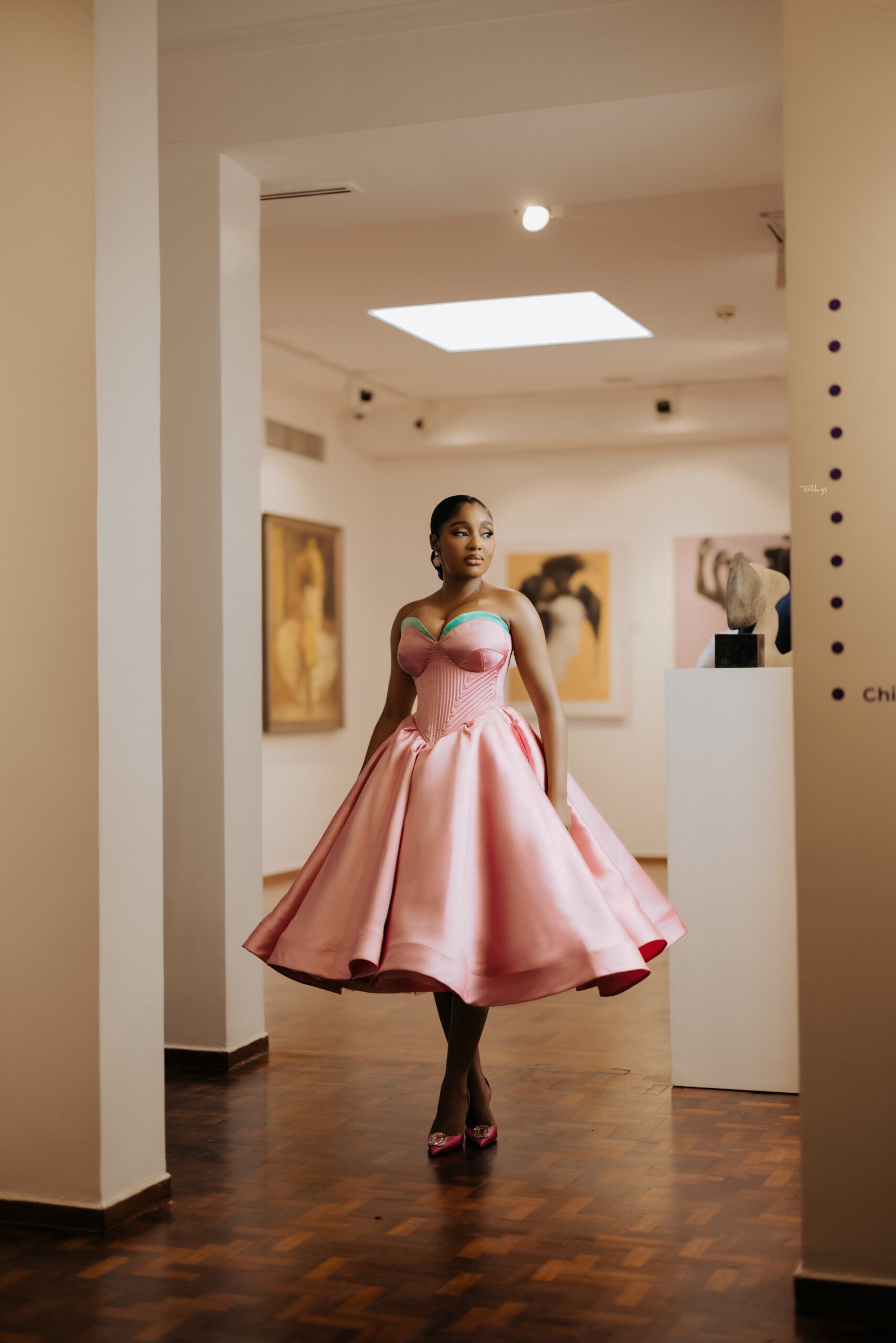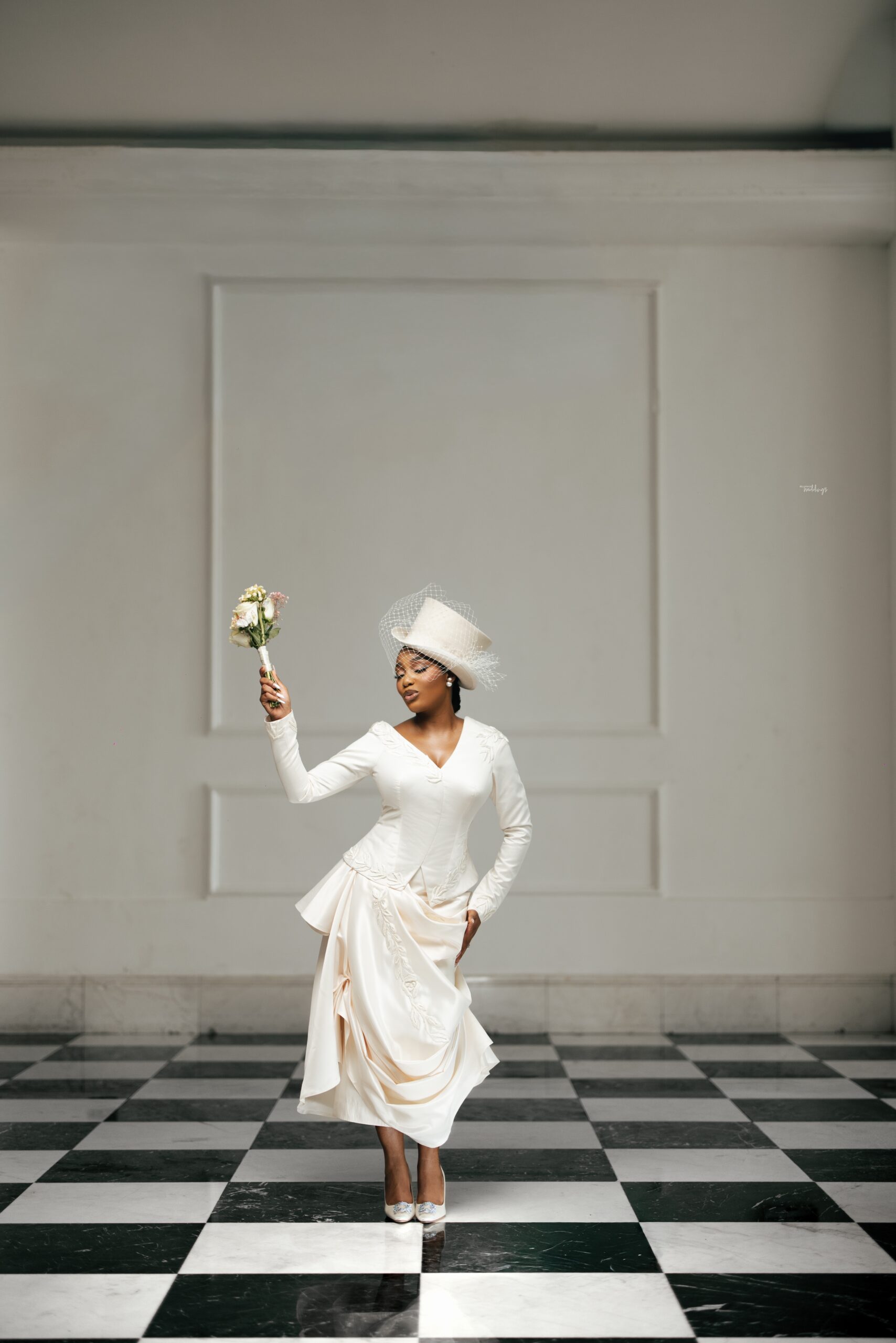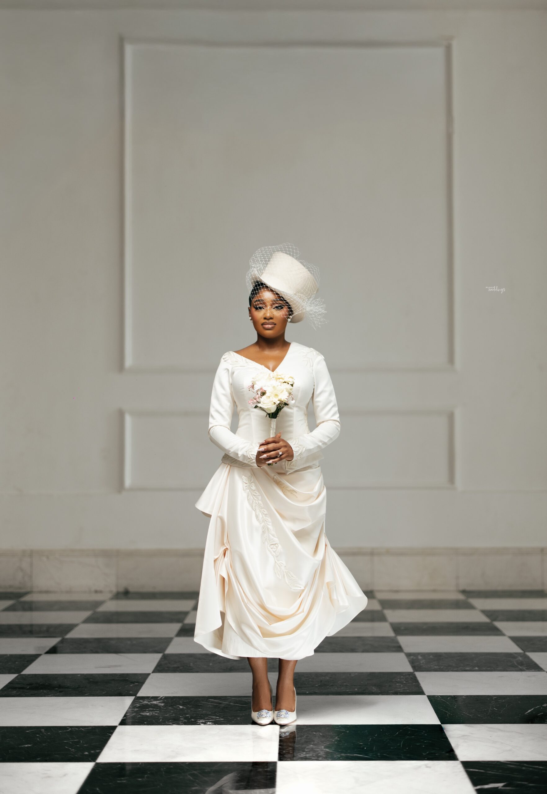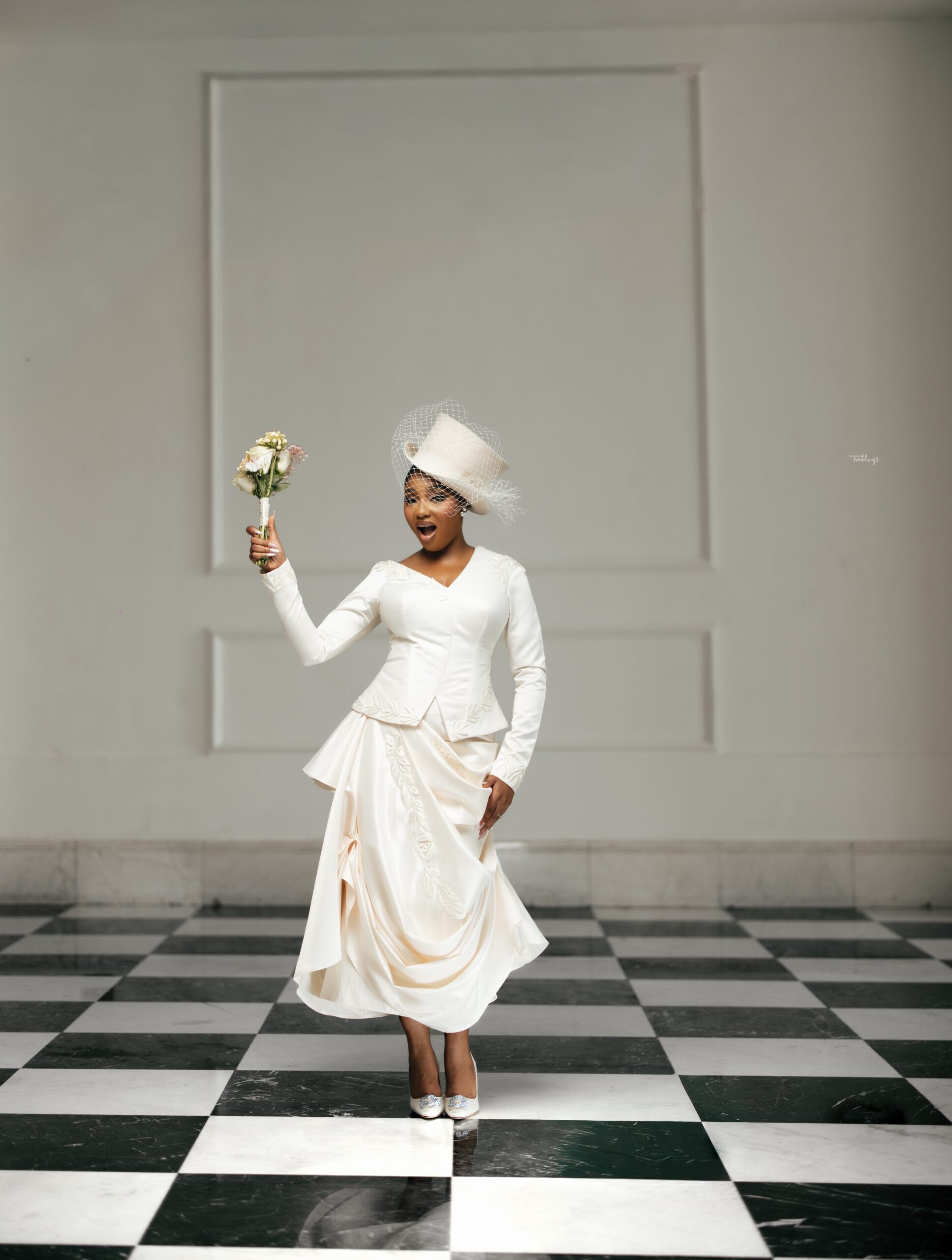 Kiky’s First look was a perfect blend of vintage and contemporary elements. She wanted something that felt timeless, refined, and true to her style. Her look was inspired by vintage Dior silhouettes with a touch of elegance clean lines, soft glam, and pieces that felt effortlessly beautiful. Her Mazelle Bridal outfit had intricate draping of the skirt, an intentional cut of the bodice and the styling with the hat and the Manolo Blahnik shoes.