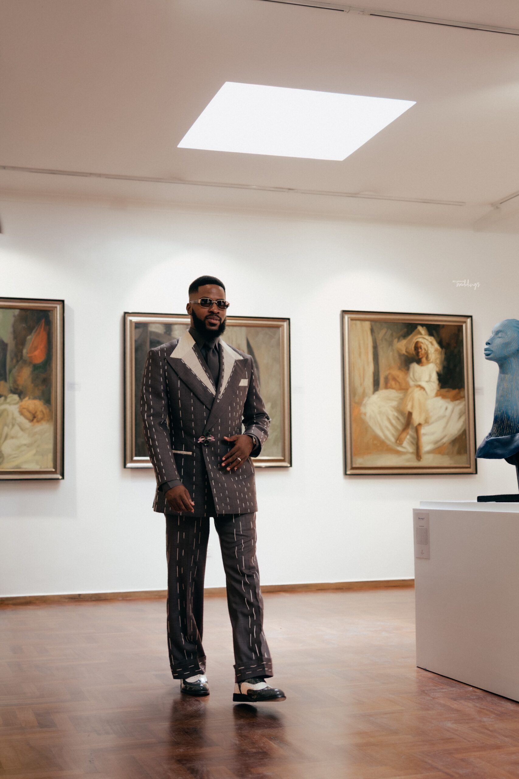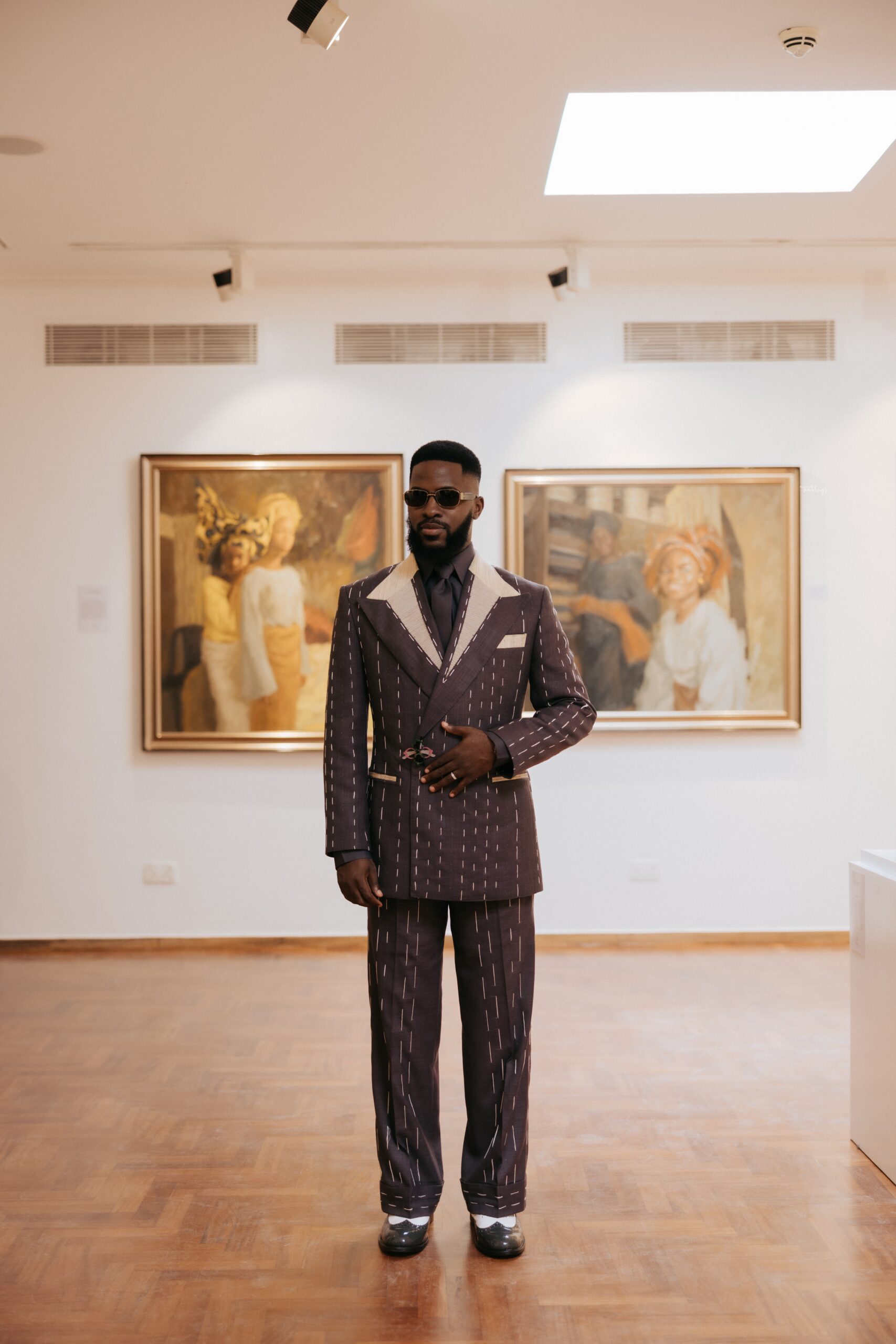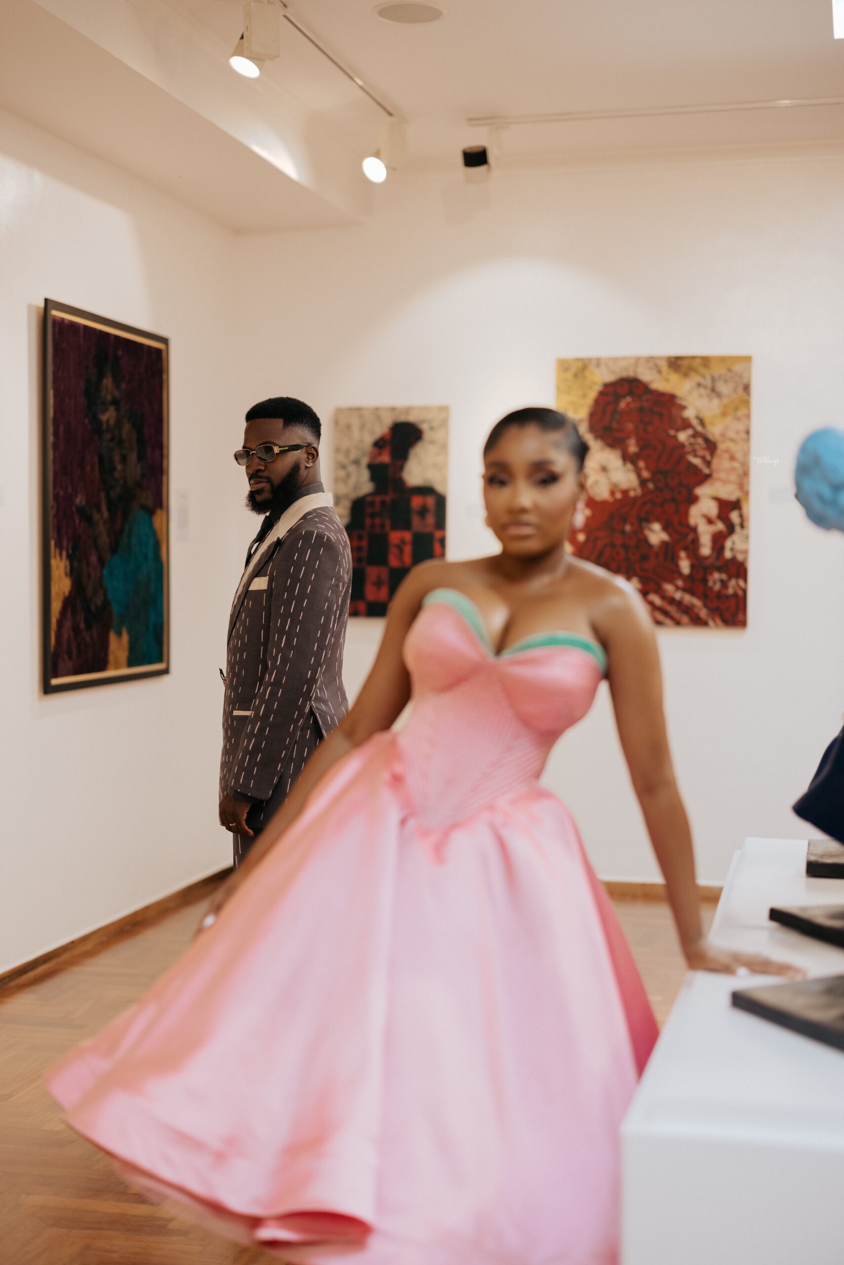 We decided on creating a timeless civil look that is as artistic as it is appropriate for a civil wedding (The Artistic reference was why it was shot in an Art Gallery), and a Full Canvas Couture piece of an unfinished but finished suit was the answer, also by “Deji & Kola” and styled by The Style Infidel. Akin’s Third Look was a refreshing take, an ode to a Modern Groom with more daring and experimental elements. Orange Culture was behind this look, and it was as colourful as it was intentional.