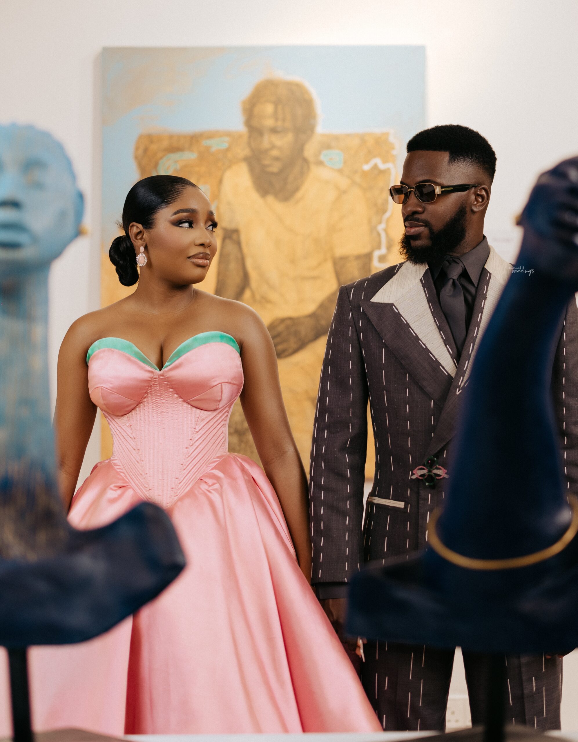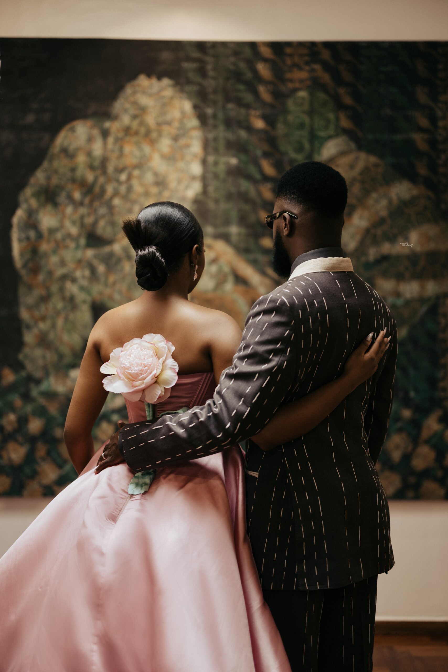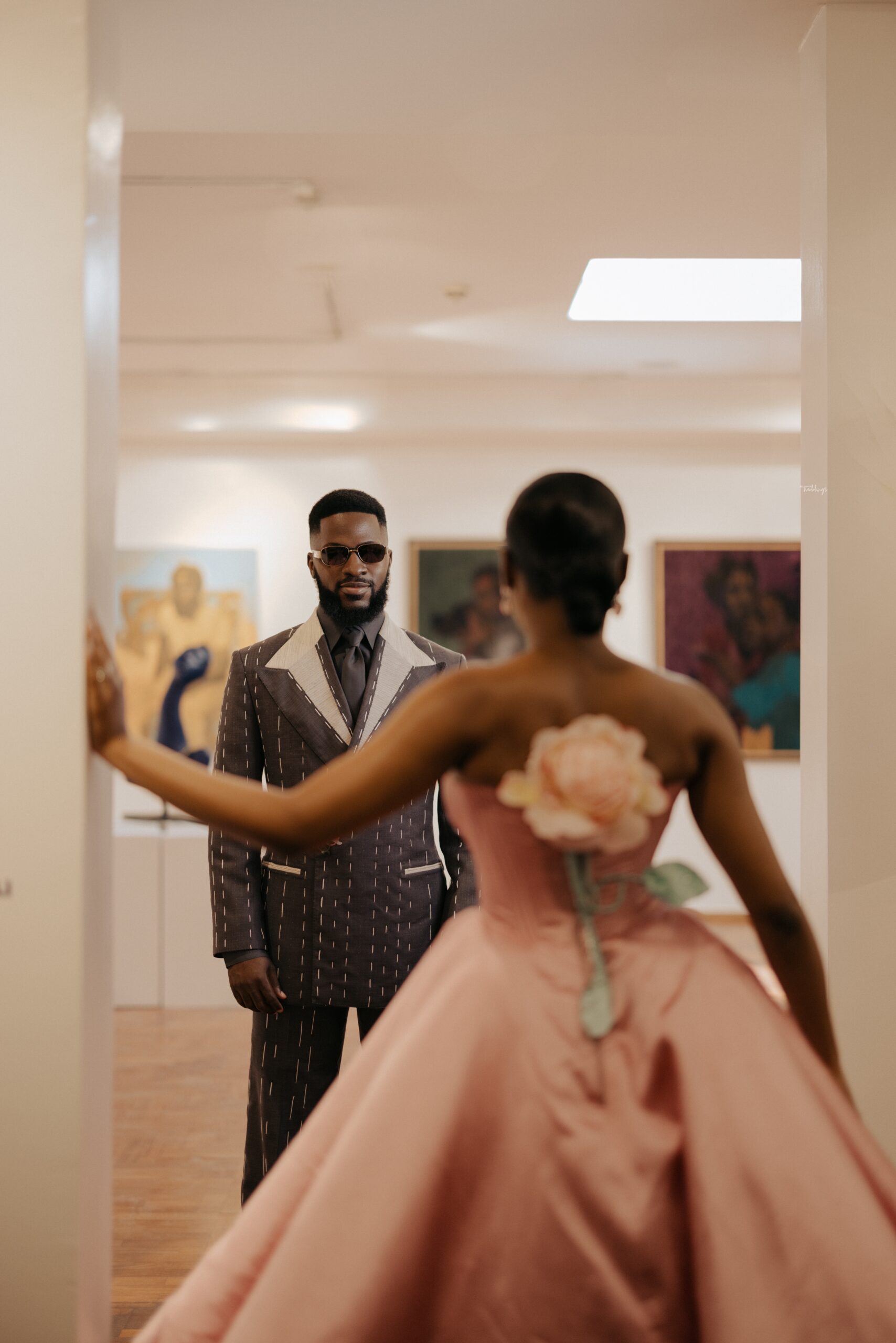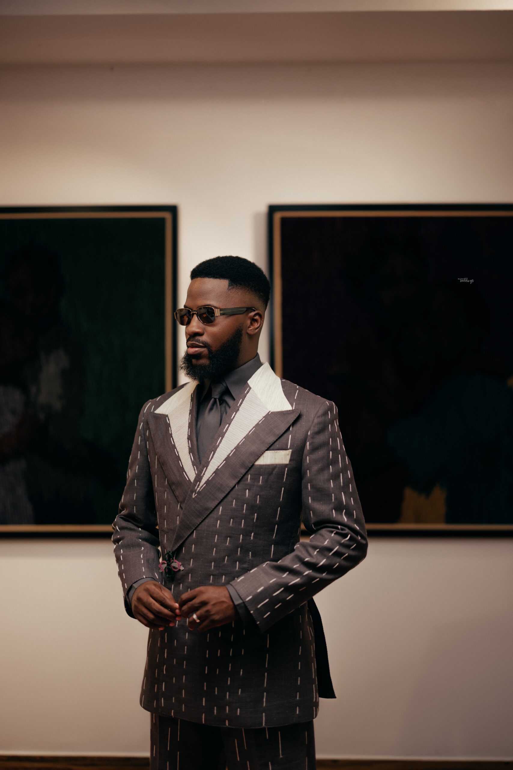 We decided on creating a timeless civil look that is as artistic as it is appropriate for a civil wedding (The Artistic reference was why it was shot in an Art Gallery), and a Full Canvas Couture piece of an unfinished but finished suit was the answer, also by “Deji & Kola” and styled by The Style Infidel. Akin’s Third Look was a refreshing take, an ode to a Modern Groom with more daring and experimental elements. Orange Culture was behind this look, and it was as colourful as it was intentional.