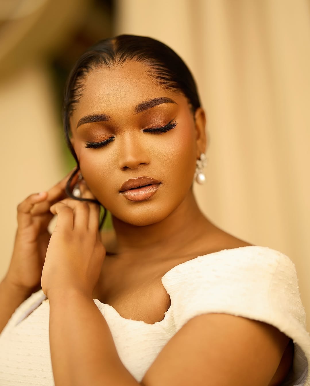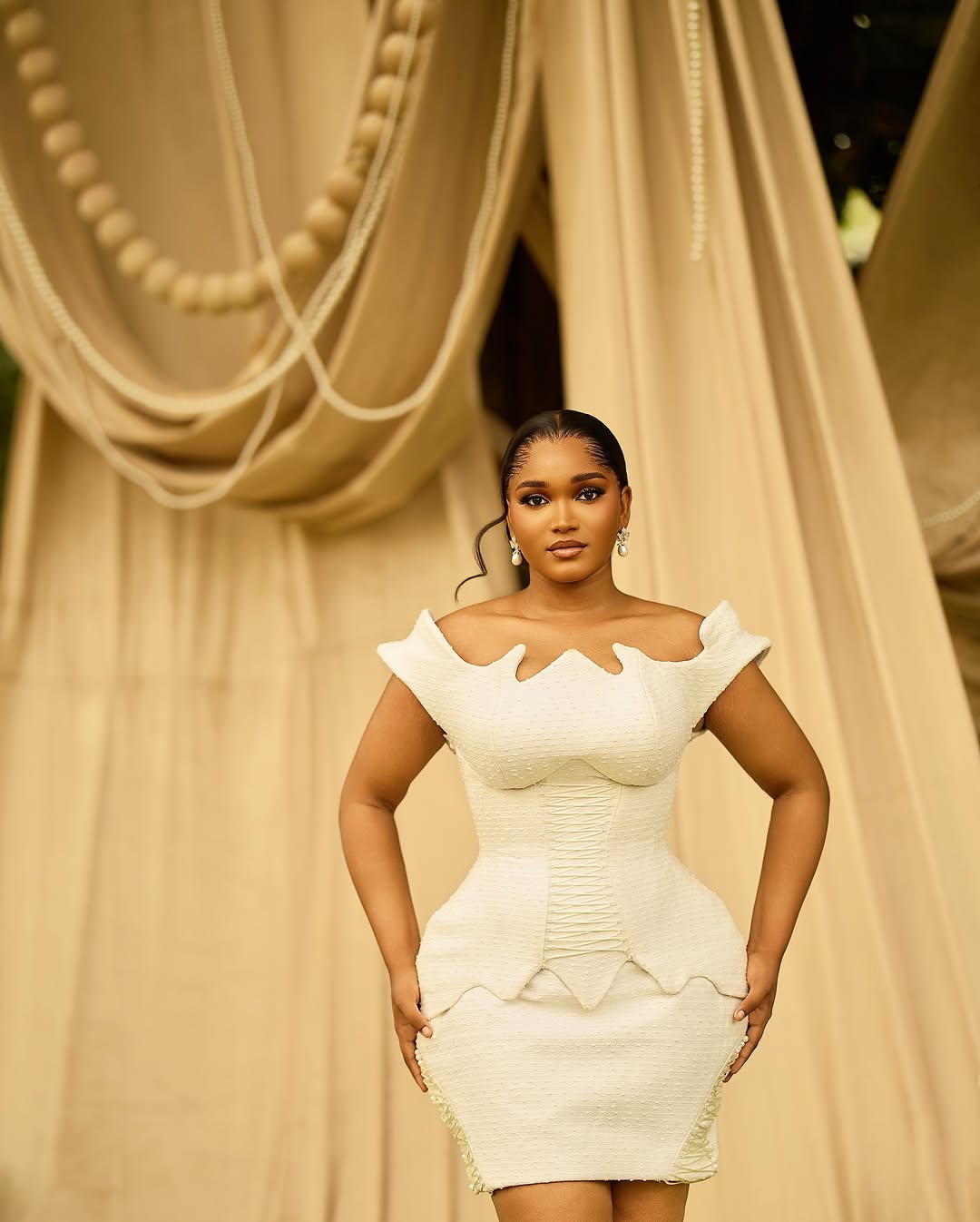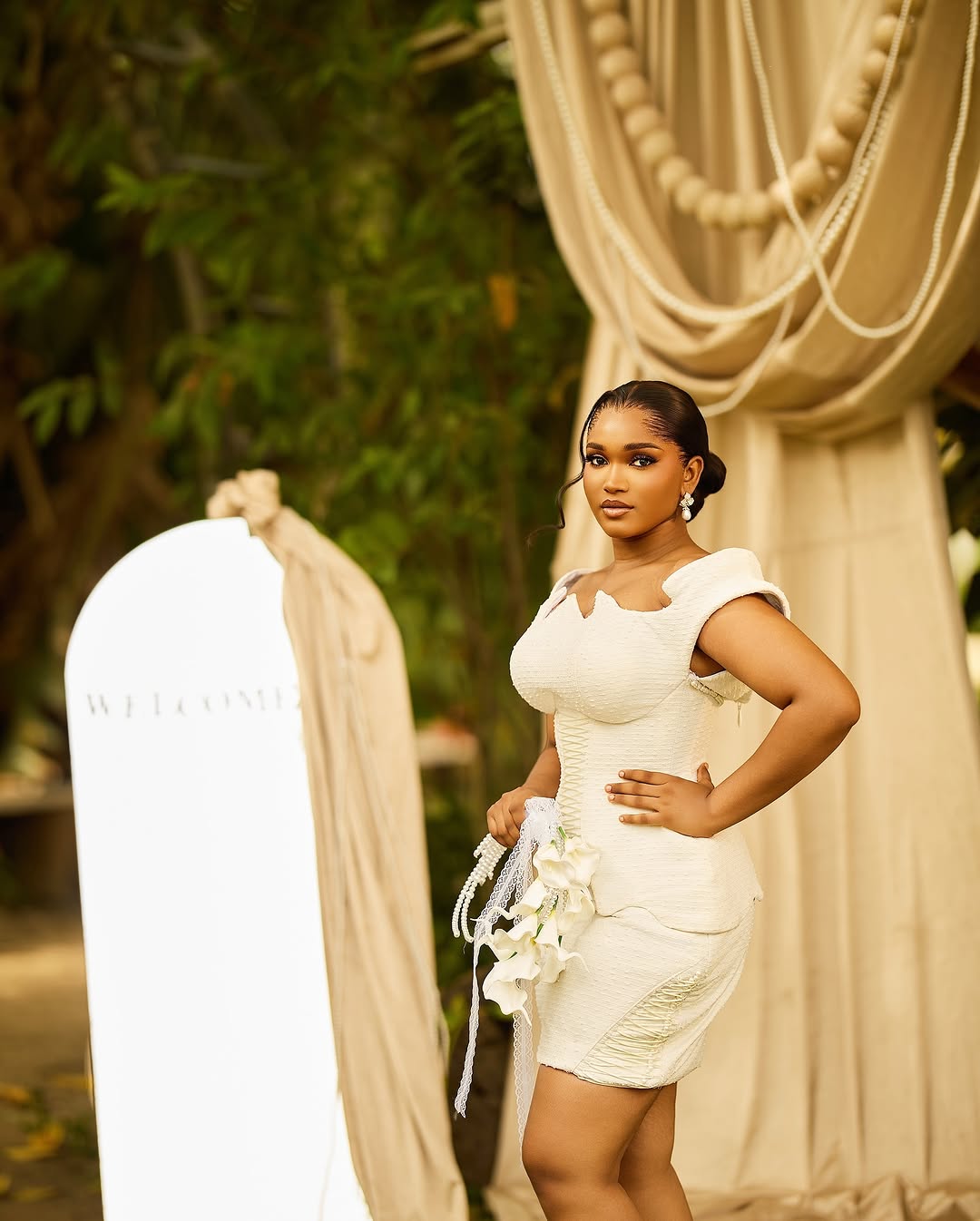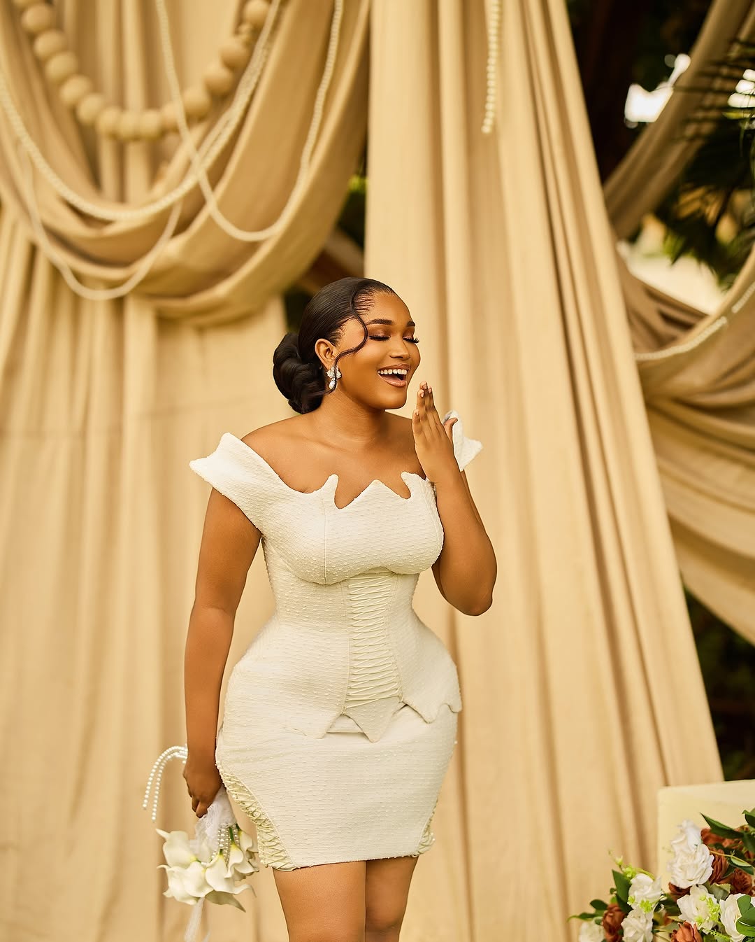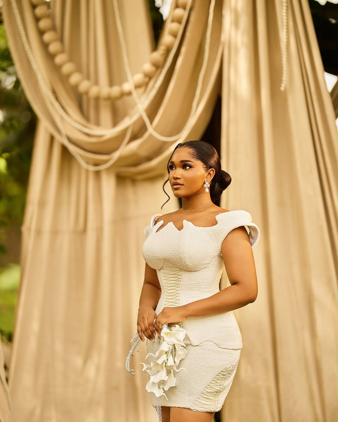 Mide Outfit designed this mini civil wedding dress with some Victorian-inspired details. With a striking cutout neckline, laced peplum bodice and matching laces on the sides of the skirt, this look is a work of art! The Katchy Glam perfected a flawless makeup to match the chic look, while Tee Weaves Styles sleeked the hair into a neat low bun with soft tendrils framing the face. Altogether, this look is for the bride who wants to step into their special day with timeless elegance, and if that’s your goal, then you can achieve it effortlessly with this lovely ensemble. You can also find more beauty looks here.