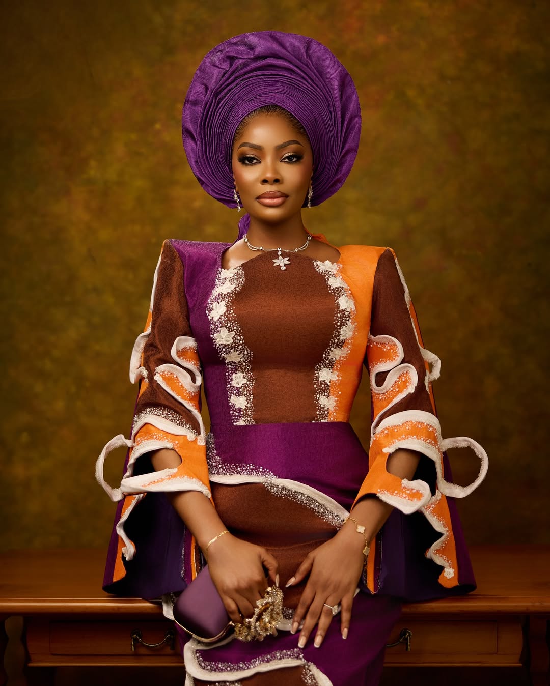When we say this dress, designed expertly by Mokhueleigbe Studios, is a work of art, best believe we mean every word! This colourful number features a structured shoulder, swirly cut-out hem sleeves, floral detailing on the bust and more swirls on the skirt.  This look is fabulous! It’s only natural that a gele would crown this masterpiece, and Aby Gele did it justice. Ariyike MUA then tied the whole look together with this lush makeup glam. This look serves elegant Iyawo vibes, and it will surely take your Yoruba traditional wedding to the next level. You can also find more beauty looks here.