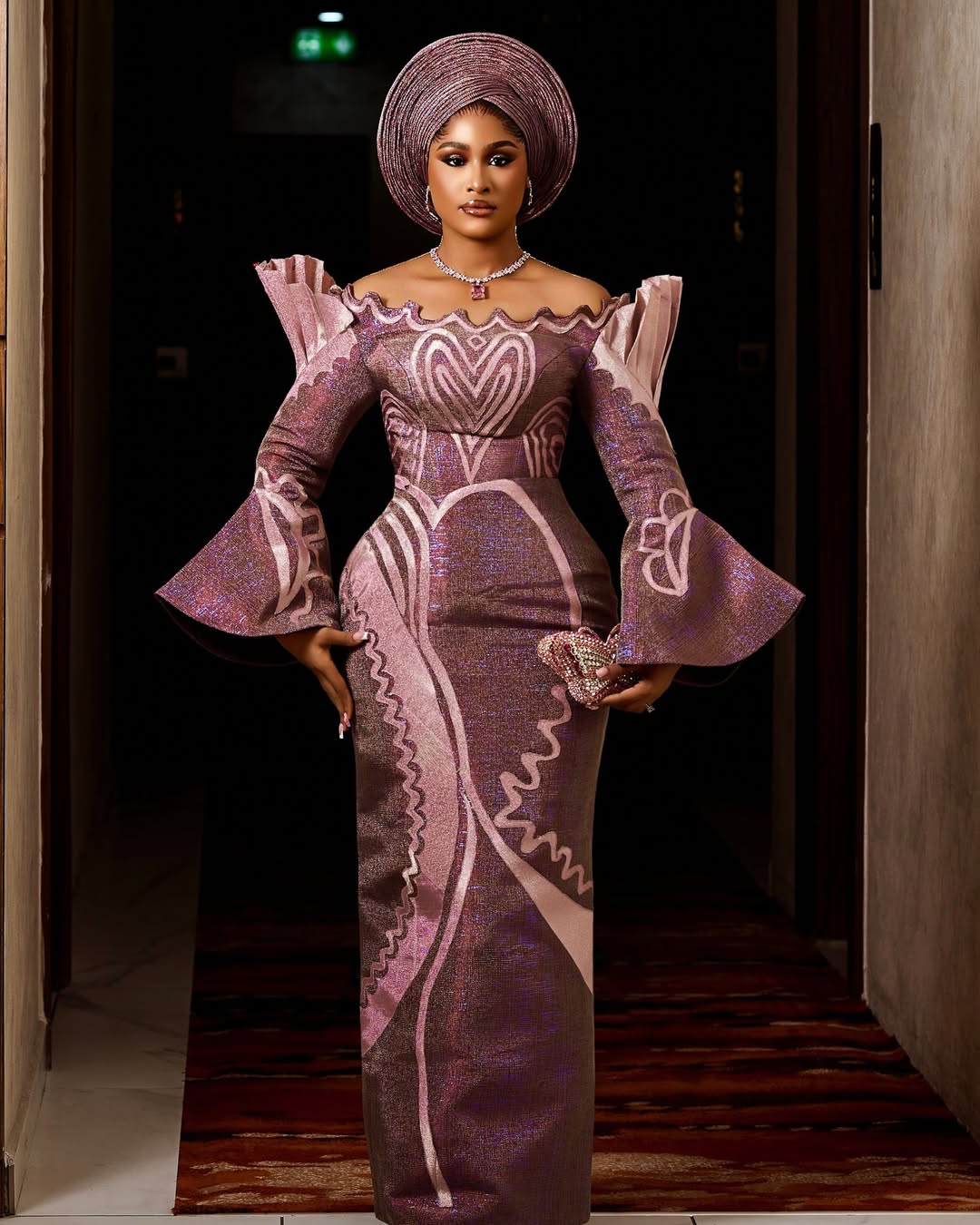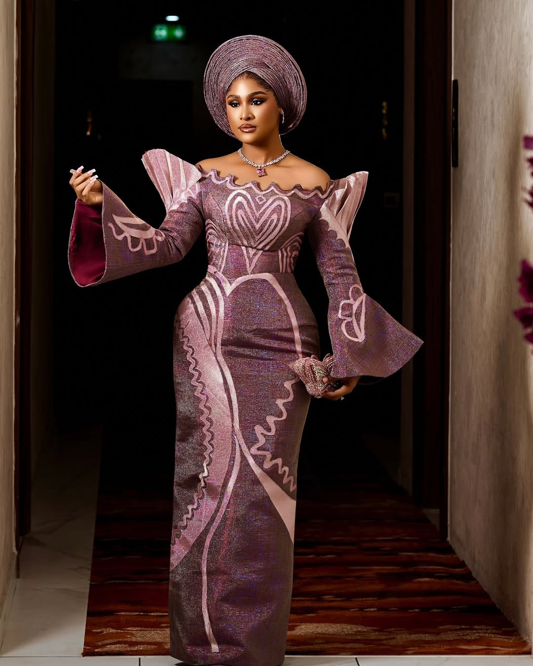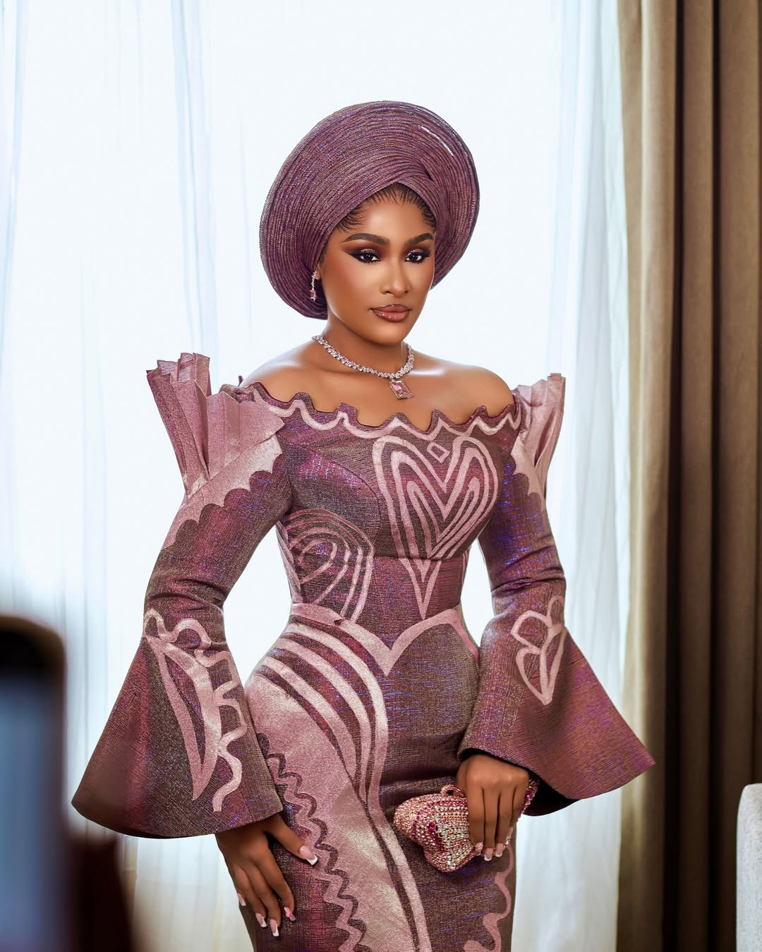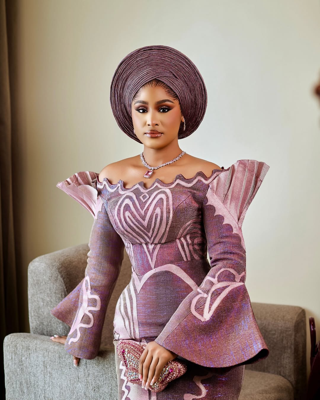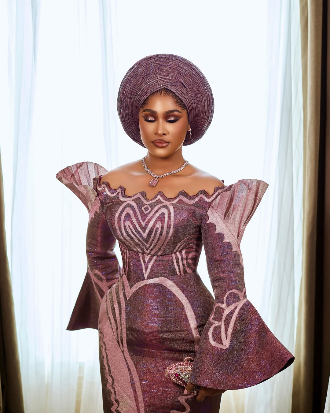 To that effect, here’s a Yoruba traditional bridal look that is, in fact, the drama! Designed beautifully by Nyala Fashion, this off-shoulder dress with a swirly neckline, statement shoulders, sleeves, and patterns is a true vision of stunning beauty! The colour of the aso-oke alone is breathtaking. The gele is in its own world, a perfectly pleated round piece by Gele by Kelv Africa. This look deserves a makeup so glamorous, and Bimz Pro delivered exactly that! What we have here is an absolute stunner, and if you’re a Yoruba bride-to-be who wants to slay beyond any reasonable doubt, then you should strongly consider this look! You can also find more beauty looks here.