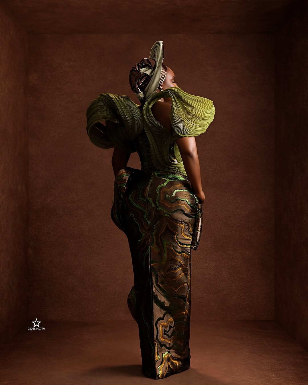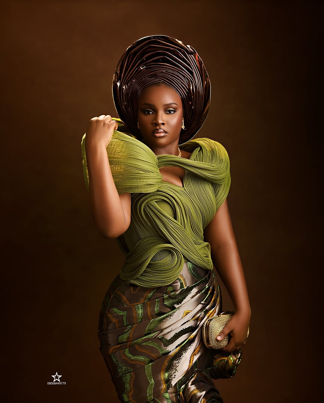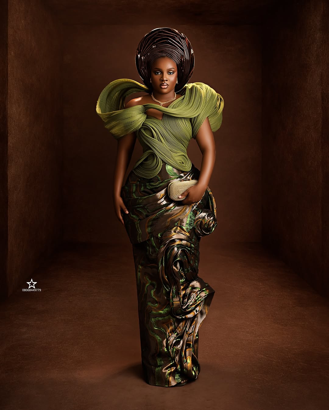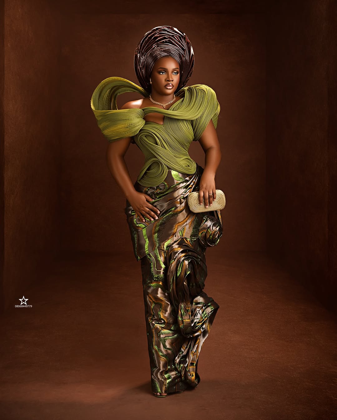 Nyore Eroyn was definitely thinking outside the box when this magical look was created. Featuring a swirly green bodice and metallic skirt with floral patterns, this look screams pure luxury! The Asake Glam delivered their quota with this glowy, makeup glam that absolutely complements the look, while Peace Gele sprinkled more traditional elegance with this perfectly pleated metallic gele. This ensemble is a solid 10 with zero flaws! Imagine how exquisite and radiant you’d look in this dress. All you have to do is embrace its charm and let it take over your big day slay. You can also find more beauty looks here.