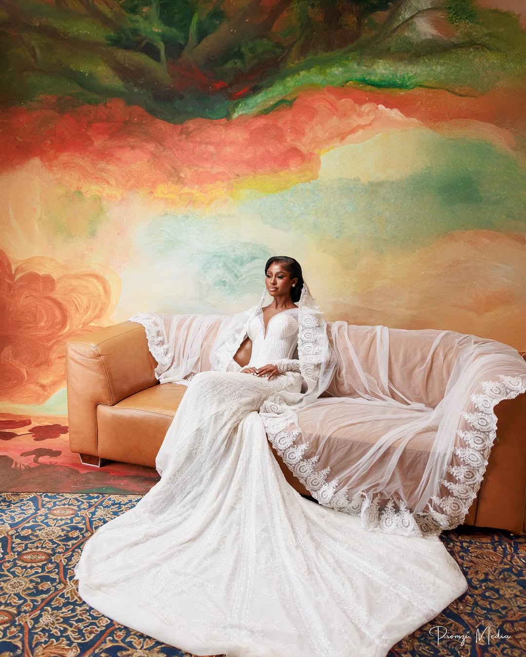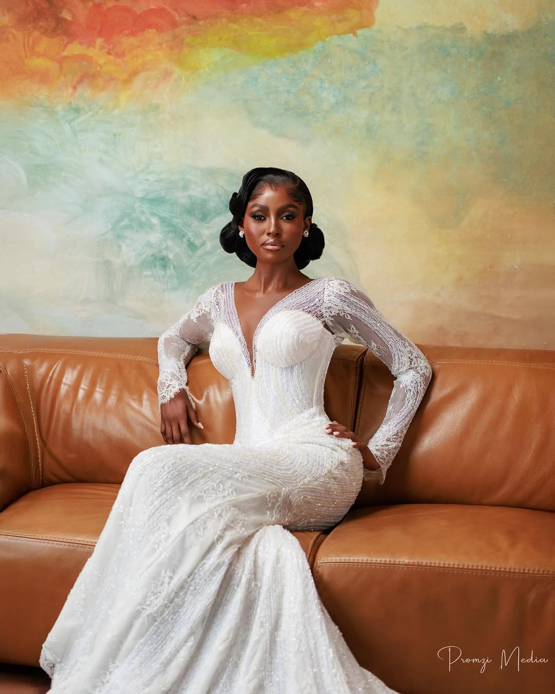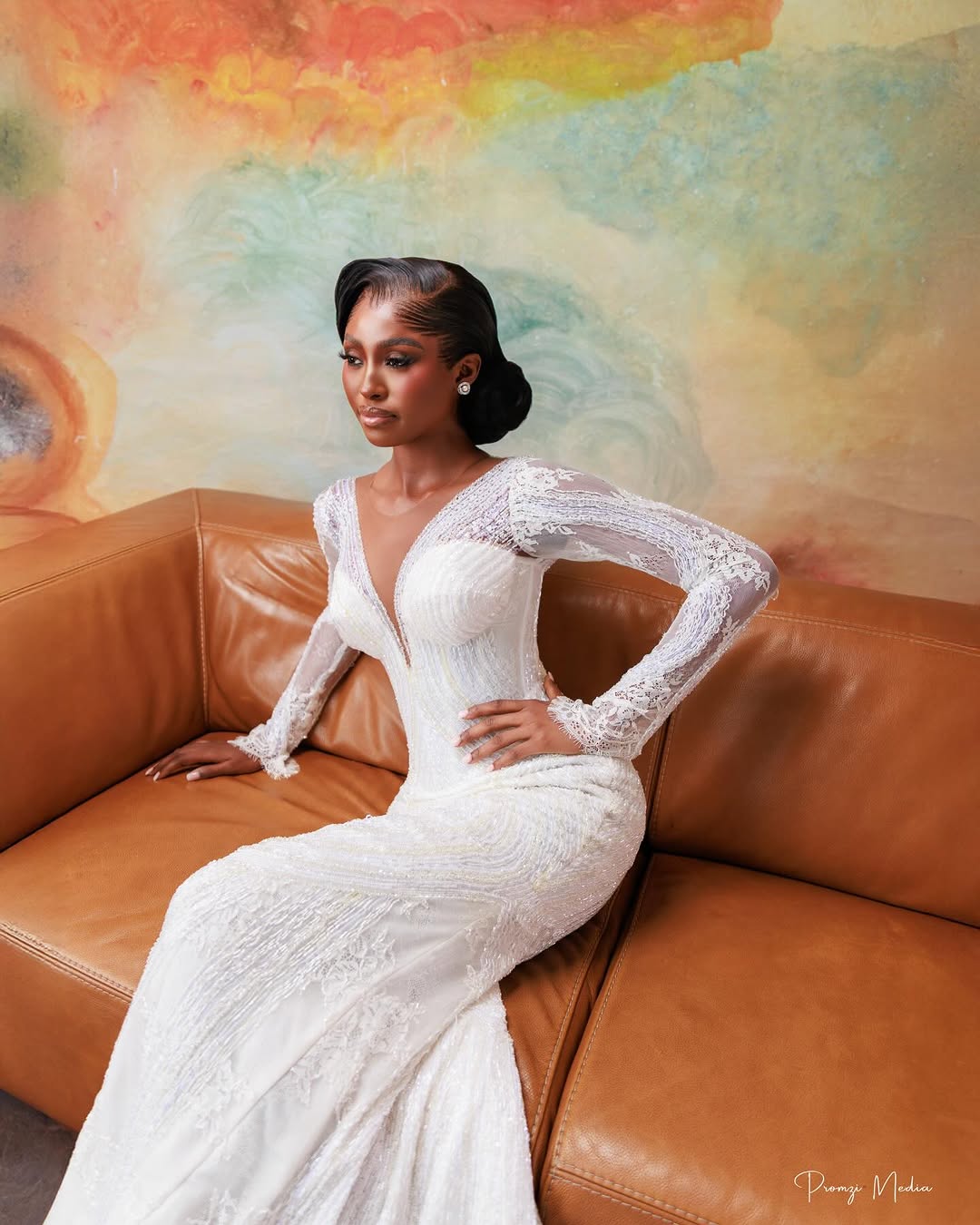 Pearls Bridals created magic with this stunning white wedding dress, and we must say it’s such a beauty to behold. From the lace long-sleeves to the deep-plunging V-neckline, heavily beaded silhouette, this look evokes goddess-level beauty. It’s completely divine! The makeup is a striking one, featuring smoky eyes, dominant pink blush, and a glowy-nude finish— all kudos to Revvys Beauty. To add an even more elegant touch to this stunning ensemble, Styled by Essa crafted a sleek side-swept bun hairdo with no stray strands in sight. This look will definitely have all eyes on you, with reverence and admiration. It’s elegant, timeless and just what a sophisticated bride needs to elevate her special day slay to greater heights.