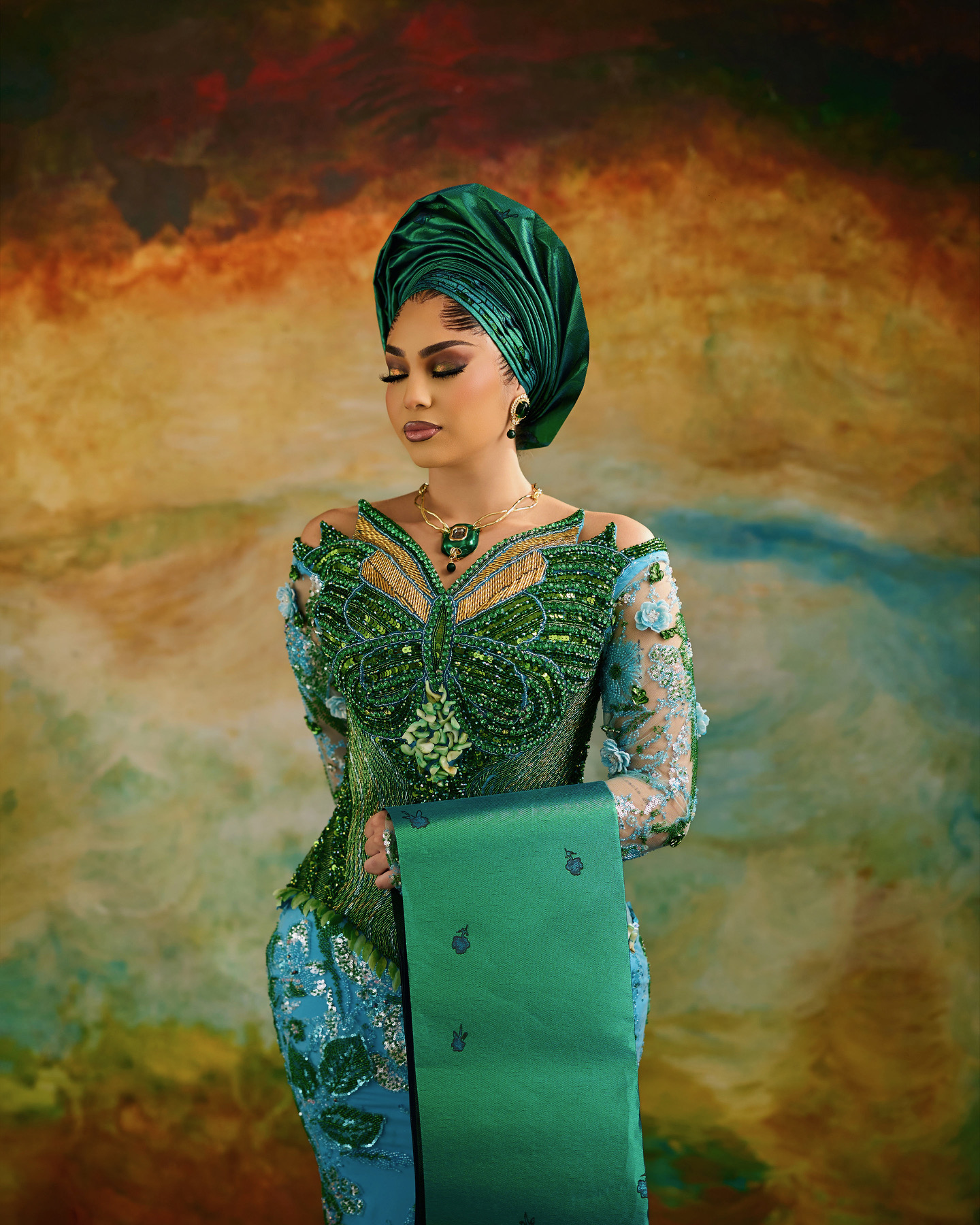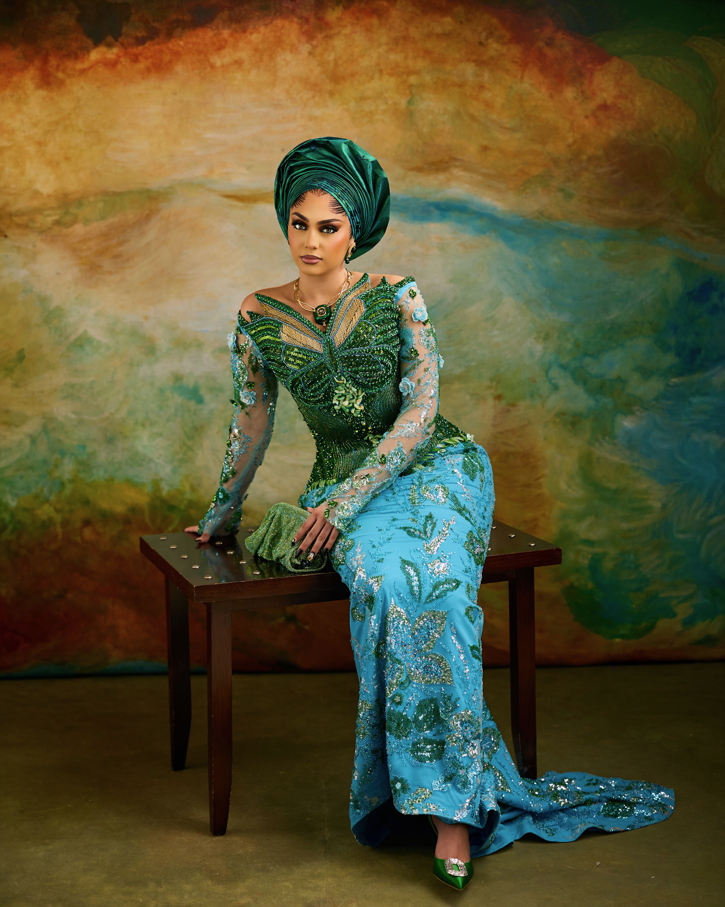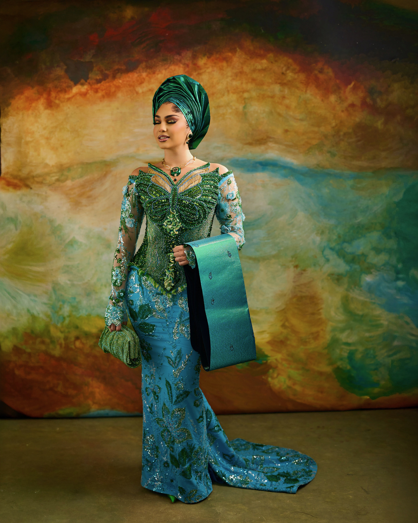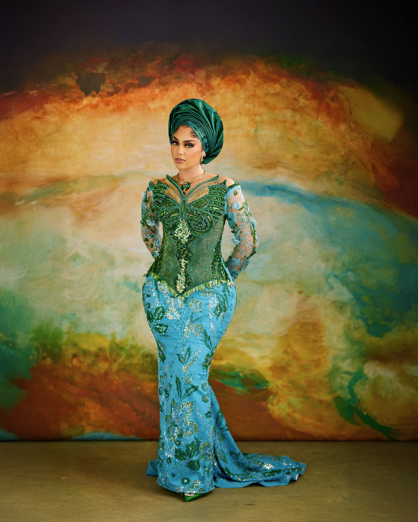 To that effect, here’s a truly exquisite Yoruba traditional bridal look designed by Styled by Cellas that seems so unreal because it’s so gorgeous! The green bodice is layered with intricate beading and a butterfly-patterned centre. The sleeves are embroidered with floral designs, and the blue skirt is also covered in beads. Absolutely breathtaking! Now let’s talk about this makeup; bold, captivating and radiant, all kudos to Oteniara Makeovers. To complete this look with cultural elegance, Demmy Gele stepped in and pleated a perfect sego gele. We are absolutely in awe of this magnificent look as it’s one truly fit for queens. You can also find more beauty looks here.