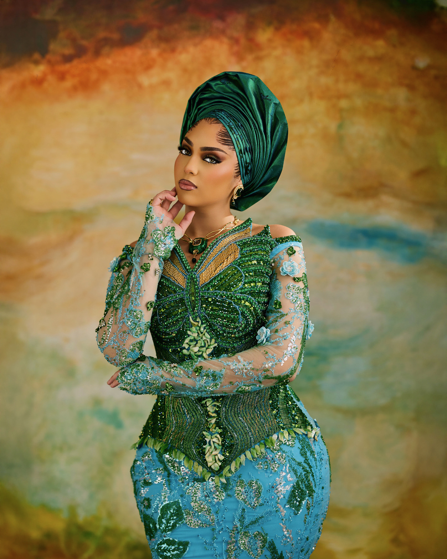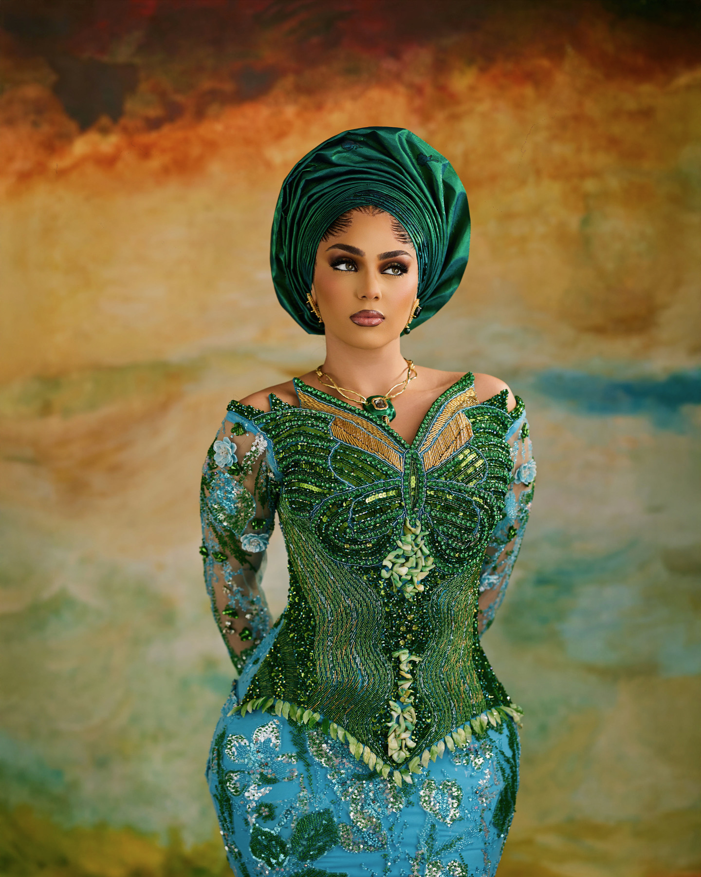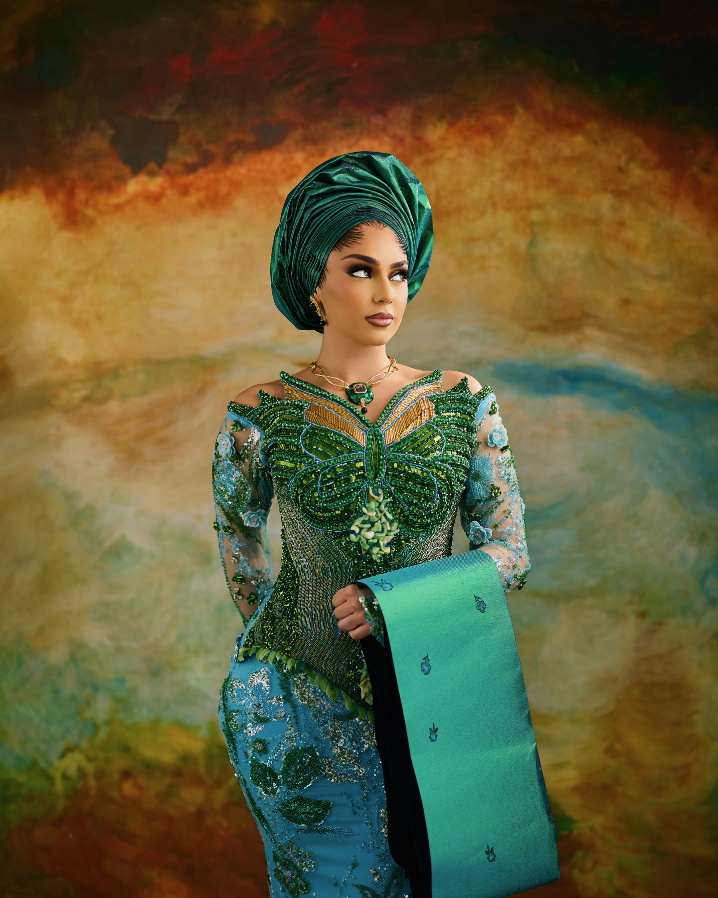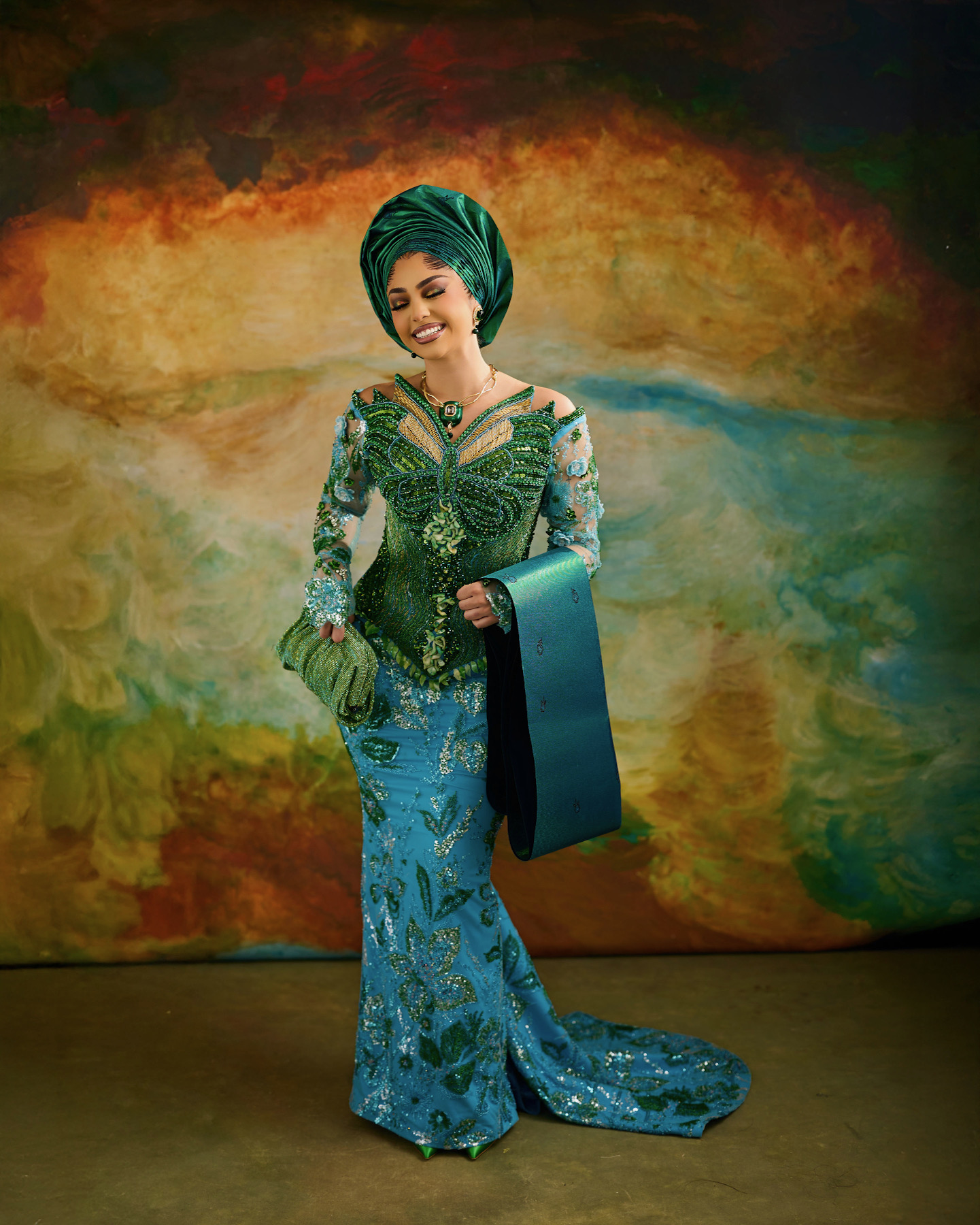 To that effect, here’s a truly exquisite Yoruba traditional bridal look designed by Styled by Cellas that seems so unreal because it’s so gorgeous! The green bodice is layered with intricate beading and a butterfly-patterned centre. The sleeves are embroidered with floral designs, and the blue skirt is also covered in beads. Absolutely breathtaking! Now let’s talk about this makeup; bold, captivating and radiant, all kudos to Oteniara Makeovers. To complete this look with cultural elegance, Demmy Gele stepped in and pleated a perfect sego gele. We are absolutely in awe of this magnificent look as it’s one truly fit for queens. You can also find more beauty looks here.