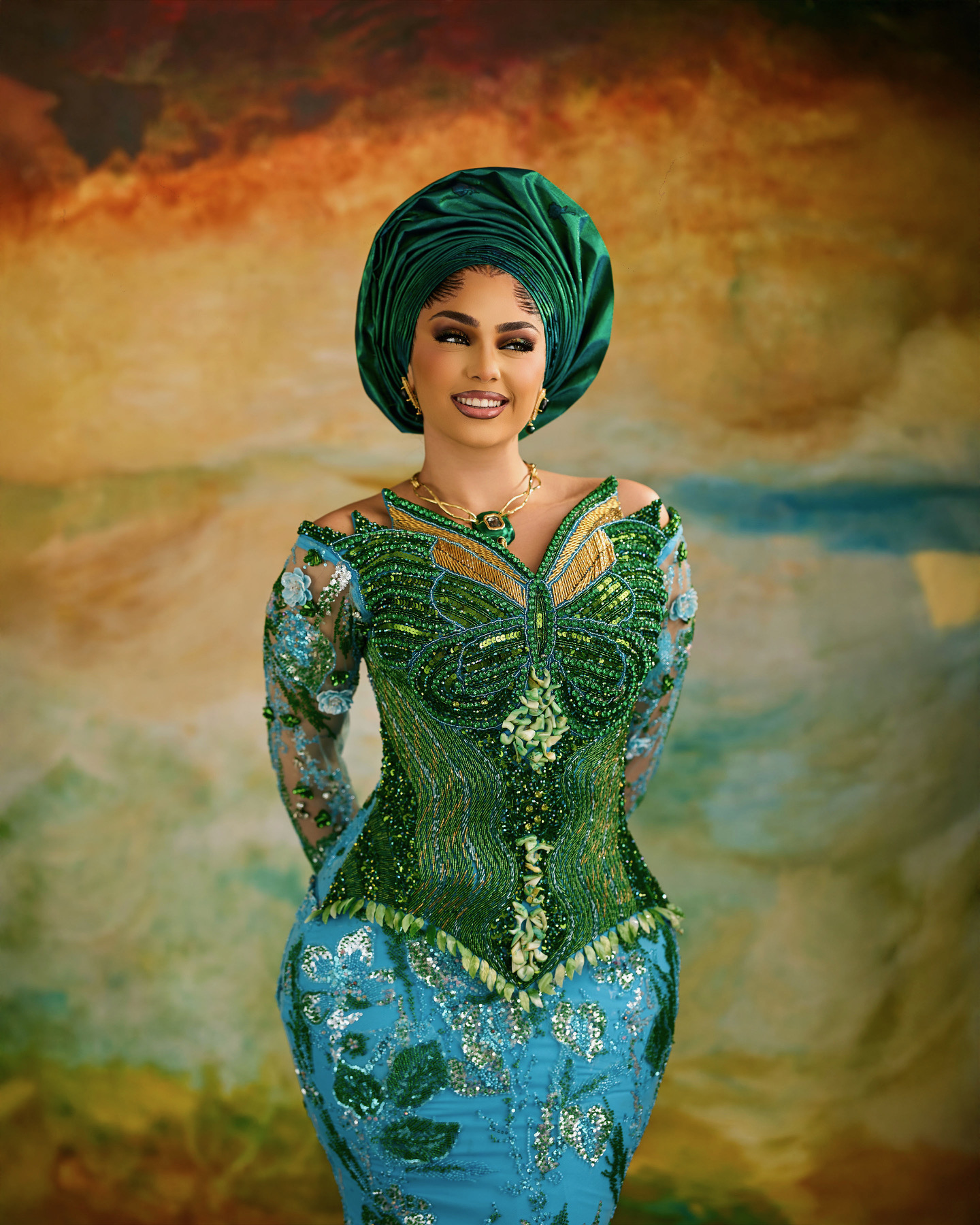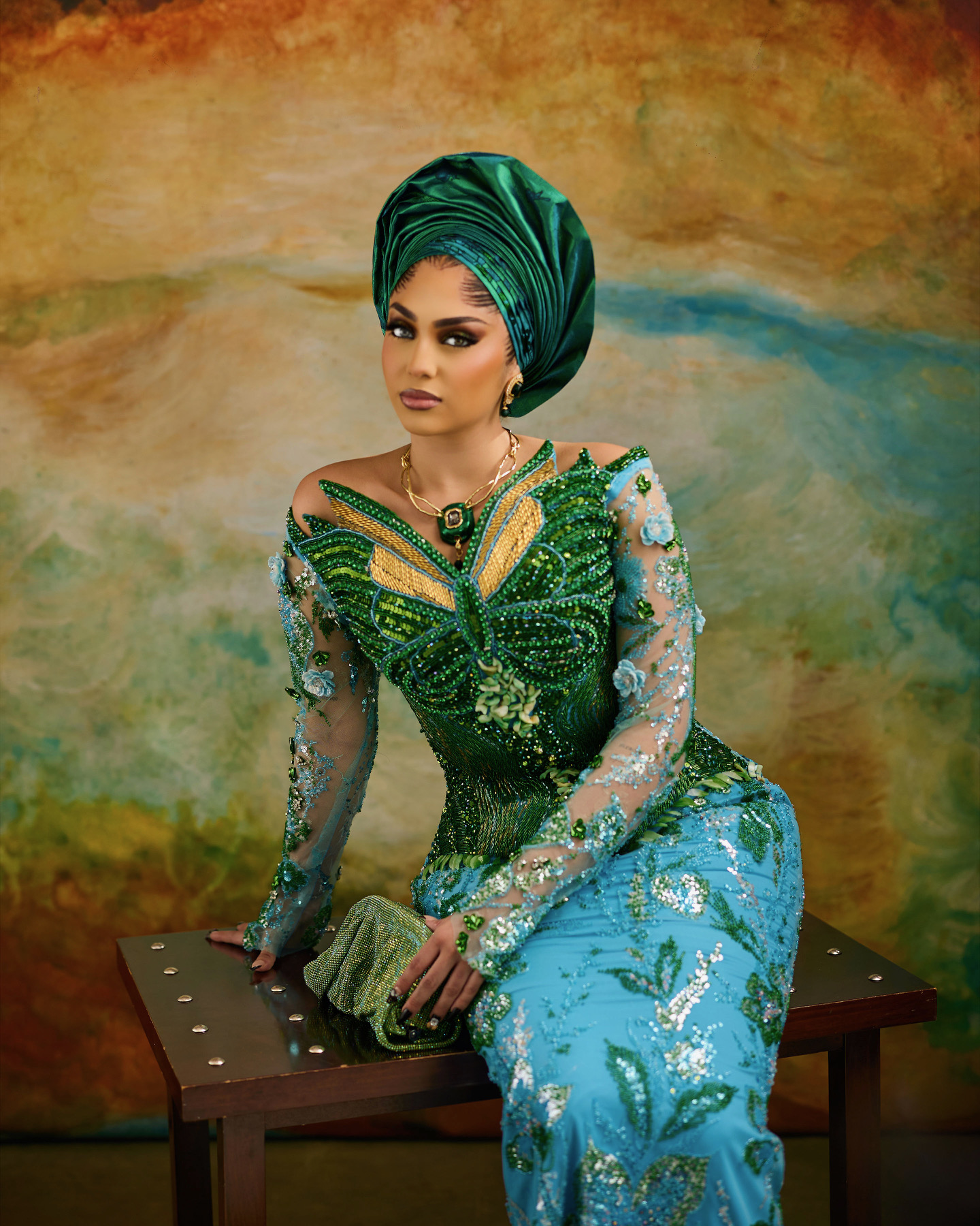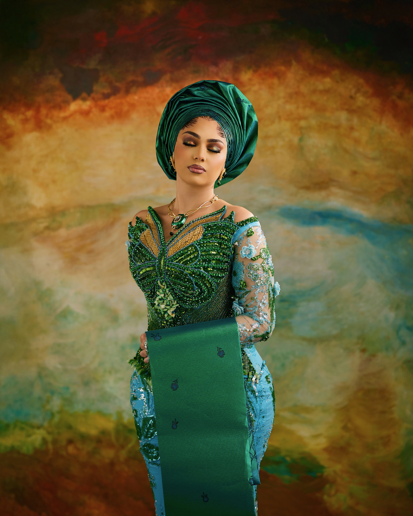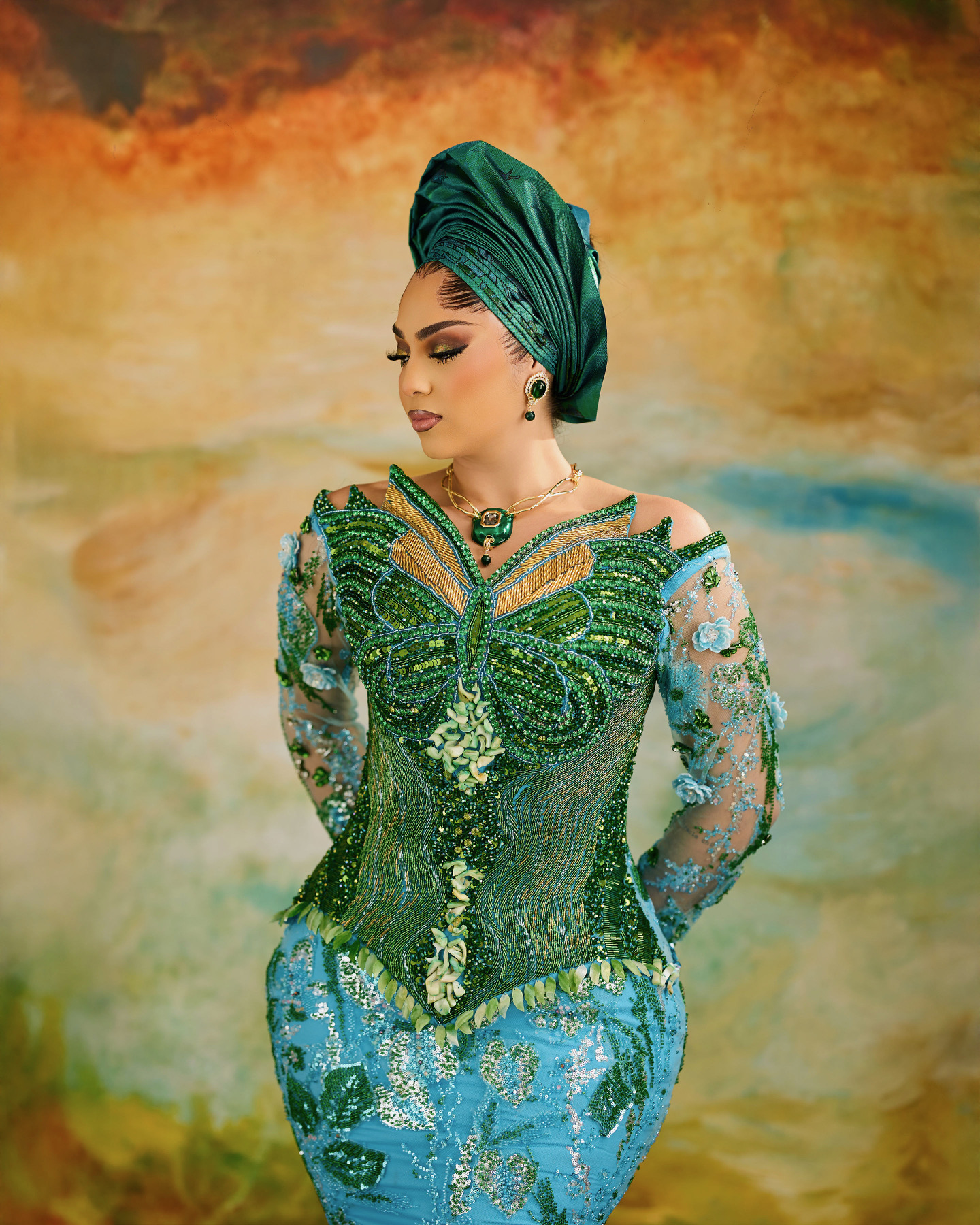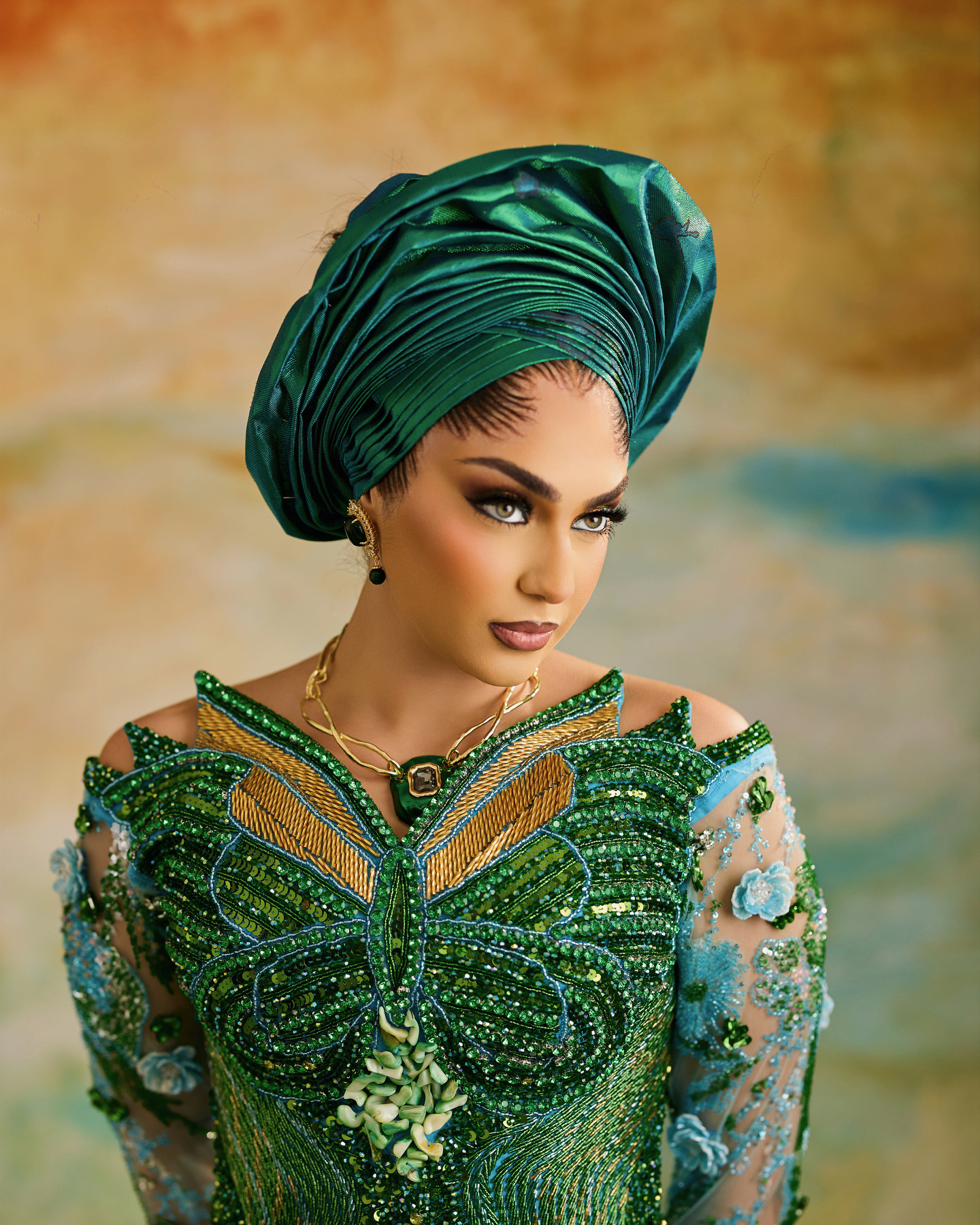 To that effect, here’s a truly exquisite Yoruba traditional bridal look designed by Styled by Cellas that seems so unreal because it’s so gorgeous! The green bodice is layered with intricate beading and a butterfly-patterned centre. The sleeves are embroidered with floral designs, and the blue skirt is also covered in beads. Absolutely breathtaking! Now let’s talk about this makeup; bold, captivating and radiant, all kudos to Oteniara Makeovers. To complete this look with cultural elegance, Demmy Gele stepped in and pleated a perfect sego gele. We are absolutely in awe of this magnificent look as it’s one truly fit for queens. You can also find more beauty looks here.