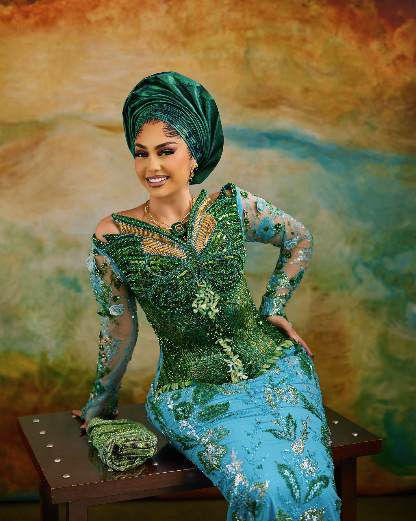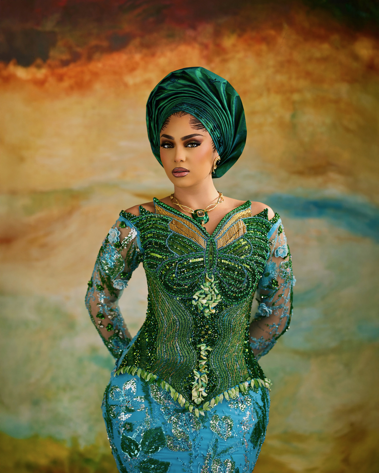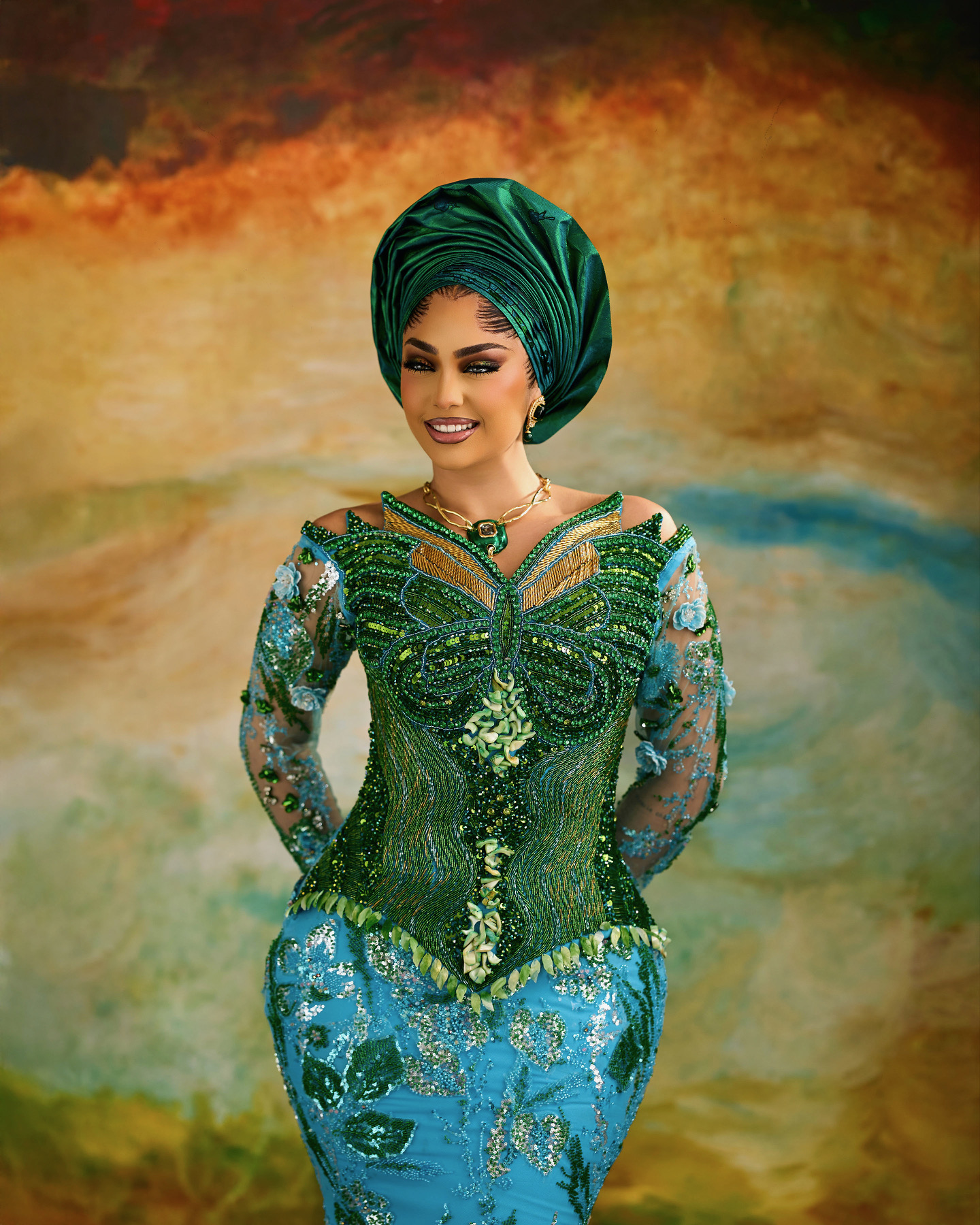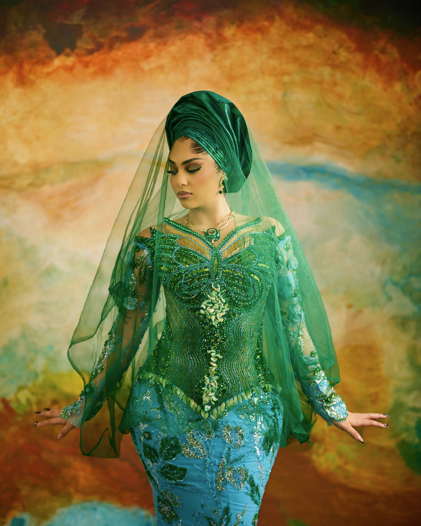 To that effect, here’s a truly exquisite Yoruba traditional bridal look designed by Styled by Cellas that seems so unreal because it’s so gorgeous! The green bodice is layered with intricate beading and a butterfly-patterned centre. The sleeves are embroidered with floral designs, and the blue skirt is also covered in beads. Absolutely breathtaking! Now let’s talk about this makeup; bold, captivating and radiant, all kudos to Oteniara Makeovers. To complete this look with cultural elegance, Demmy Gele stepped in and pleated a perfect sego gele. We are absolutely in awe of this magnificent look as it’s one truly fit for queens. You can also find more beauty looks here.