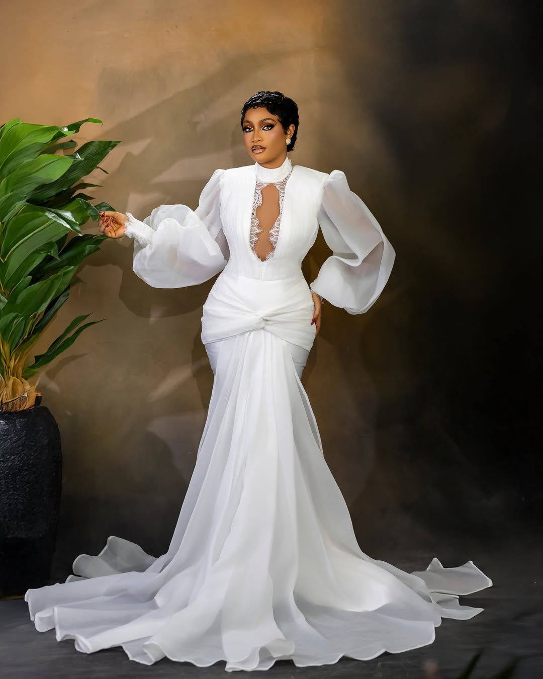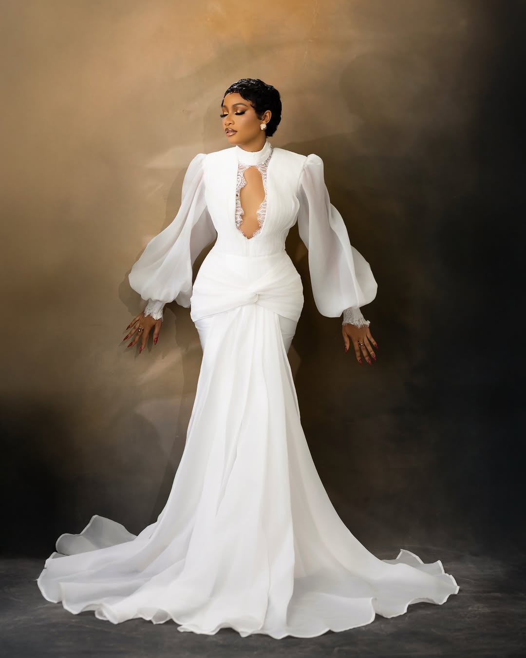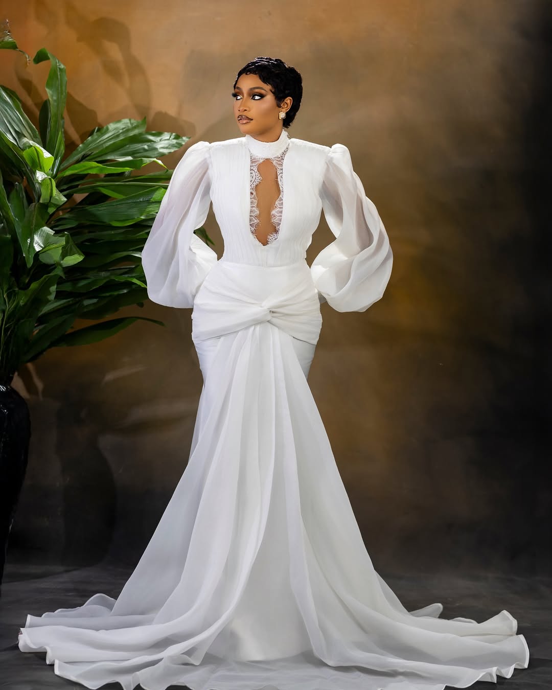 Here we have this breathtaking dress designed by Zarah D Lumiere, and we’re totally captivated by its stunning charm. Featuring a high neckline, a bodice with a deep-cutout centre, puffy sleeves and a flowing wrap on the skirt, this look is enchanting! Vinest Makeup perfected the striking glam featuring smoky, shimmery eyes, nude lips and statement contact lenses, adding a charming effect. This look calls for everything exceptional, and Dave Stylez definitely understood the assignment with this beautiful pixie hairstyle. One look at this ensemble and you can tell it’s a trailblazing bride’s dream come true! You can also find more beauty looks here.