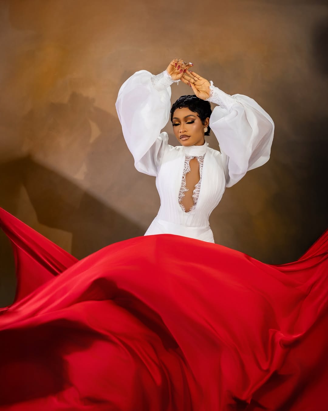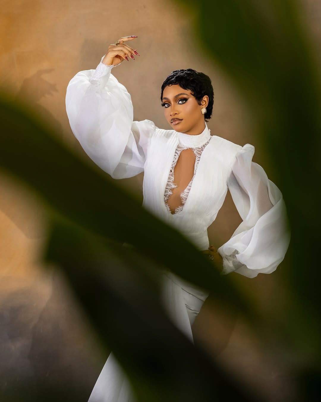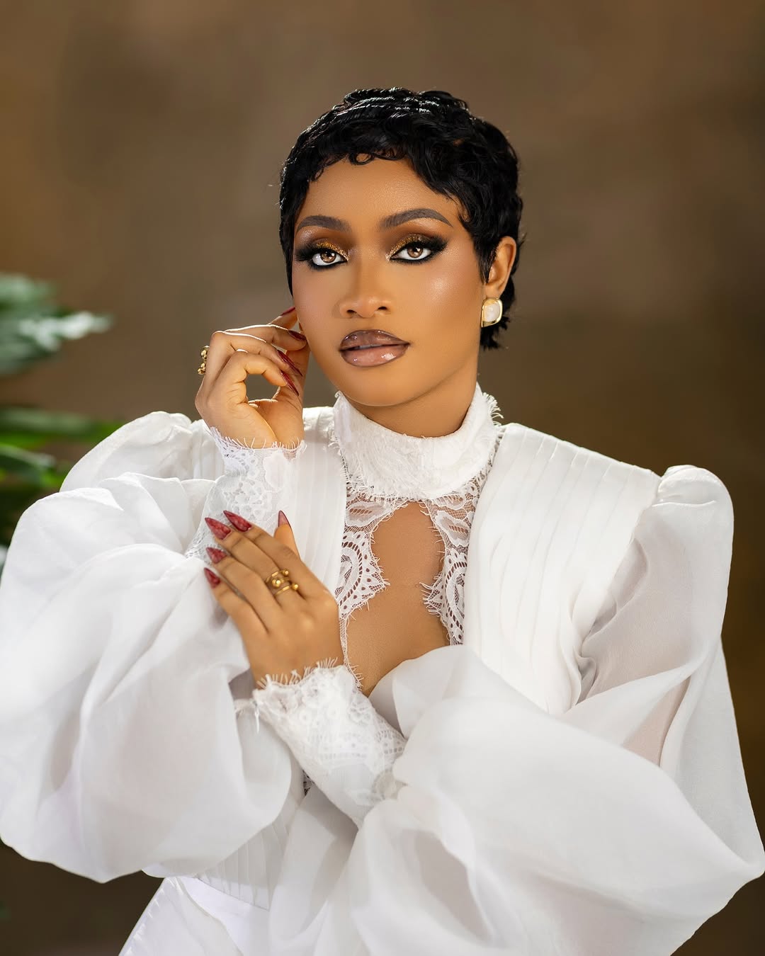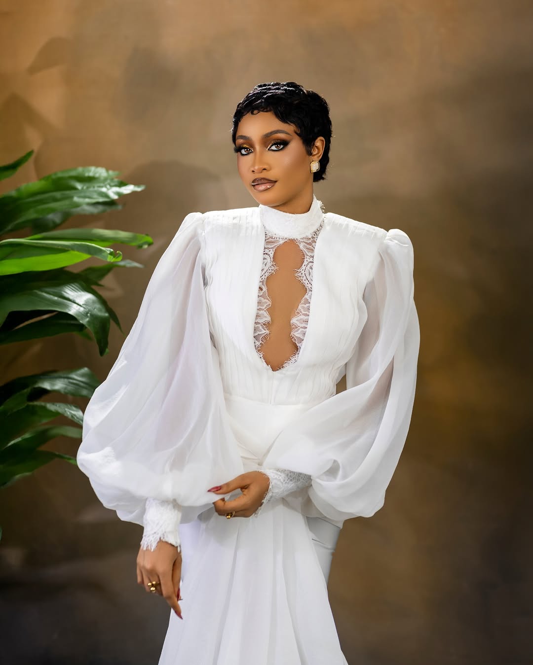 Here we have this breathtaking dress designed by Zarah D Lumiere, and we’re totally captivated by its stunning charm. Featuring a high neckline, a bodice with a deep-cutout centre, puffy sleeves and a flowing wrap on the skirt, this look is enchanting! Vinest Makeup perfected the striking glam featuring smoky, shimmery eyes, nude lips and statement contact lenses, adding a charming effect. This look calls for everything exceptional, and Dave Stylez definitely understood the assignment with this beautiful pixie hairstyle. One look at this ensemble and you can tell it’s a trailblazing bride’s dream come true! You can also find more beauty looks here.
